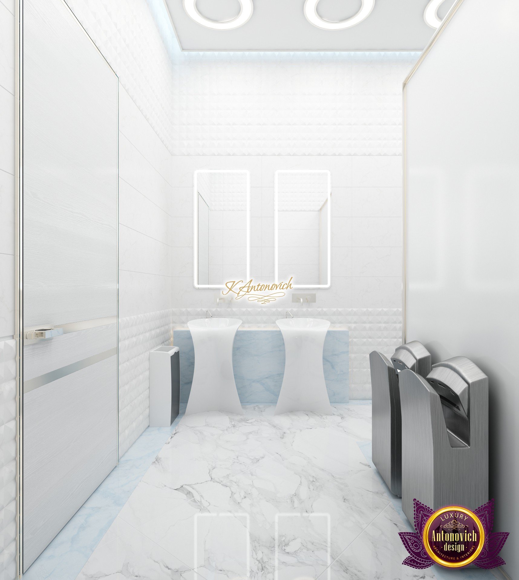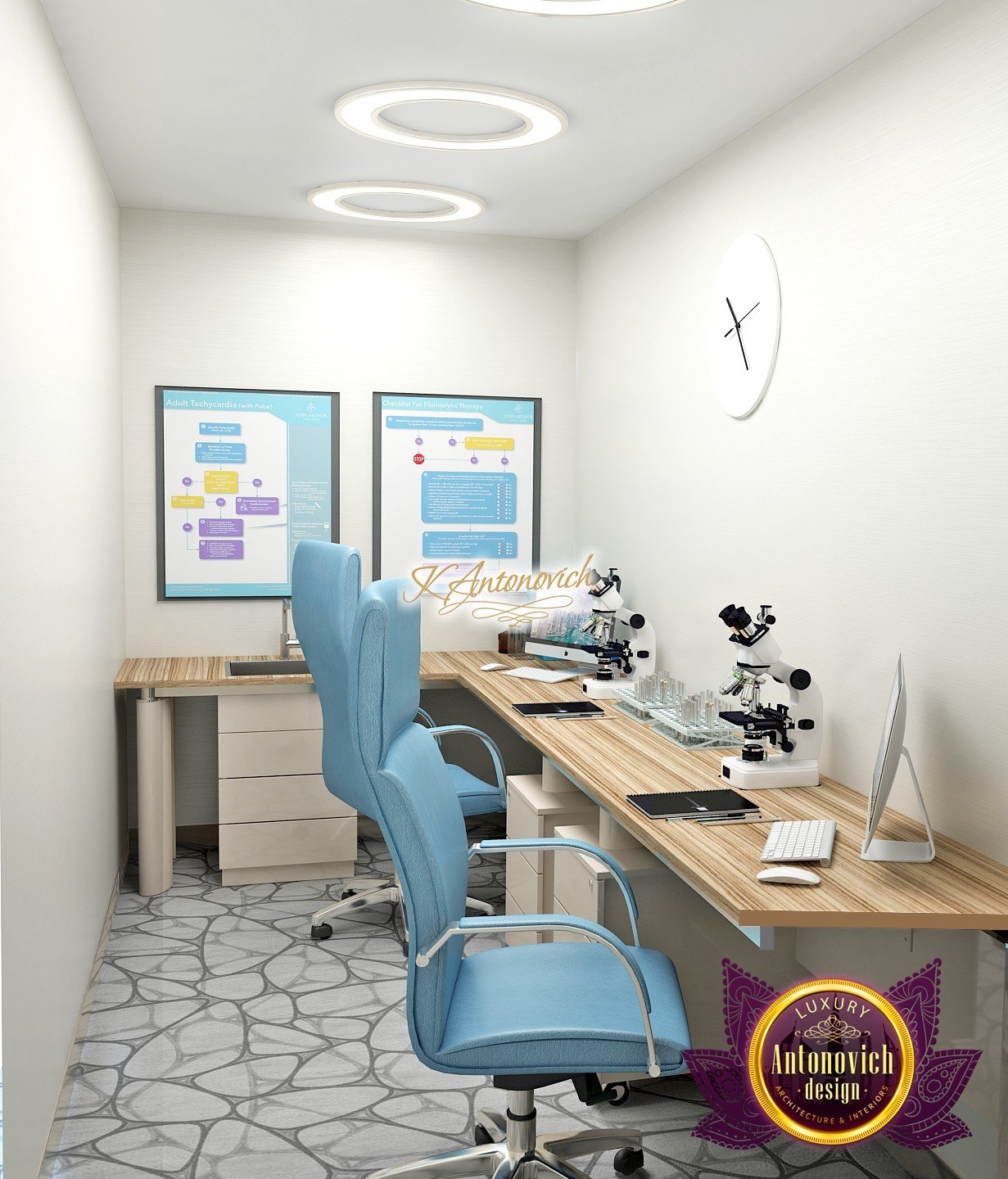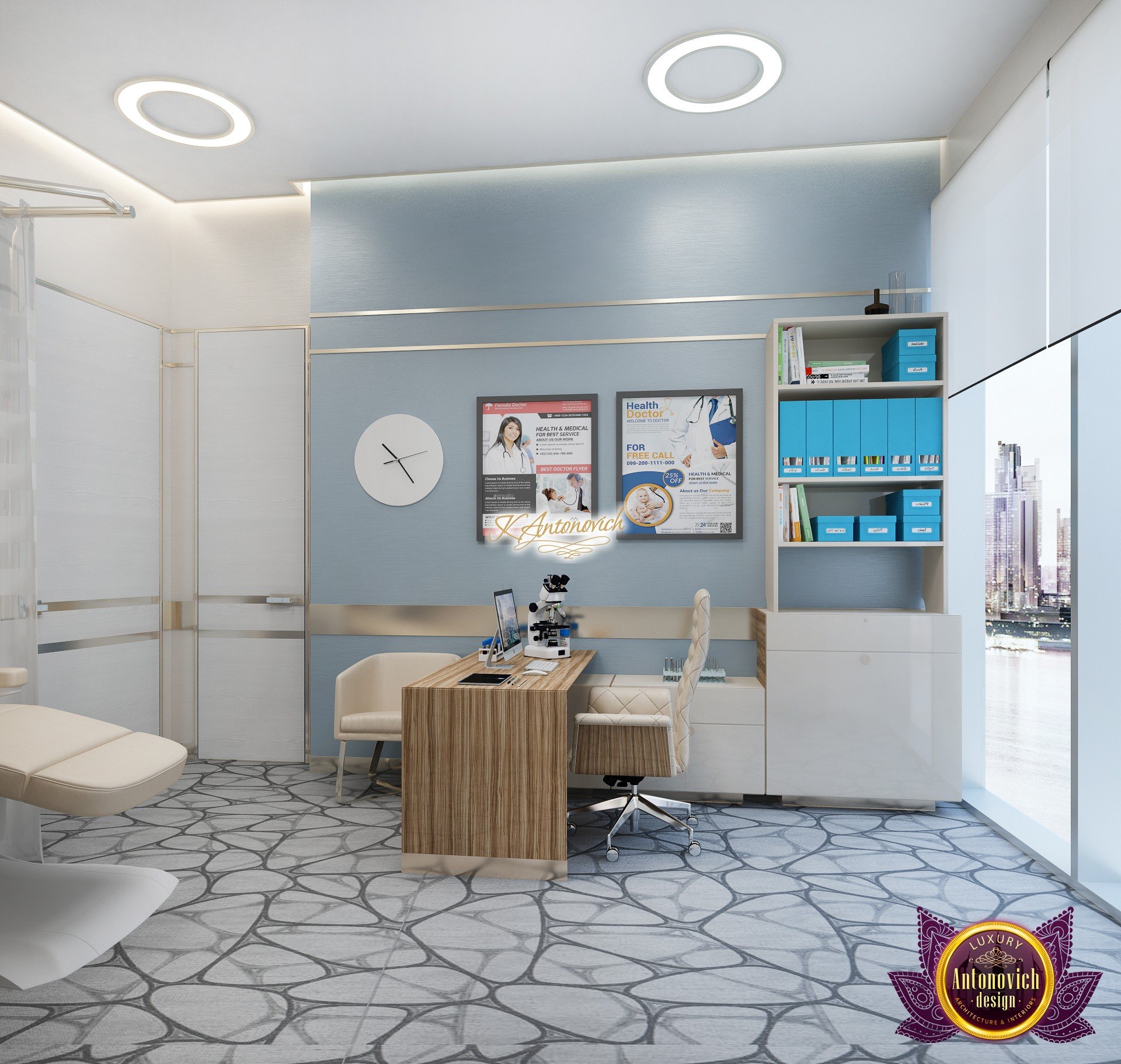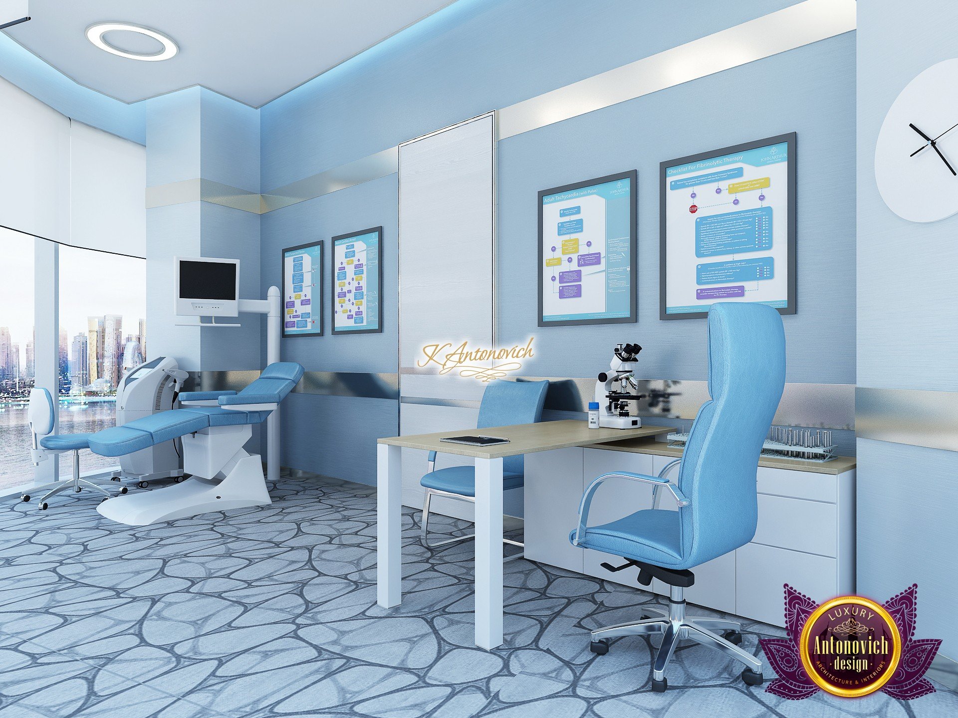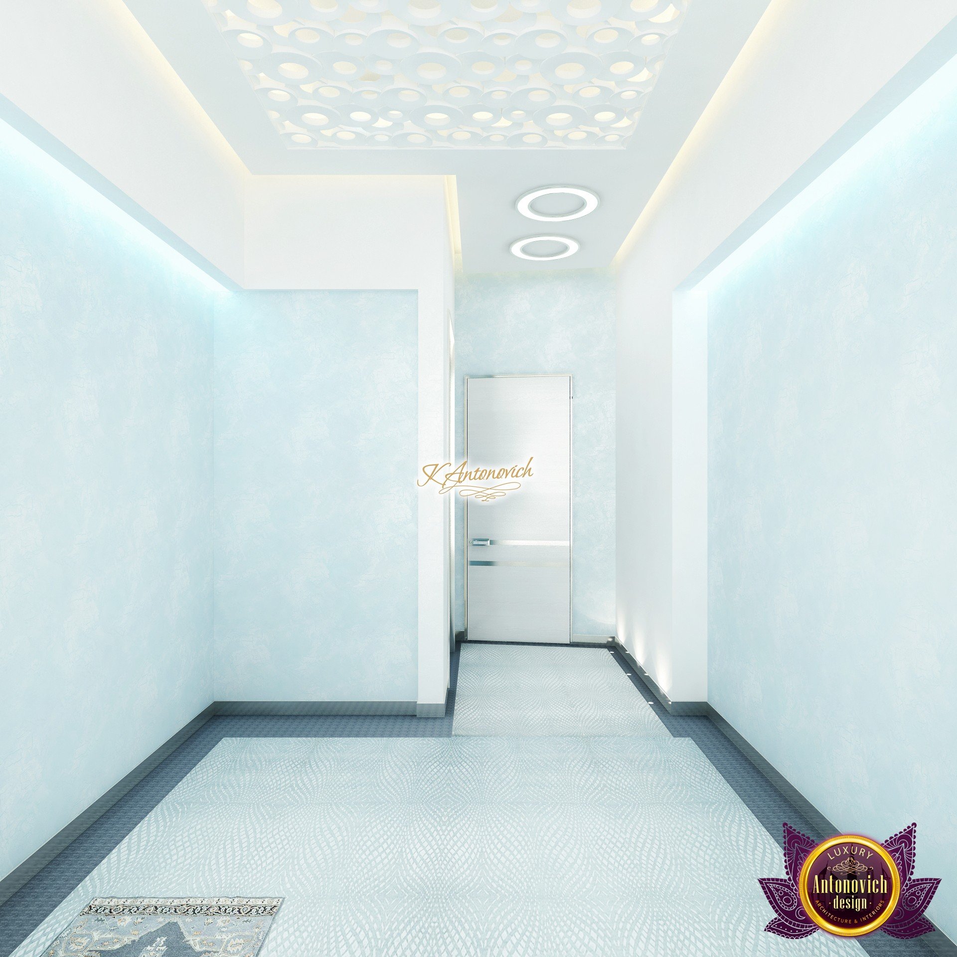 В основе проекта — дизайн частной клиники в современном стиле. Такой подход подчёркивает дизайн клиники и задаёт нужное настроение для процедур. Дизайнеры интерьера студии «Антонович Дизайн (Antonovich Design)» создали образ лёгкого и комфортного пространства, в котором ощущается эстетическое удовольствие. Этот интерьер настраивает каждого посетителя на правильное восприятие пространства и задаёт необходимое настроение для процедур. Концепция проекта имеет уникальные черты. Стены и полы облицованы белым итальянским мрамором, а приемная клиники из итальянского мрамора подчёркивает премиальность проекта. Универсальность отделки стен дополняют объёмные 3d панели для стен клиники с волнистым орнаментом в серебристых тонах, что подчёркивает дизайн интерьера косметологической клиники. С тем же текстурным решением оформлена красивая зона ресепшн. Реализация проекта интерьера клиники под ключ всегда основывается на чёткости в подборе материалов. Просторный холл разделён на несколько зон для отдыха — зонирование пространства в клинике выполнено. Для этого использованы потолочный декор и оригинальные перегородки. В интерьере доминирует светлая палитра холодных оттенков от белого до мягкого голубого, создавая светлый интерьер клиники премиум. Дизайн помещений стал источником абсолютного комфорта как для клиентов клиники, так и для сотрудников — интерьер клиники для комфортных процедур обеспечен продуманной планировкой. Чтобы дополнить атмосферу тёплыми природными нотами, авторы предложили вертикальное озеленение стен клиники. Запрос на уютный интерьер для сотрудников клиники учитывался при планировке. Подбор материалов для дизайна клиники основан на ясном понимании используемых фактур. Дизайн интерьера косметологической клиники от нашей студии — переплетение продуманных дизайнерских идей и инноваций.