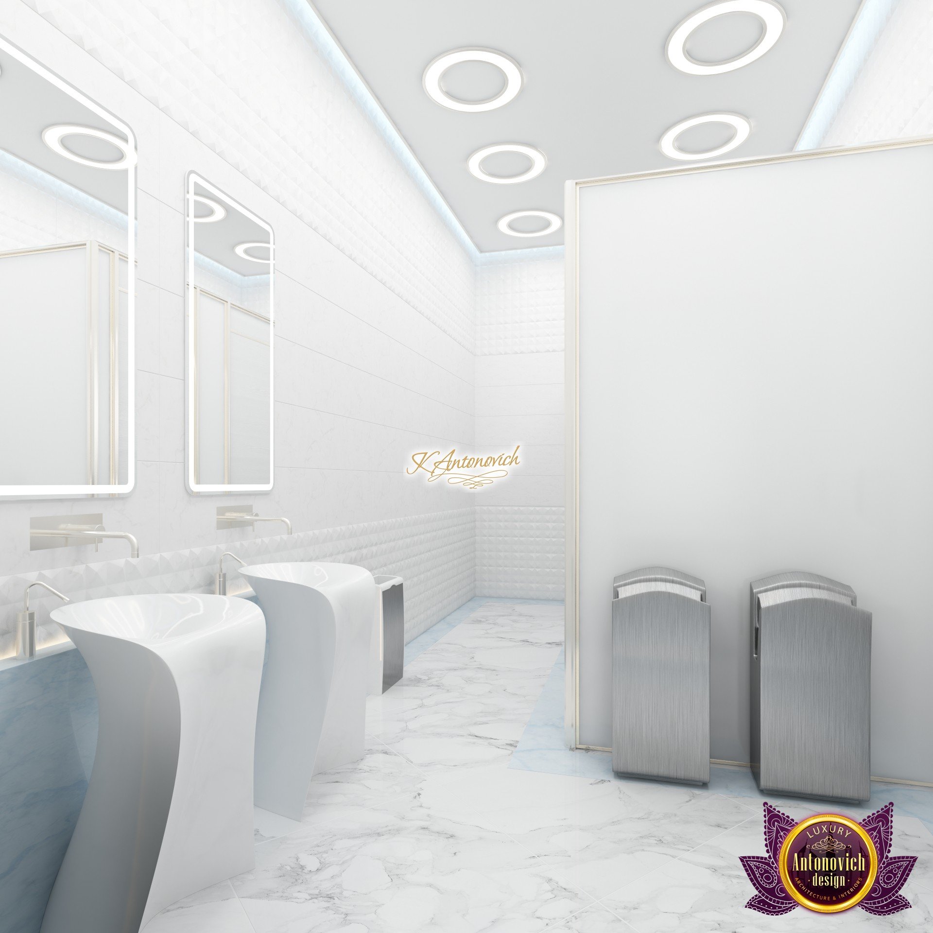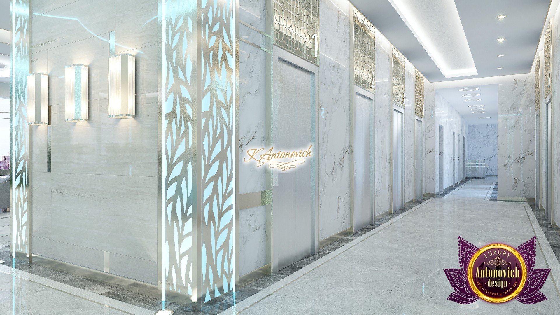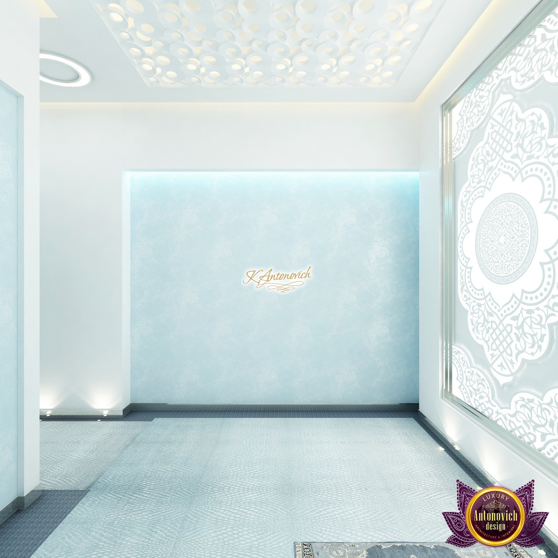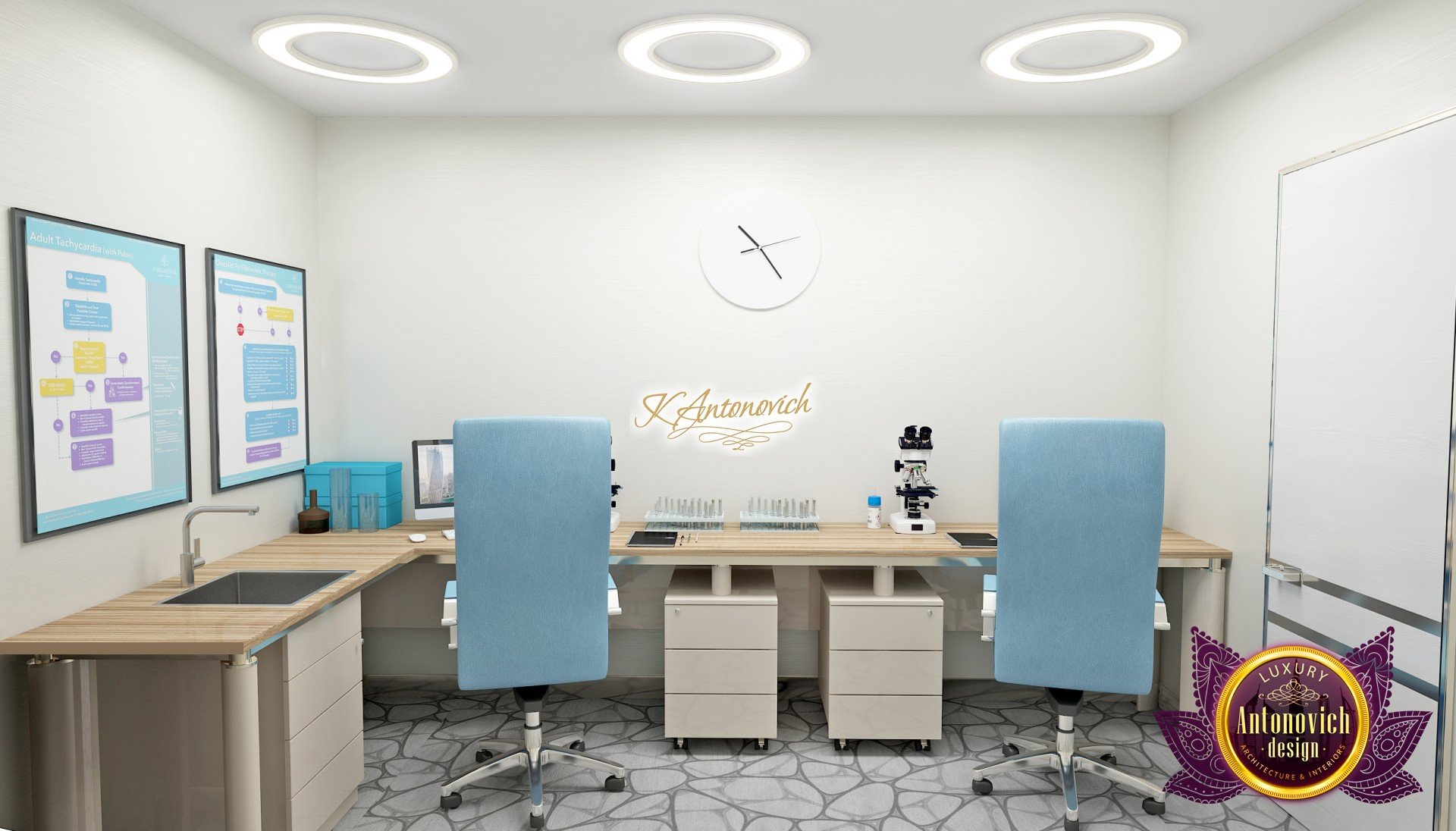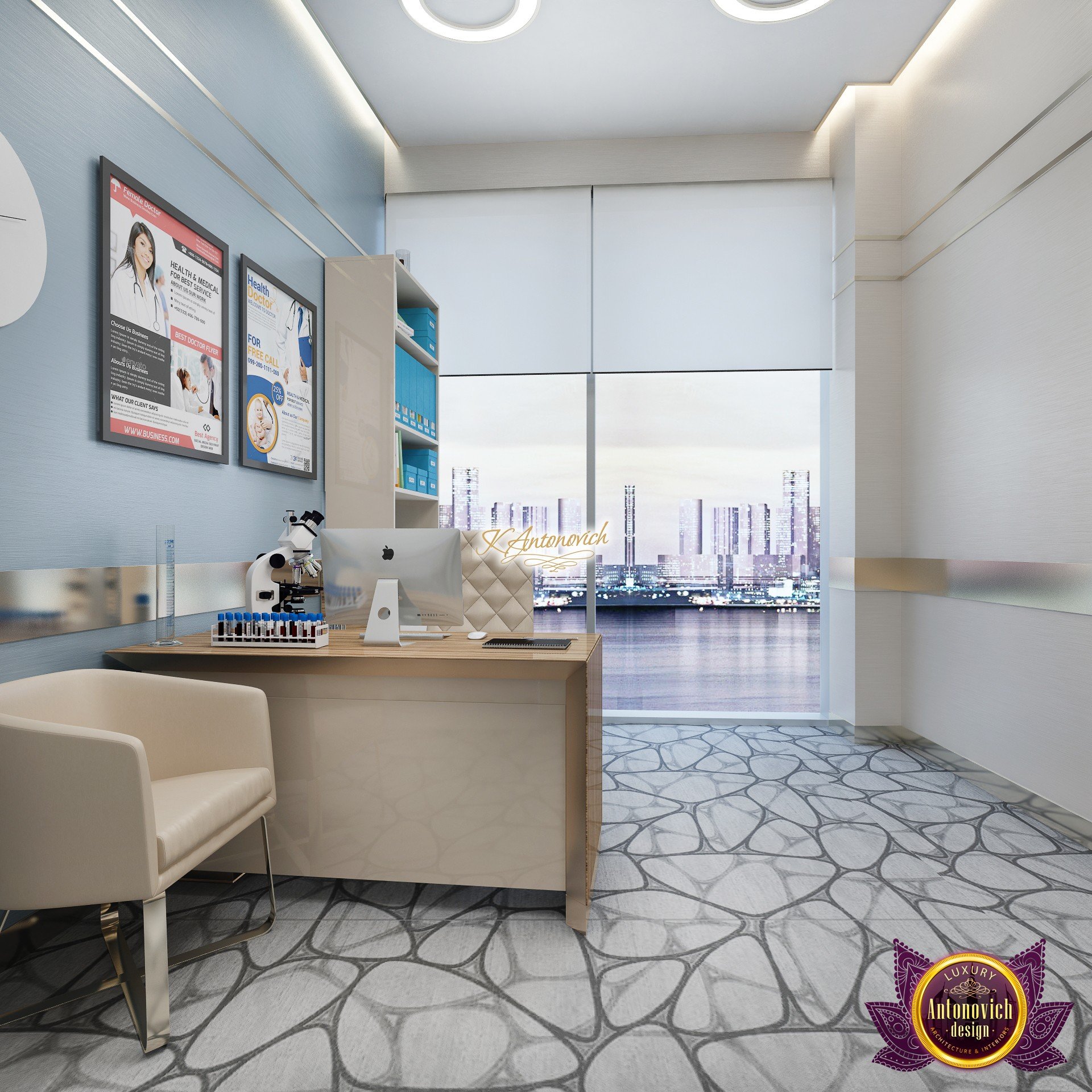В основе проекта — дизайн частной клиники в современном стиле. Такой подход подчёркивает дизайн клиники и задаёт нужное настроение для процедур. Дизайнеры интерьера студии «Антонович Дизайн (Antonovich Design)» создали образ лёгкого и комфортного пространства, в котором ощущается эстетическое удовольствие. Этот интерьер настраивает каждого посетителя на правильное восприятие пространства и задаёт необходимое настроение для процедур. Концепция проекта имеет уникальные черты. Стены и полы облицованы белым итальянским мрамором, а приемная клиники из итальянского мрамора подчёркивает премиальность проекта. Универсальность отделки стен дополняют объёмные 3d панели для стен клиники с волнистым орнаментом в серебристых тонах, что подчёркивает дизайн интерьера косметологической клиники. С тем же текстурным решением оформлена красивая зона ресепшн. Реализация проекта интерьера клиники под ключ всегда основывается на чёткости в подборе материалов. Просторный холл разделён на несколько зон для отдыха — зонирование пространства в клинике выполнено. Для этого использованы потолочный декор и оригинальные перегородки. В интерьере доминирует светлая палитра холодных оттенков от белого до мягкого голубого, создавая светлый интерьер клиники премиум. Дизайн помещений стал источником абсолютного комфорта как для клиентов клиники, так и для сотрудников — интерьер клиники для комфортных процедур обеспечен продуманной планировкой. Чтобы дополнить атмосферу тёплыми природными нотами, авторы предложили вертикальное озеленение стен клиники. Запрос на уютный интерьер для сотрудников клиники учитывался при планировке. Подбор материалов для дизайна клиники основан на ясном понимании используемых фактур. Дизайн интерьера косметологической клиники от нашей студии — переплетение продуманных дизайнерских идей и инноваций.