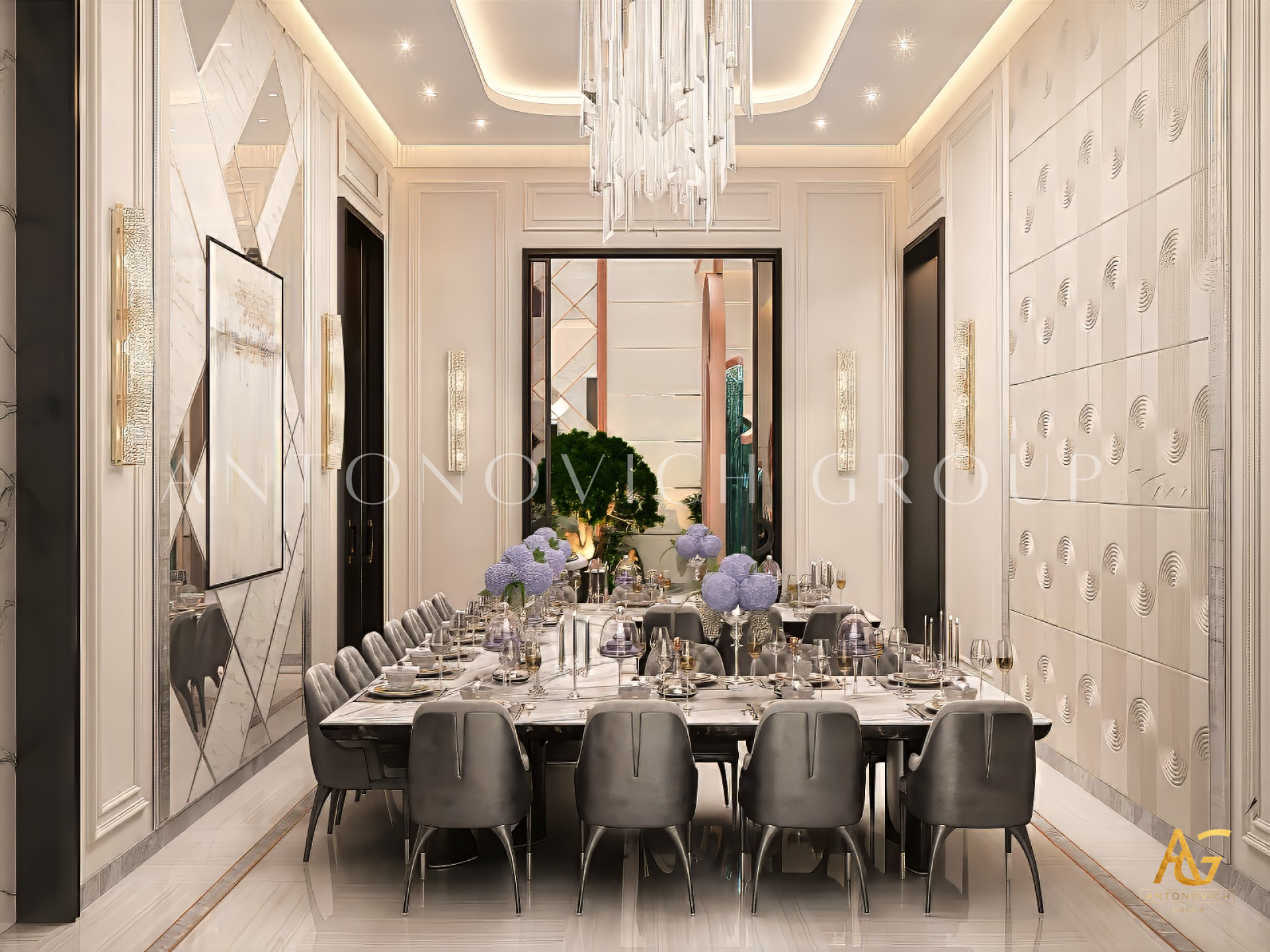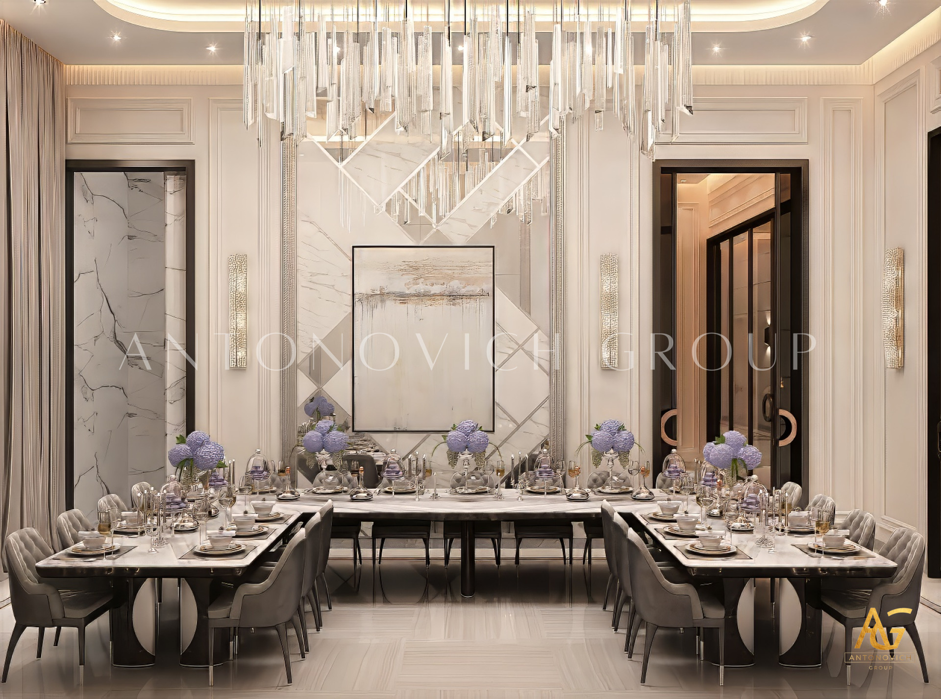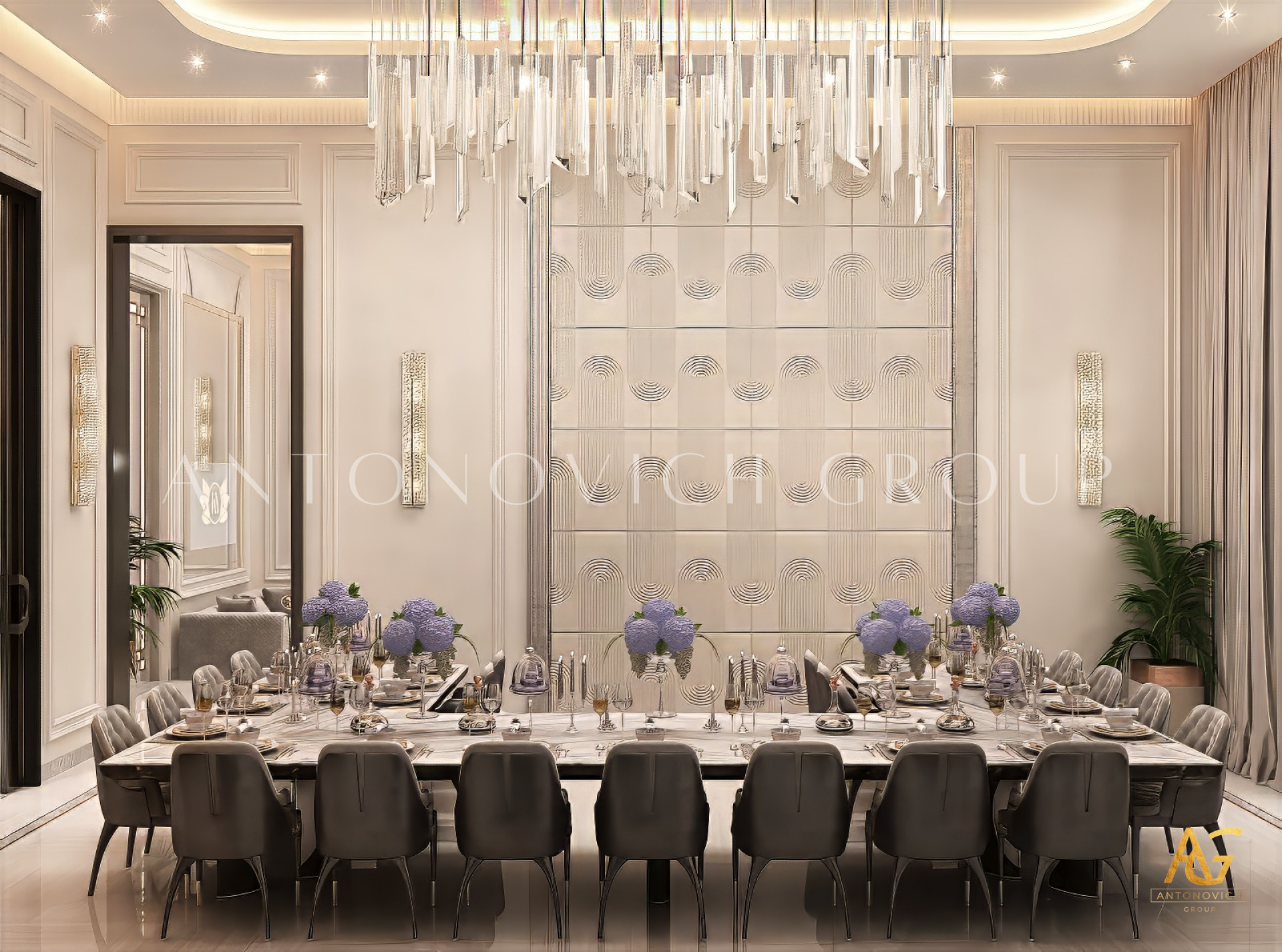 Это один из самых эффективных приёмов, чтобы максимально использовать пространство. Добавьте роскоши — тёмная палитра для столовой внесёт драму и изящество. Выбирайте мебель для столовой, которая сочетается с более светлым покрытием пола: контрастный ковёр для столовой создаёт нужное сопоставление, не делая интерьер давящим. Это работает особенно хорошо, если в вашем современном дизайне столовой светлый пол. Тёмные оттенки, напротив, искажают пространство и визуально уменьшают его. В комнате с синим акцентным фрагментом тёмный чёрный стол, замшевые сиденья, матовая посуда и чёрная креативная люстра выглядят эффектно. Не удивительно, что такой роскошный дизайн столовой становится востребованным.