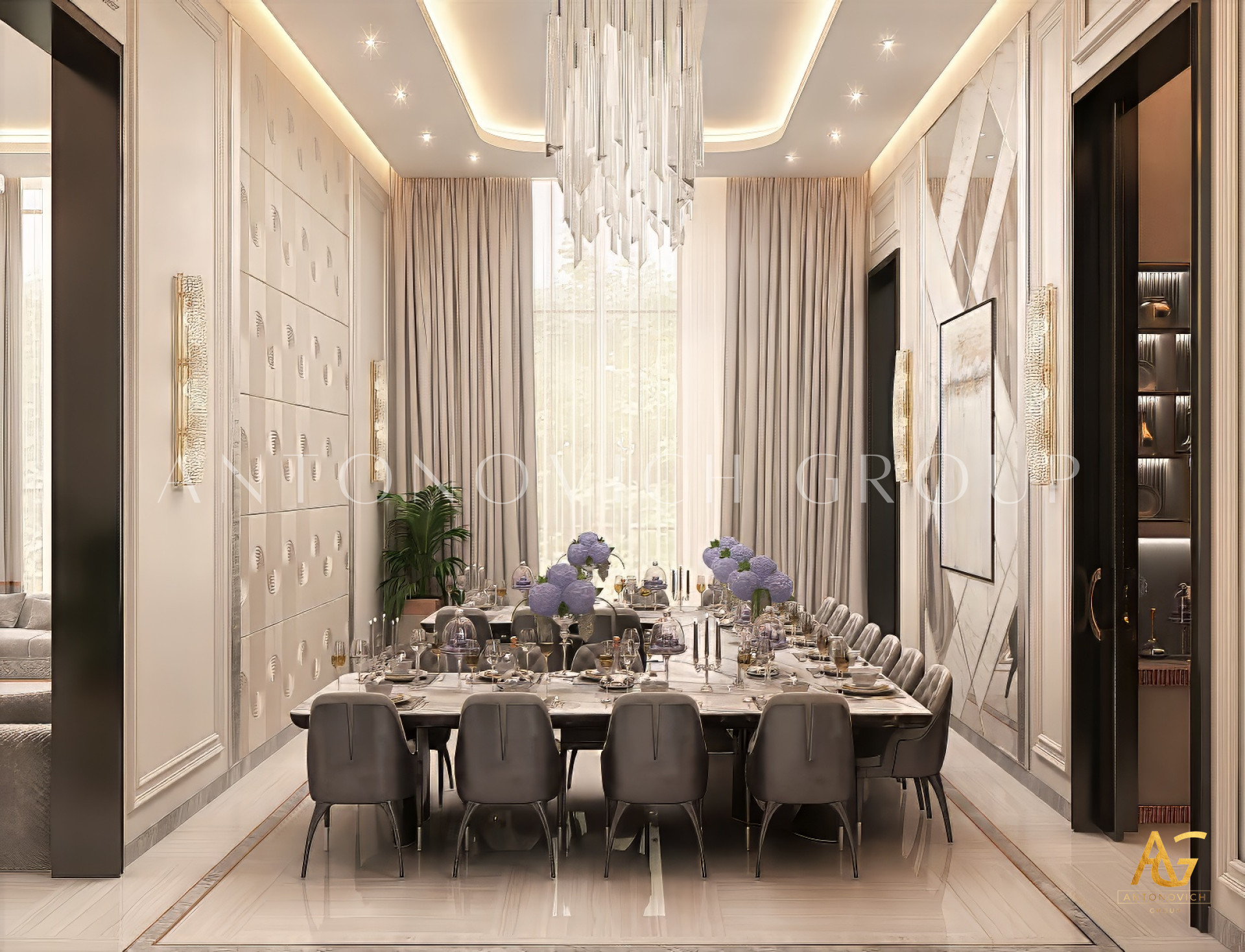 Говорят, что семья, которая ест вместе, остаётся вместе. В результате появился формальный обеденный гарнитур — столовая как место для встреч и общения. Оформление столовой в гостиной сегодня особенно востребовано: с помощью комплектов роскошной мебели и скульптурный светильник для столовой, например, показанный ниже, можно превратить угол гостиной в официальную обеденную зону. Бежевый и чёрный стол выгодно подчёркивает мозаичный источник света. Разместите растения в углах столовой, чтобы создать ощущение оазиса. Барная зона отделена от балкона раздвижной дверью и стеклянной перегородкой.