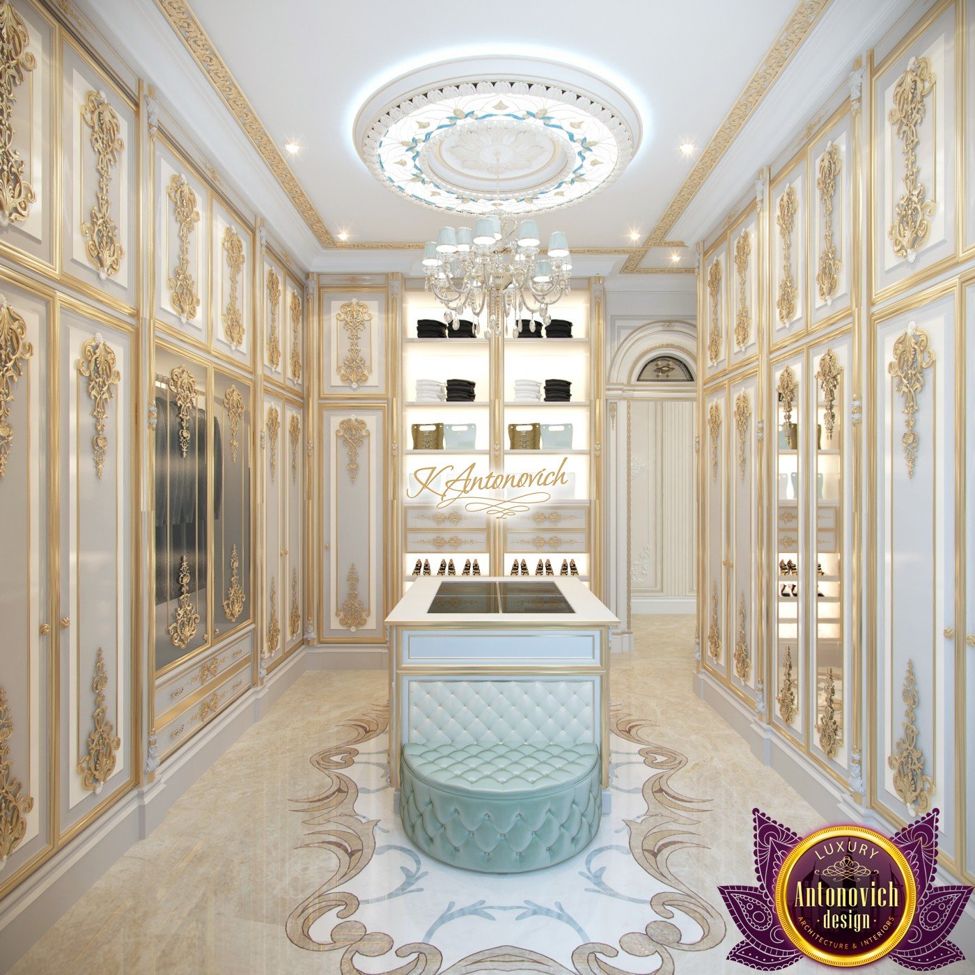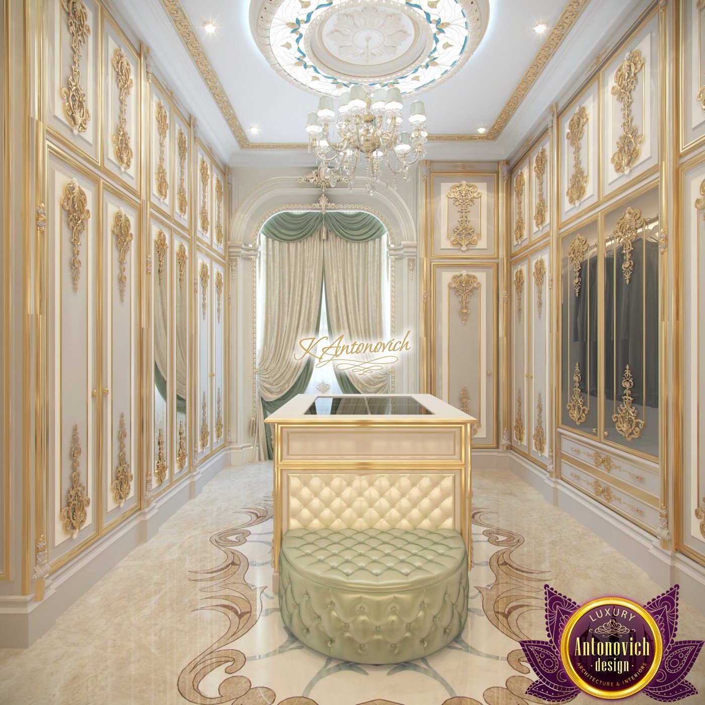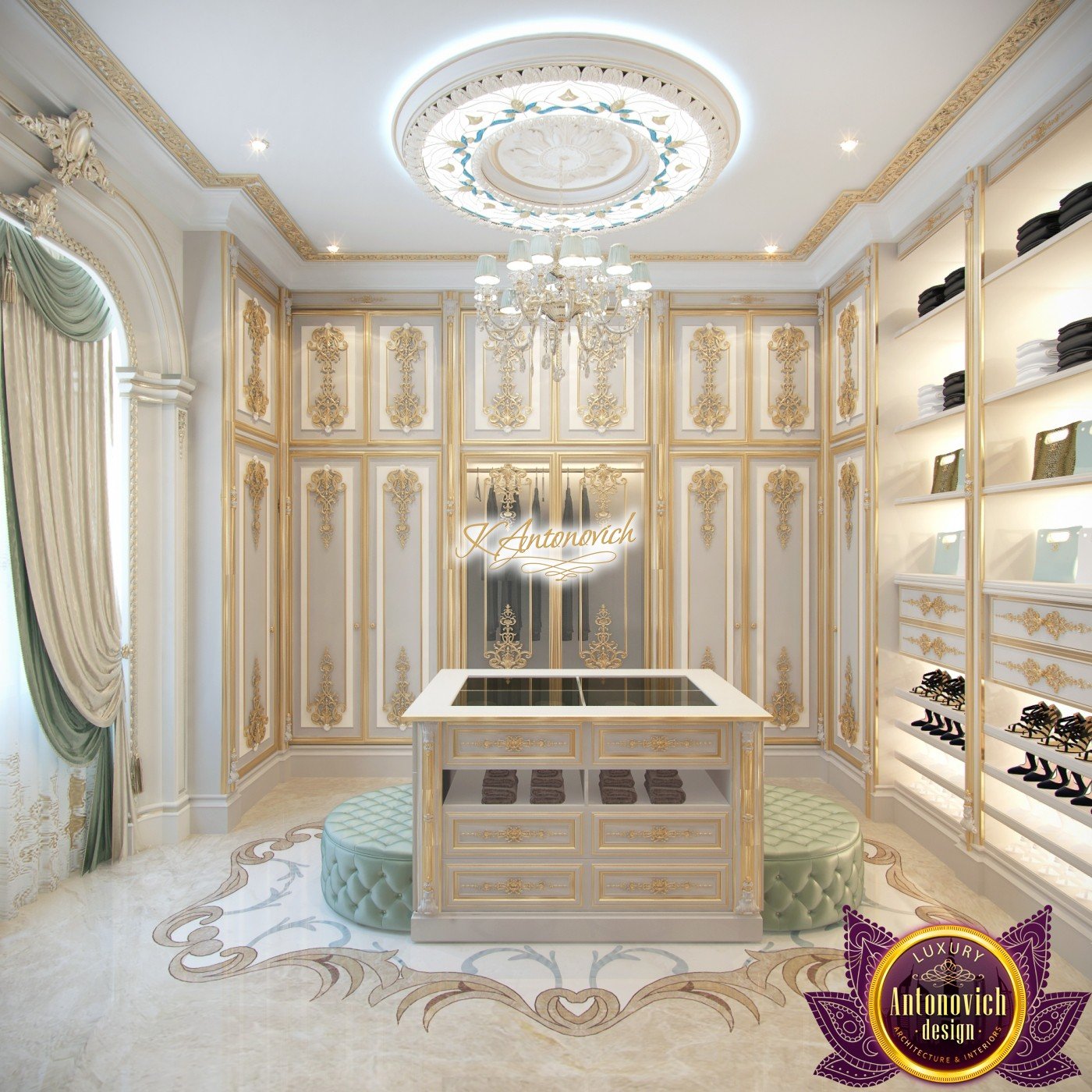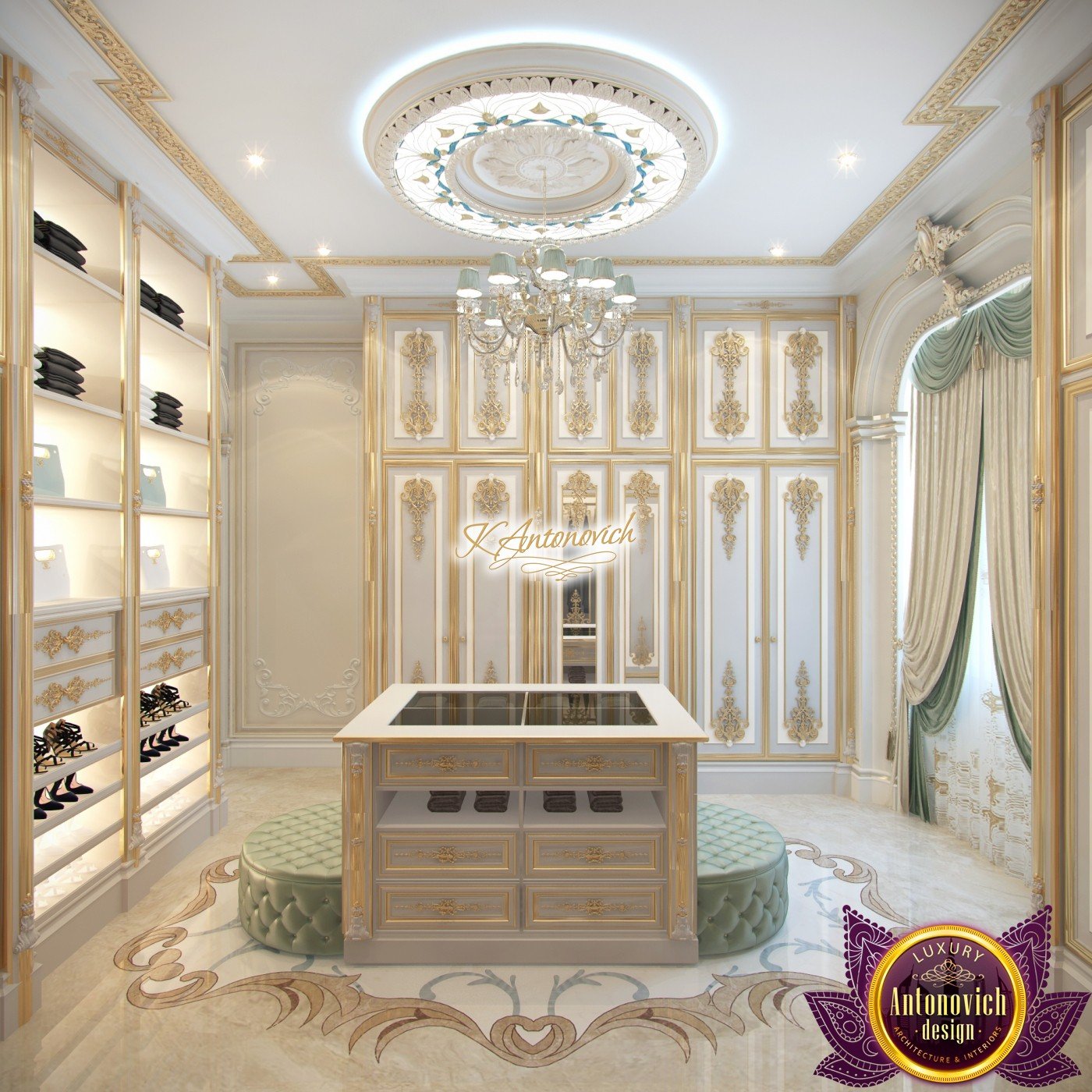 Современные решения в дизайне гардеробной стали символом роскоши для владельцев элитной обуви и одежды. В ограниченном пространстве дизайнеры интерьерной студии Антонович Дизайн (Antonovich Design) смогли организовать по‑настоящему королевский, шикарный интерьер дома. Это современный дизайн гардеробной комнаты. Рассмотрим ключевые детали красивого интерьера. Декор потолка выглядит изящно и стильно благодаря витражу с подсветкой, который окружает элегантную люстру — мягкое освещение вокруг люстры задаёт особую атмосферу. Гардеробная с витражом и подсветкой становится центром композиции. Шторы и ламбрекены в гардеробной служат выразительным акцентом уюта: мягкие складки создают ощущение лёгкости. В интерьере использованы шелковые шторы молочно-голубого оттенка. Мягкие складки шелковых штор молочно-голубого оттенка изящно играют с фактурой и светом. Главным украшением комнаты стала мебель с резной отделкой и позолотой. Элементами выдержан классический стиль гардеробной комнаты. За фасадами шкафов в классическом стиле скрыты современные системы хранения за фасадами шкафов и подсветка в секциях шкафов. Для хранения аксессуаров предусмотрена островная система хранения для аксессуаров. Мрамор на полу дополнен резными мотивами — мраморный пол с резным узором. Мягкие пуфы в натуральной коже выполнены в той же цветовой гамме, что и шторы.
