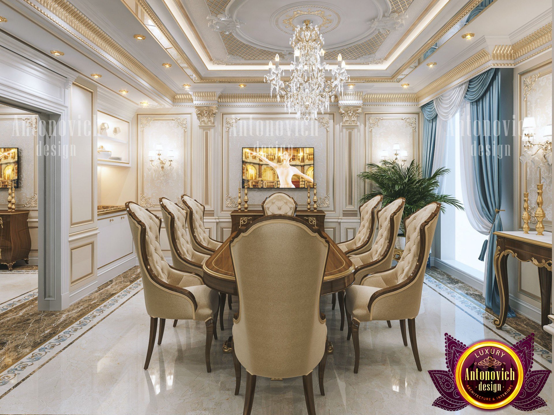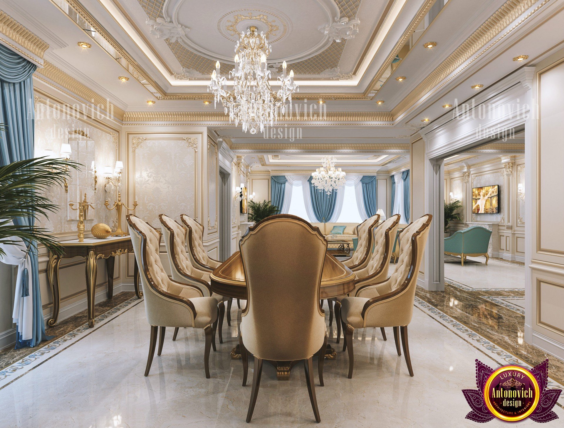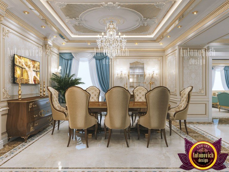 В основе палитры — бежевые и золотистые тона с акцентами бирюзово-синих текстильных элементов: шикарные сатиновые шторы с ламбрекенами и тёмная древесина ценных пород, представленные предметами элитной классической мебели. В проекте используются стол, мягкие кресла и различные типы шкафов для посуды и бытовых принадлежностей: буфет и консоль. Мебель помогает визуально разделить мебель для столовой и гостиной, сохраняя единую композицию интерьера. Также в этом проекте реализованы текстиль для столовой в бежевых тонах, подчёркивающий спокойную и роскошную атмосферу — столовая в стиле классика раскрывает своё благородство через материалы и фактуры.