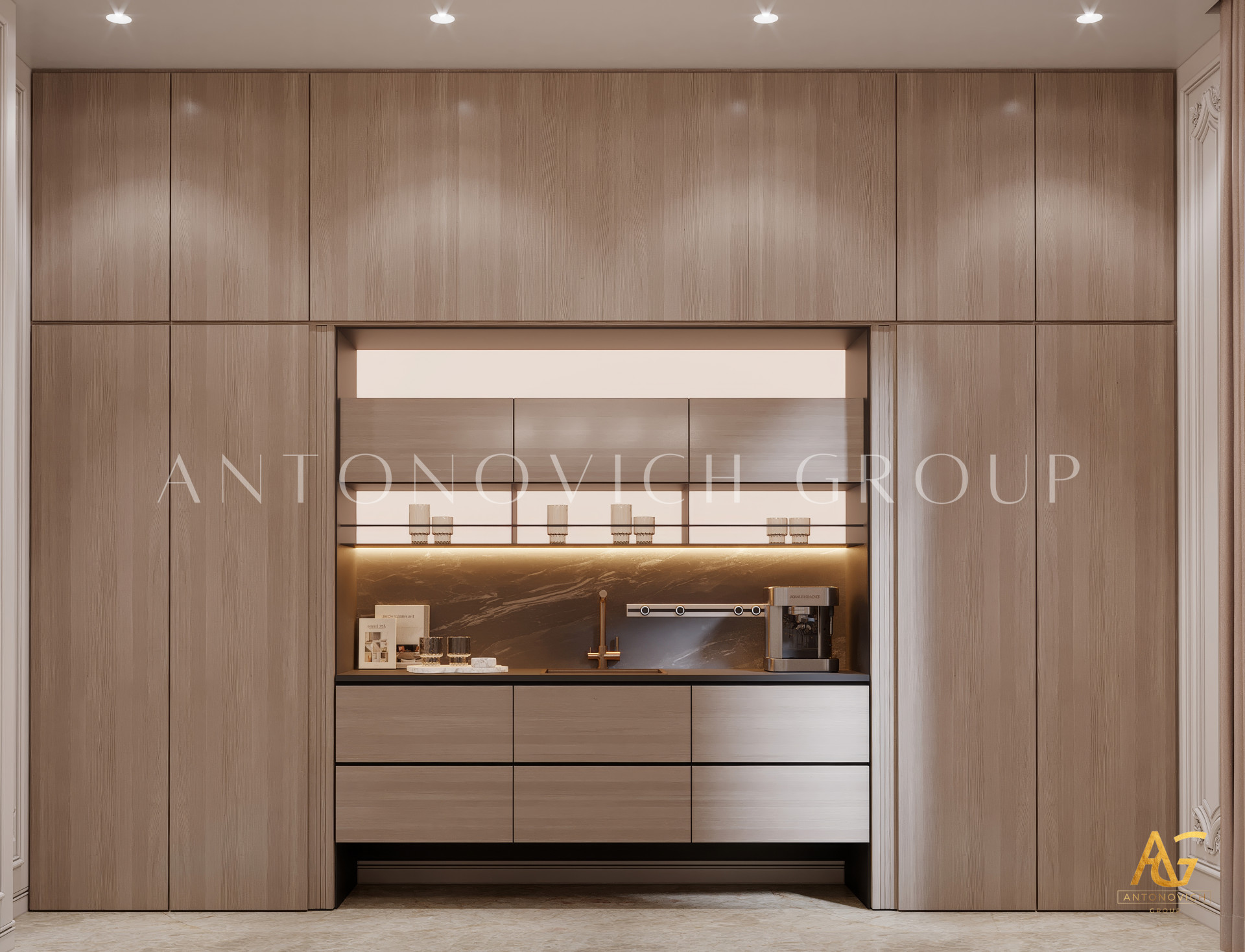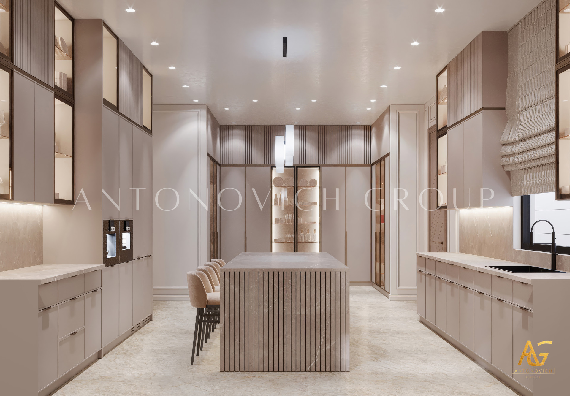 Кухня также украшена впечатляющей золотой отделкой, что делает её образ идеальным для роскошного интерьера. Помещение наполнено уникальными роскошными решениями, которые вы найдёте здесь. Антонович Дизайн довёл создание роскошных тем до совершенства. Они создали тысячи проектов, которые вам понравятся!