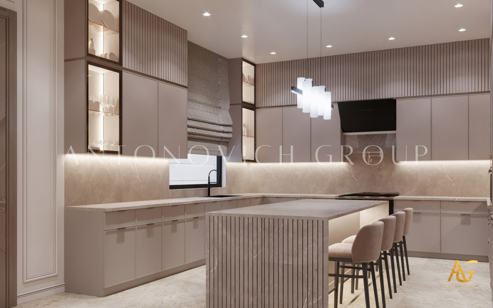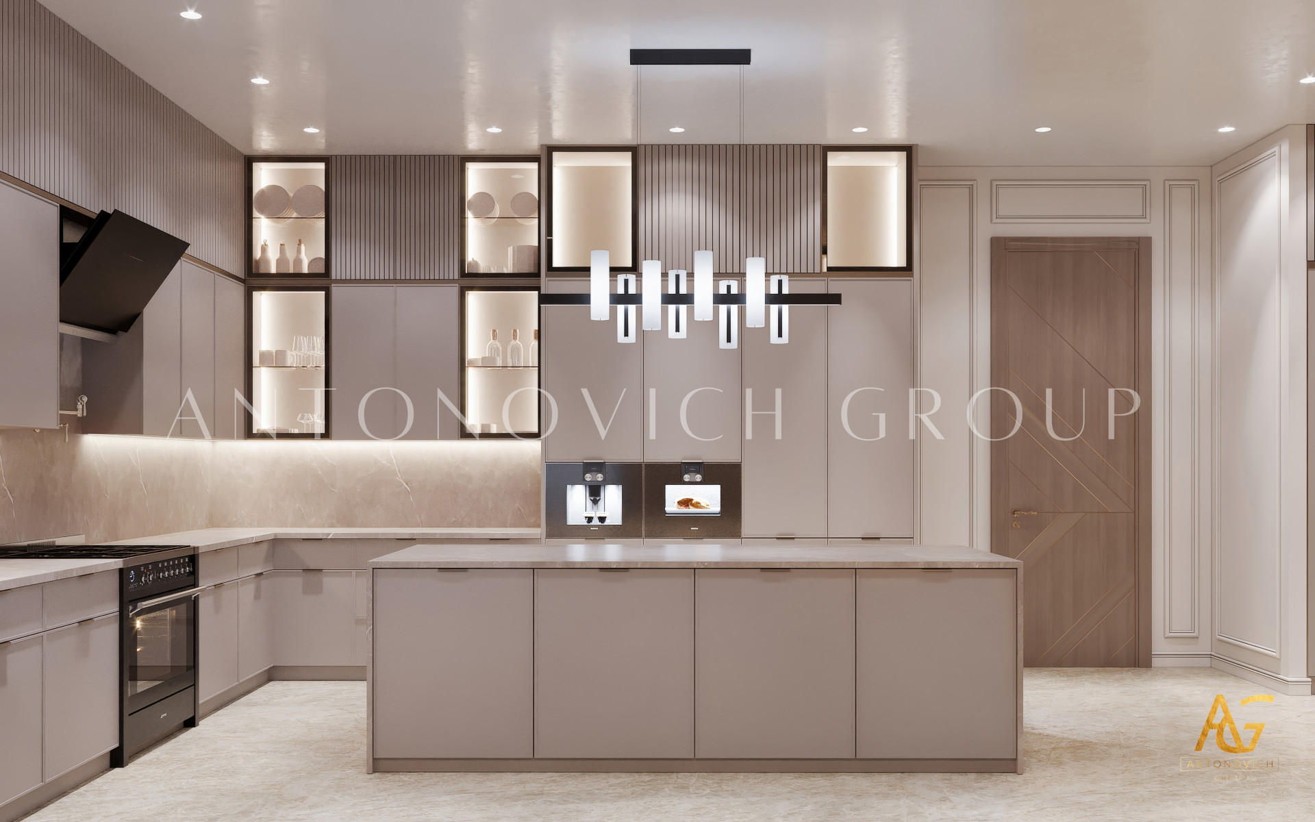 Вы любите нейтральные оттенки? Этот футуристический дизайн кухни от Антонович Дизайн (Antonovich Design) использует нейтральные тона, которые выглядят красиво, современно и модно. Блестящая черная мраморная отделка создаёт эффектный акцент.