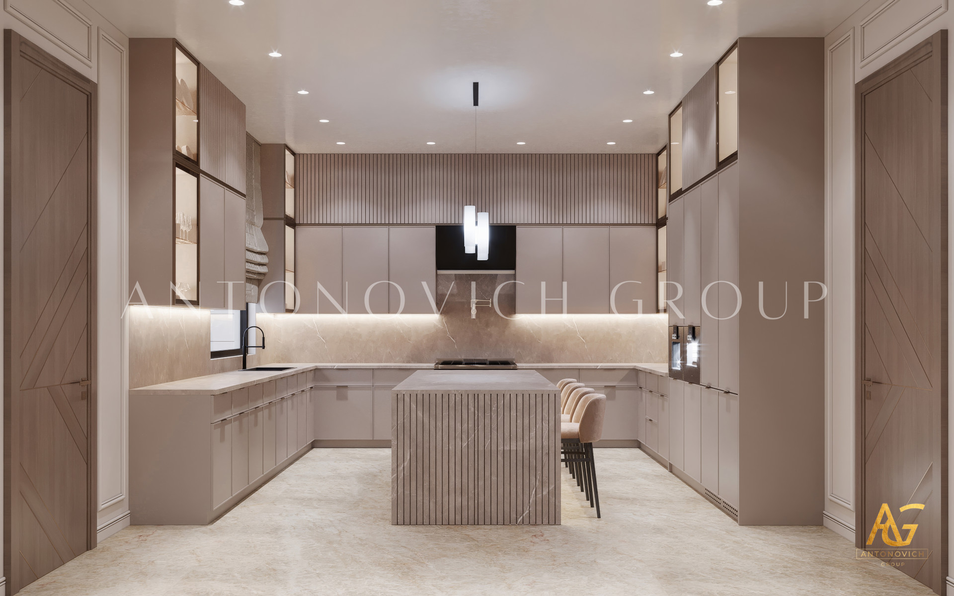 В этом проекте сочетаются: роскошный дизайн кухни, дизайн кухни в нейтральных тонах, кухонный интерьер с мрамором, белые стены в кухне, мраморный пол в кухне, кухня с золотой отделкой, большая кухня для семьи, дизайн кухни для приема гостей, современный кухонный интерьер.