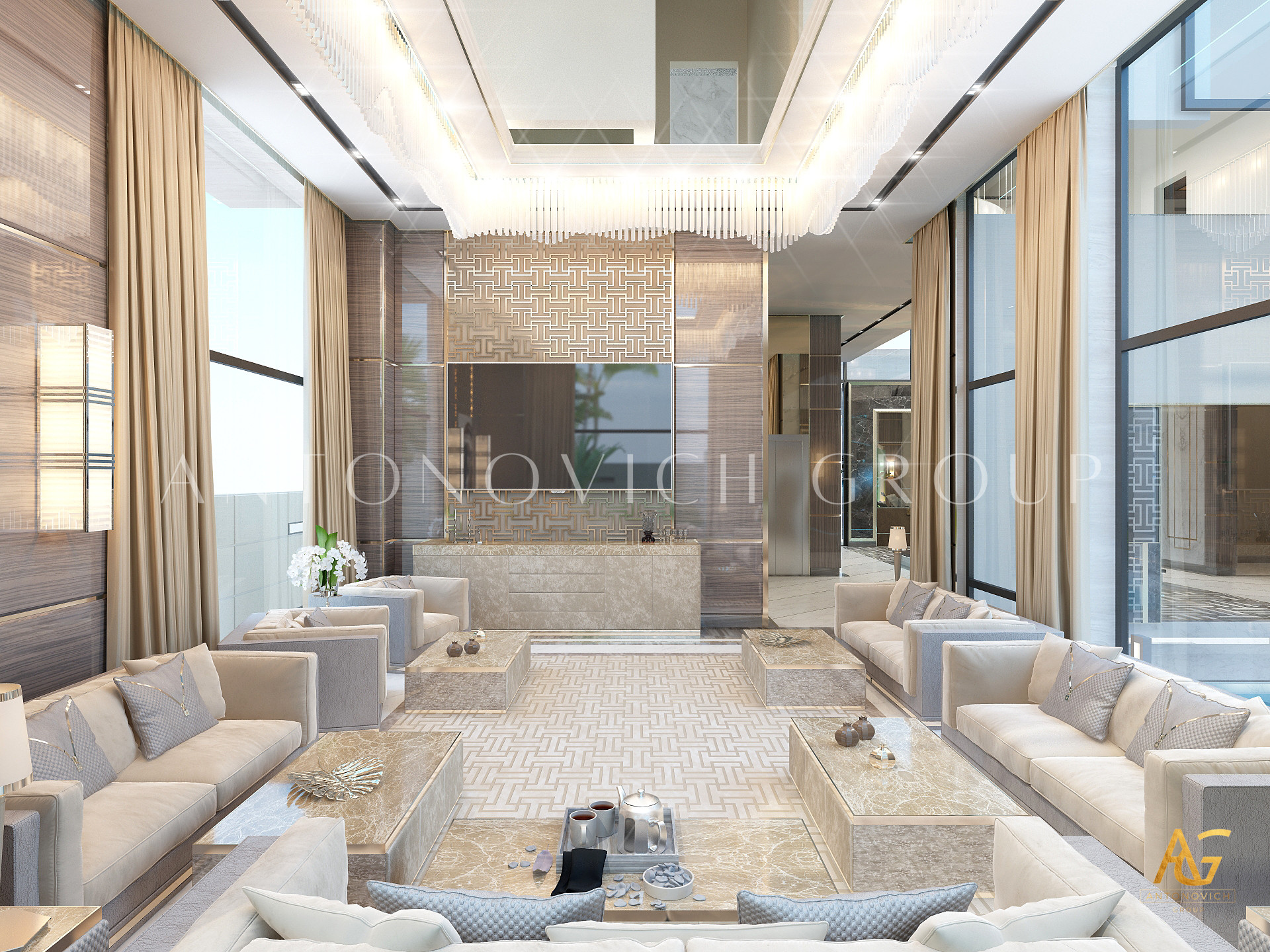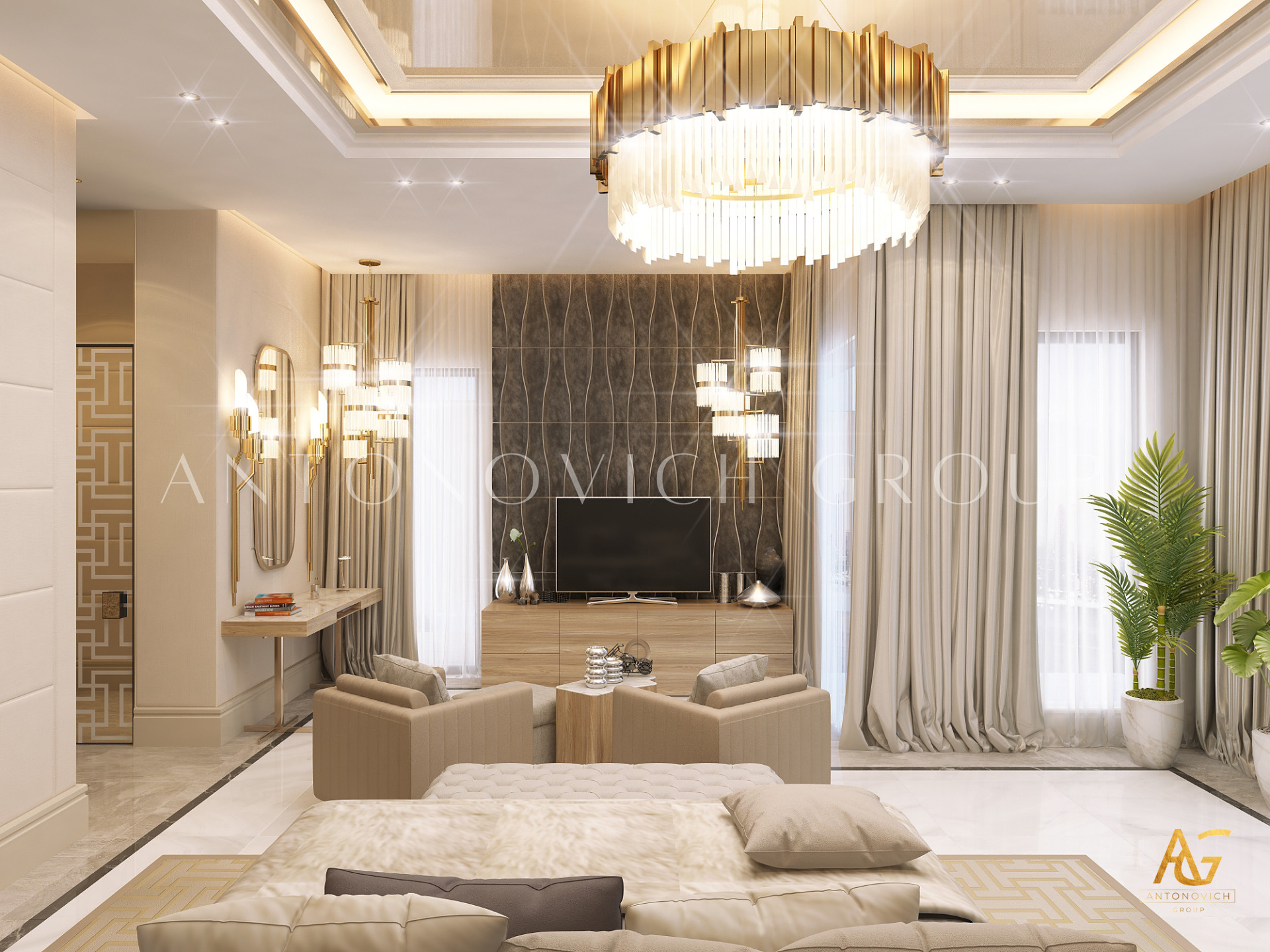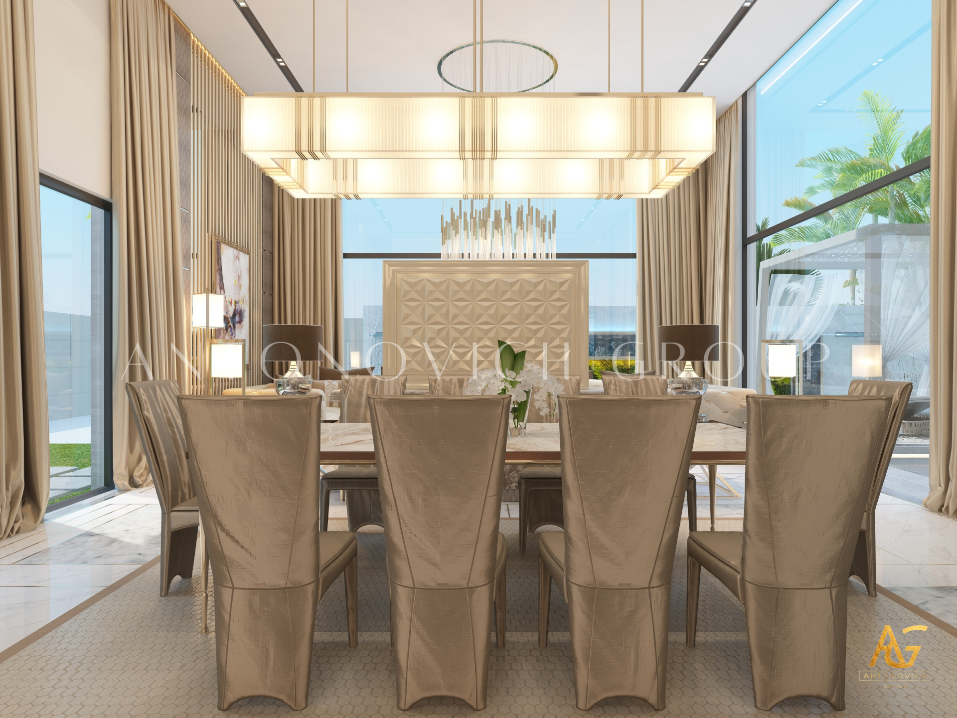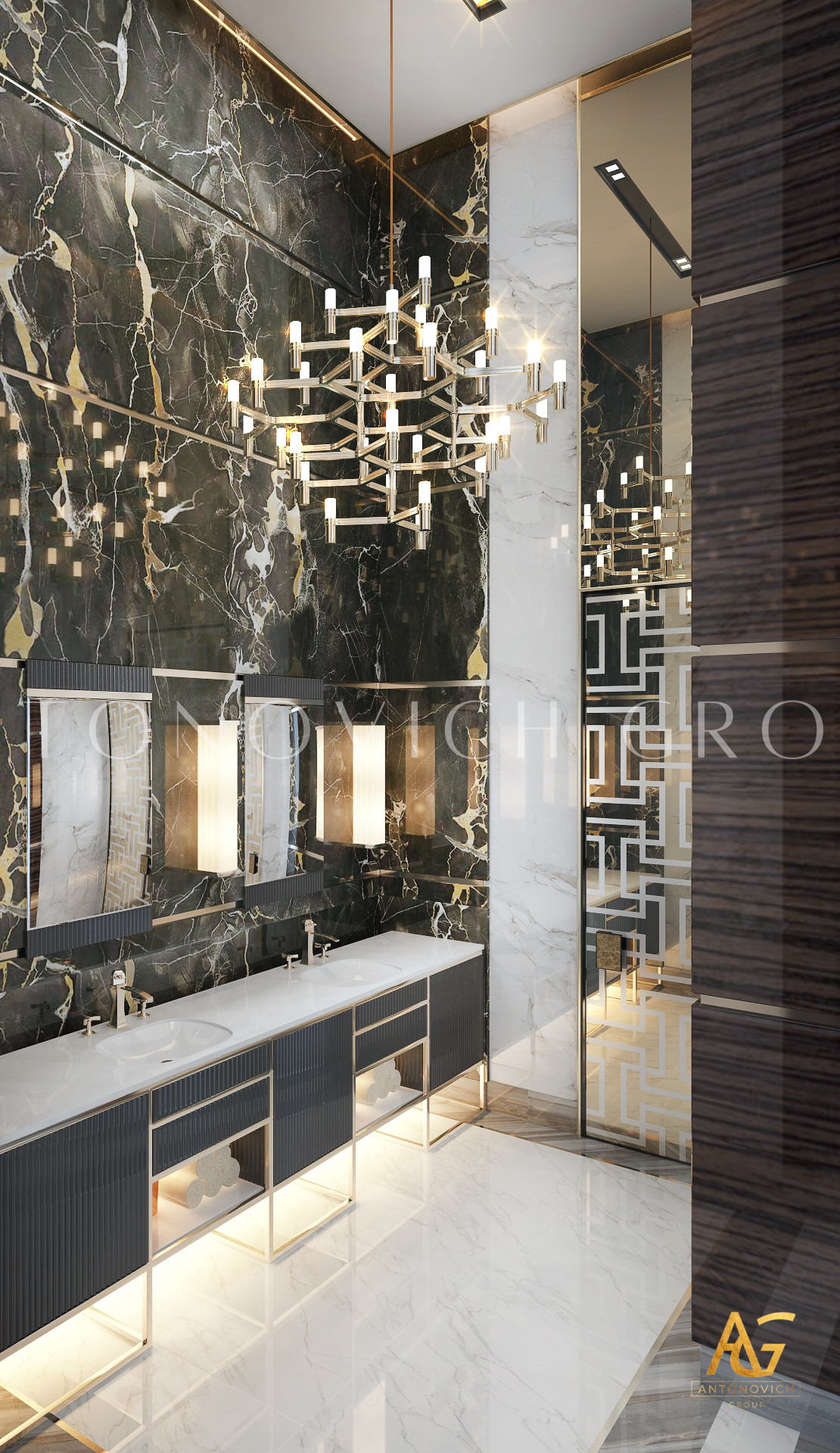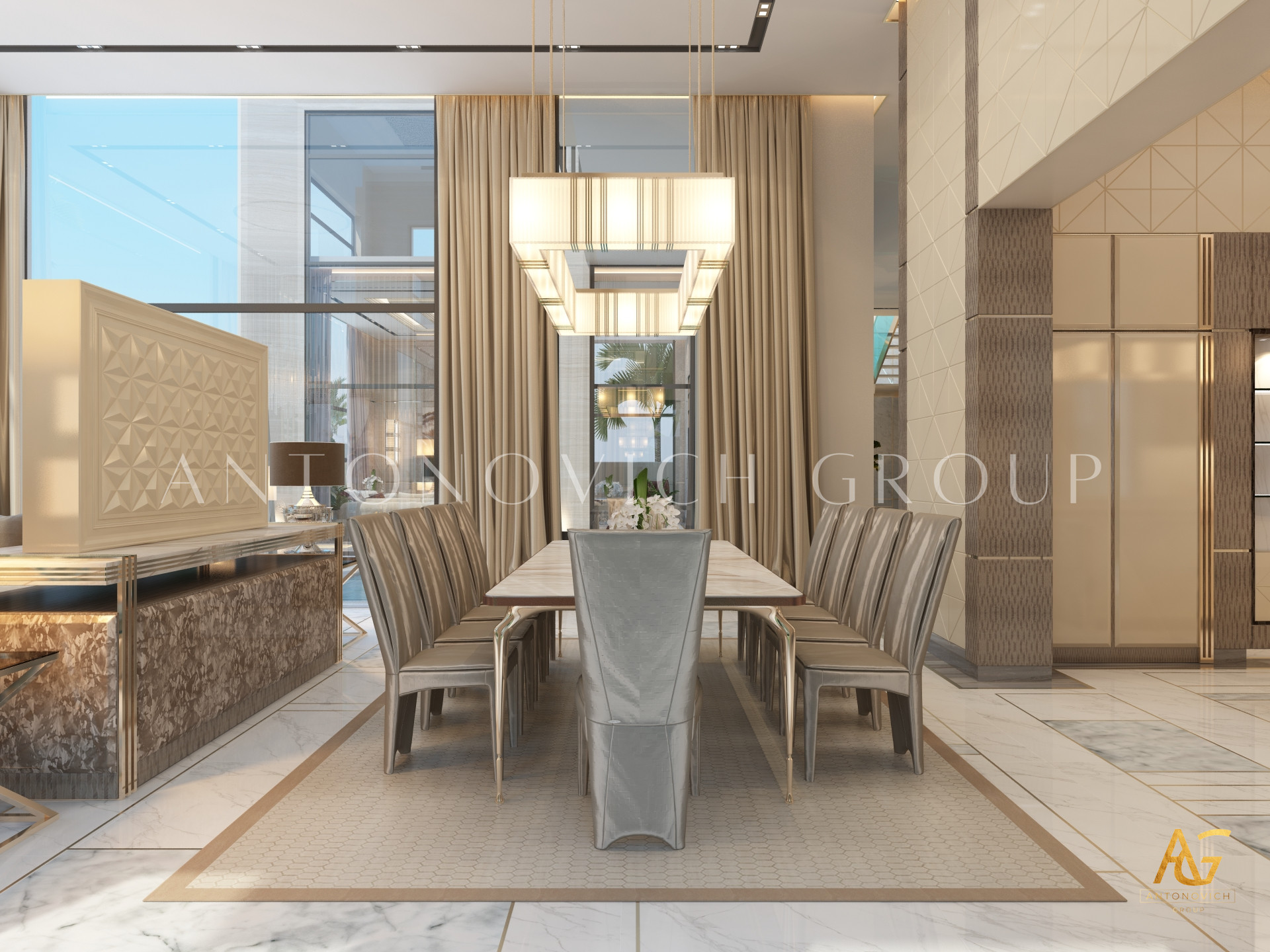 Освещение играет ключевую роль в создании элегантной атмосферы виллы. Antonovich Group включила смесь величественных люстр, светодиодных систем освещения и декоративных элементов потолка, тщательно разработанных для подчеркивания архитектурных деталей. Потолки, украшенные гипсовыми работами и золотыми акцентами, добавляют глубину и утонченность каждому пространству.