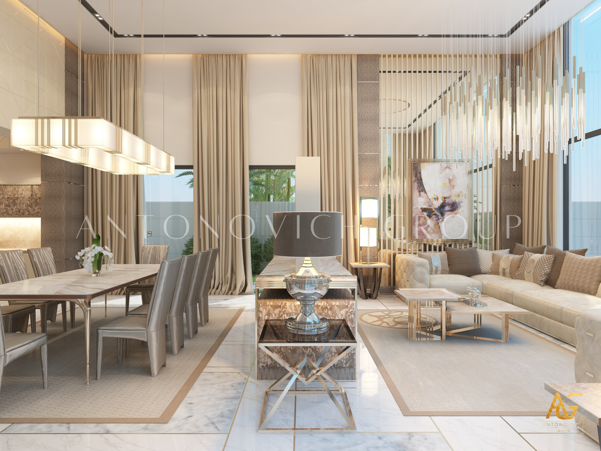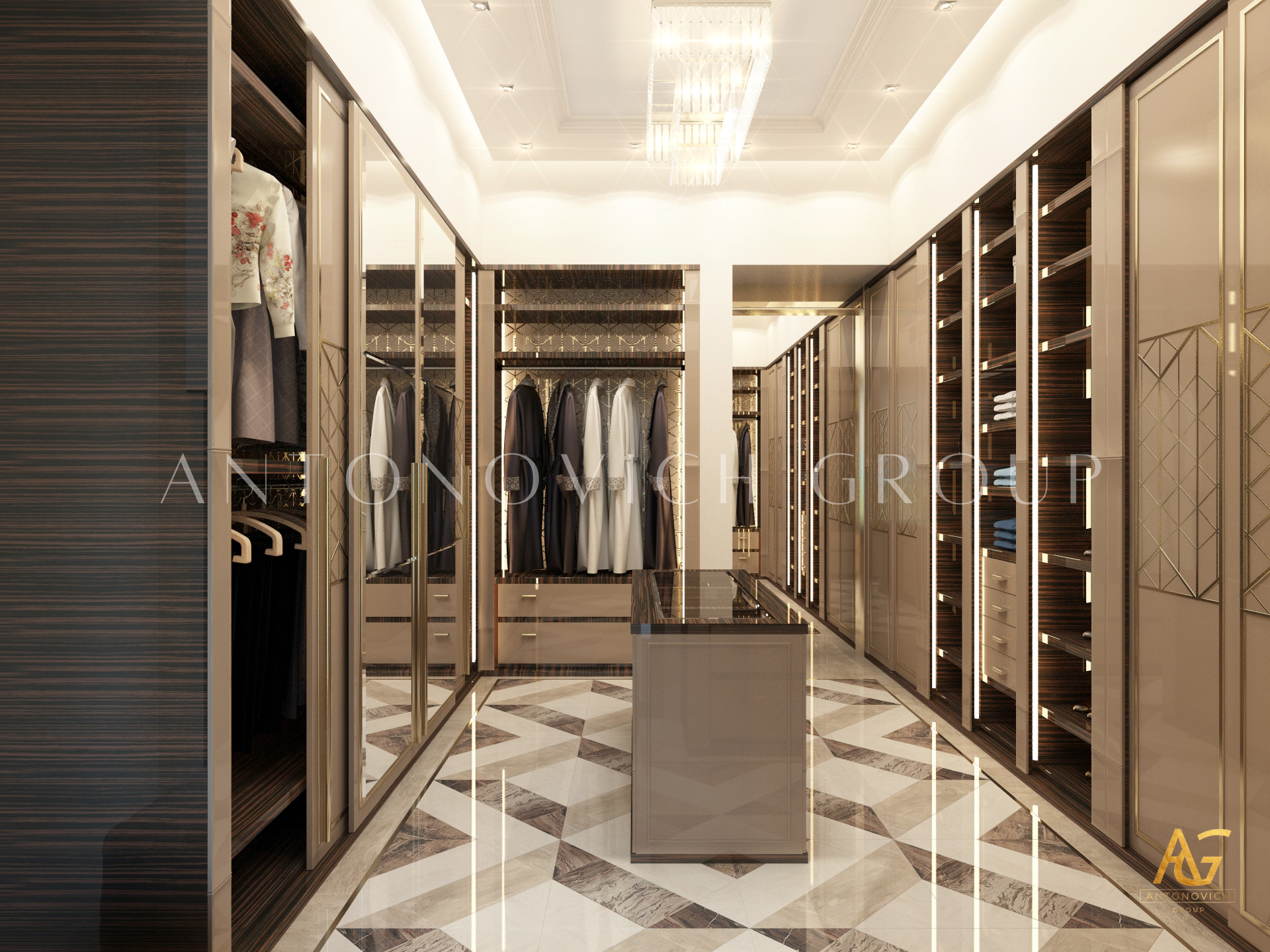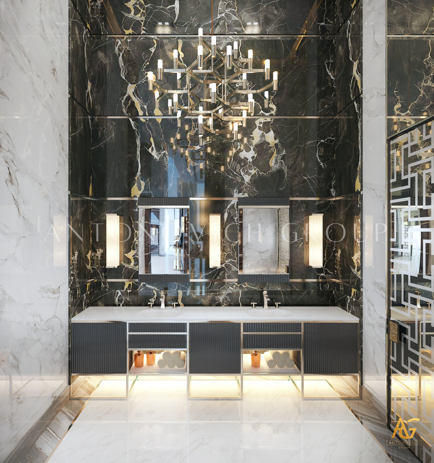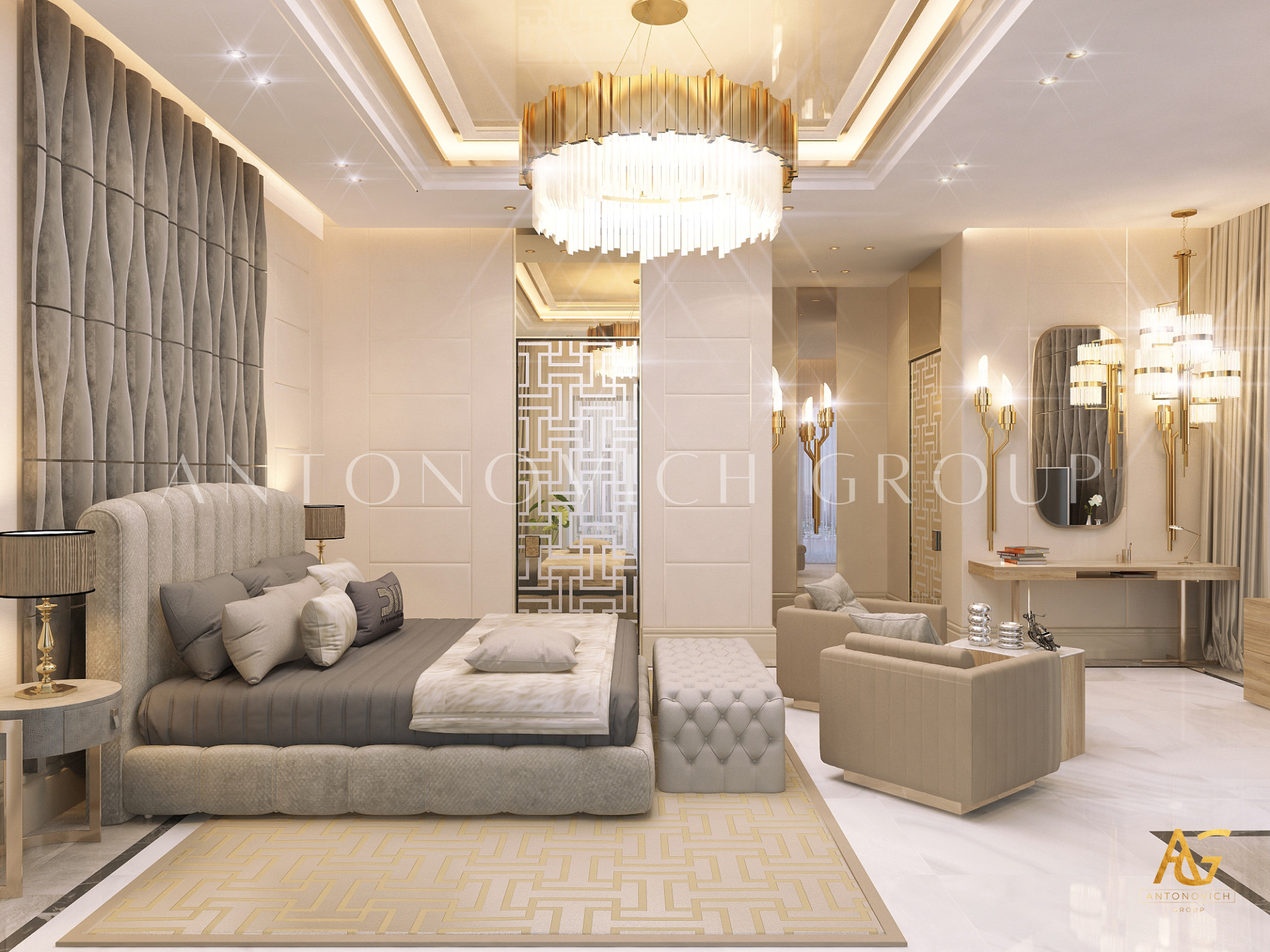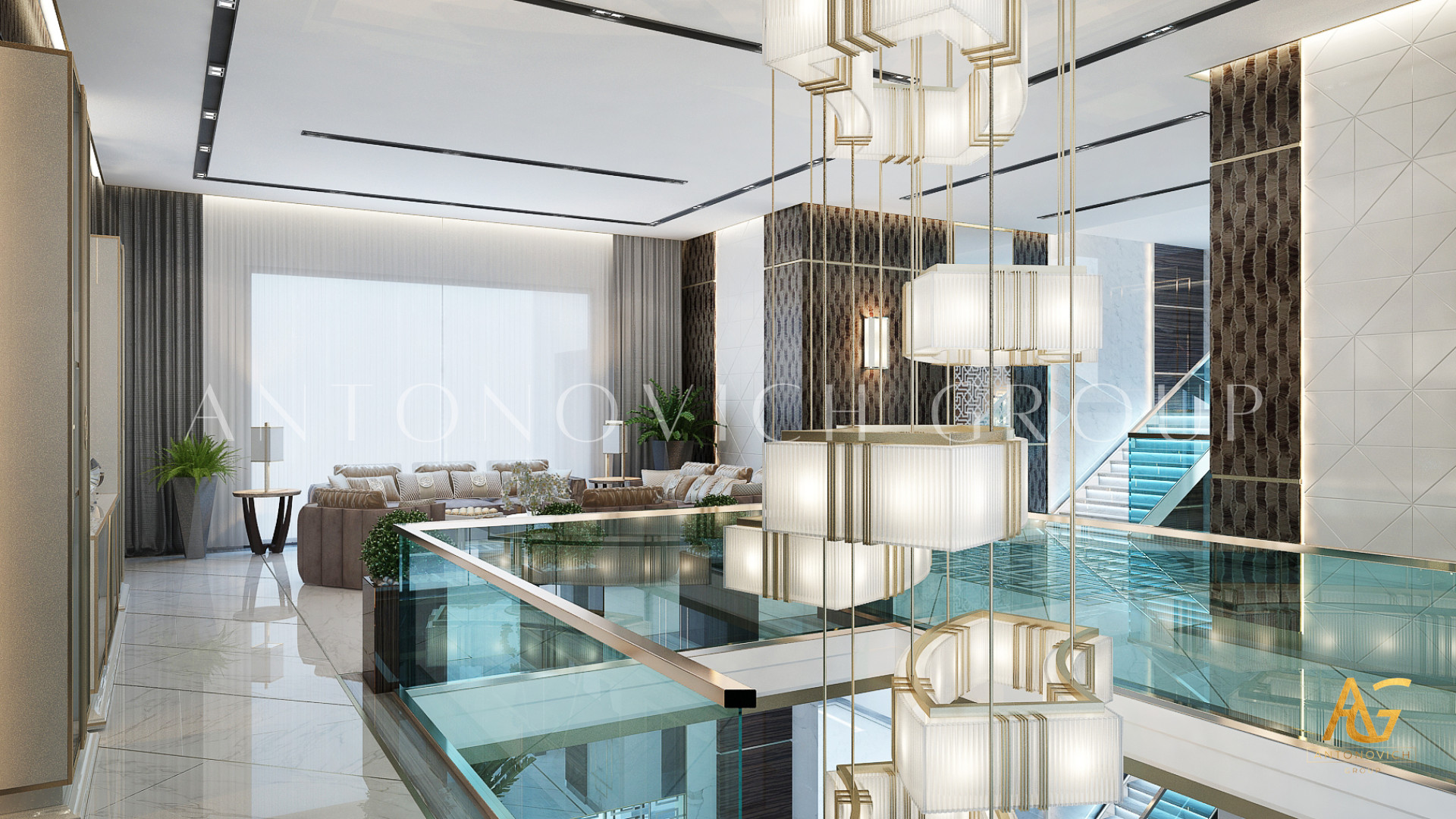 Освещение играет ключевую роль в создании элегантной атмосферы виллы. Antonovich Group включила смесь величественных люстр, светодиодных систем освещения и декоративных элементов потолка, тщательно разработанных для подчеркивания архитектурных деталей. Потолки, украшенные гипсовыми работами и золотыми акцентами, добавляют глубину и утонченность каждому пространству.
