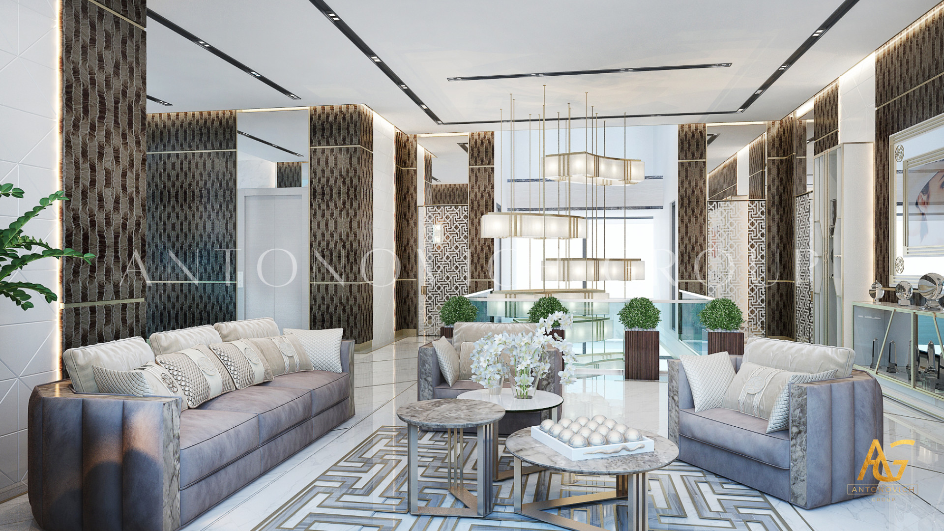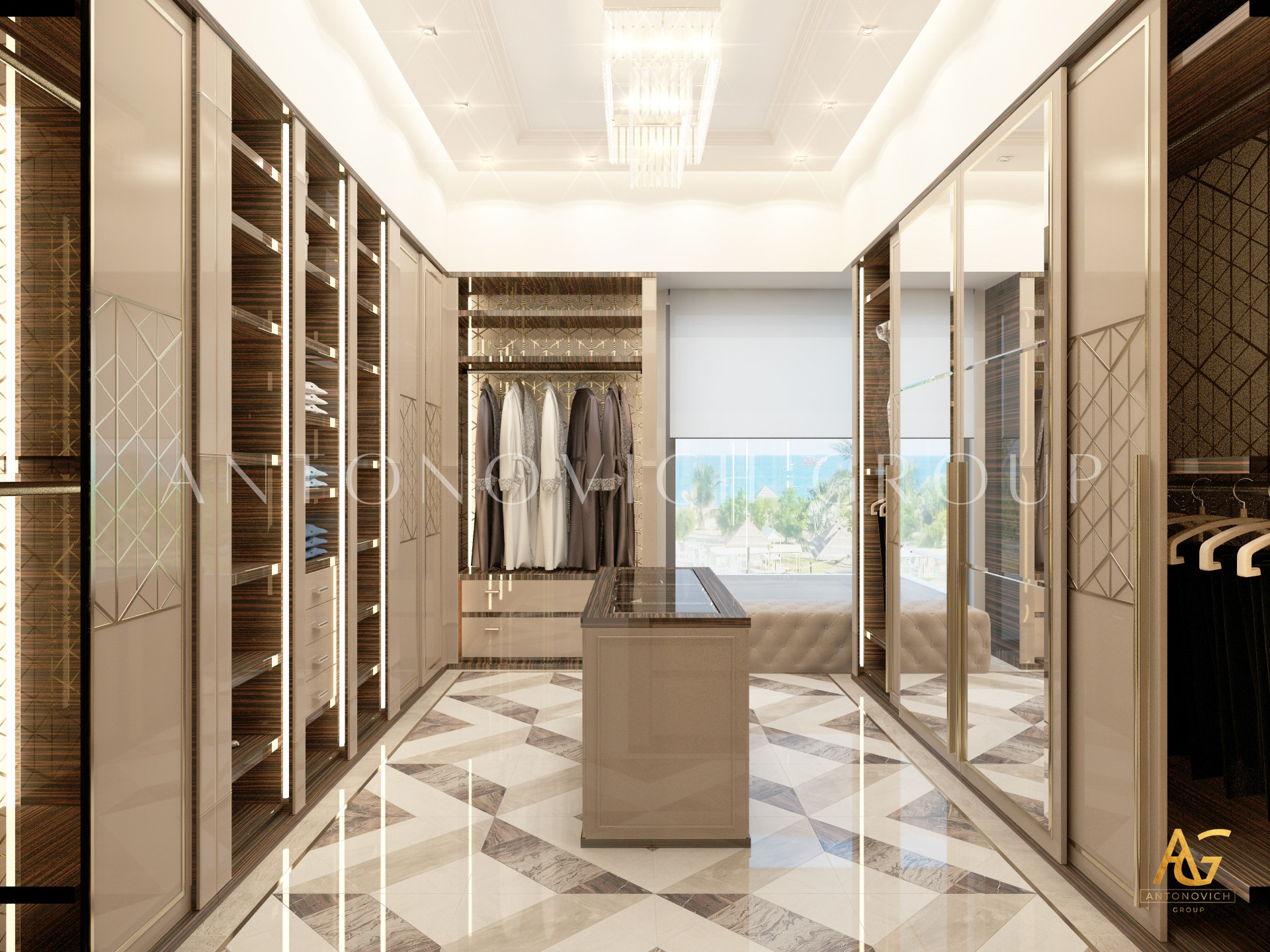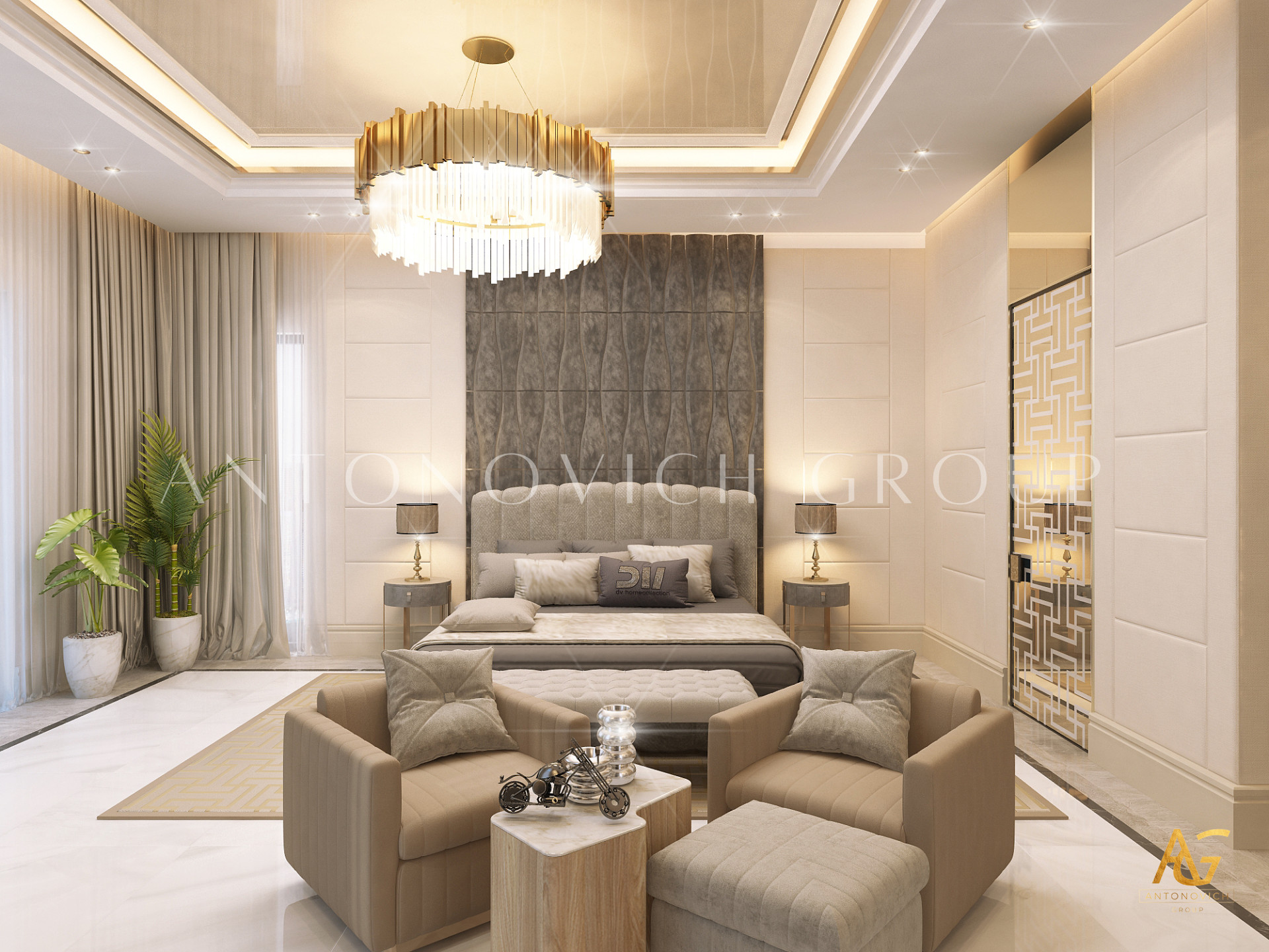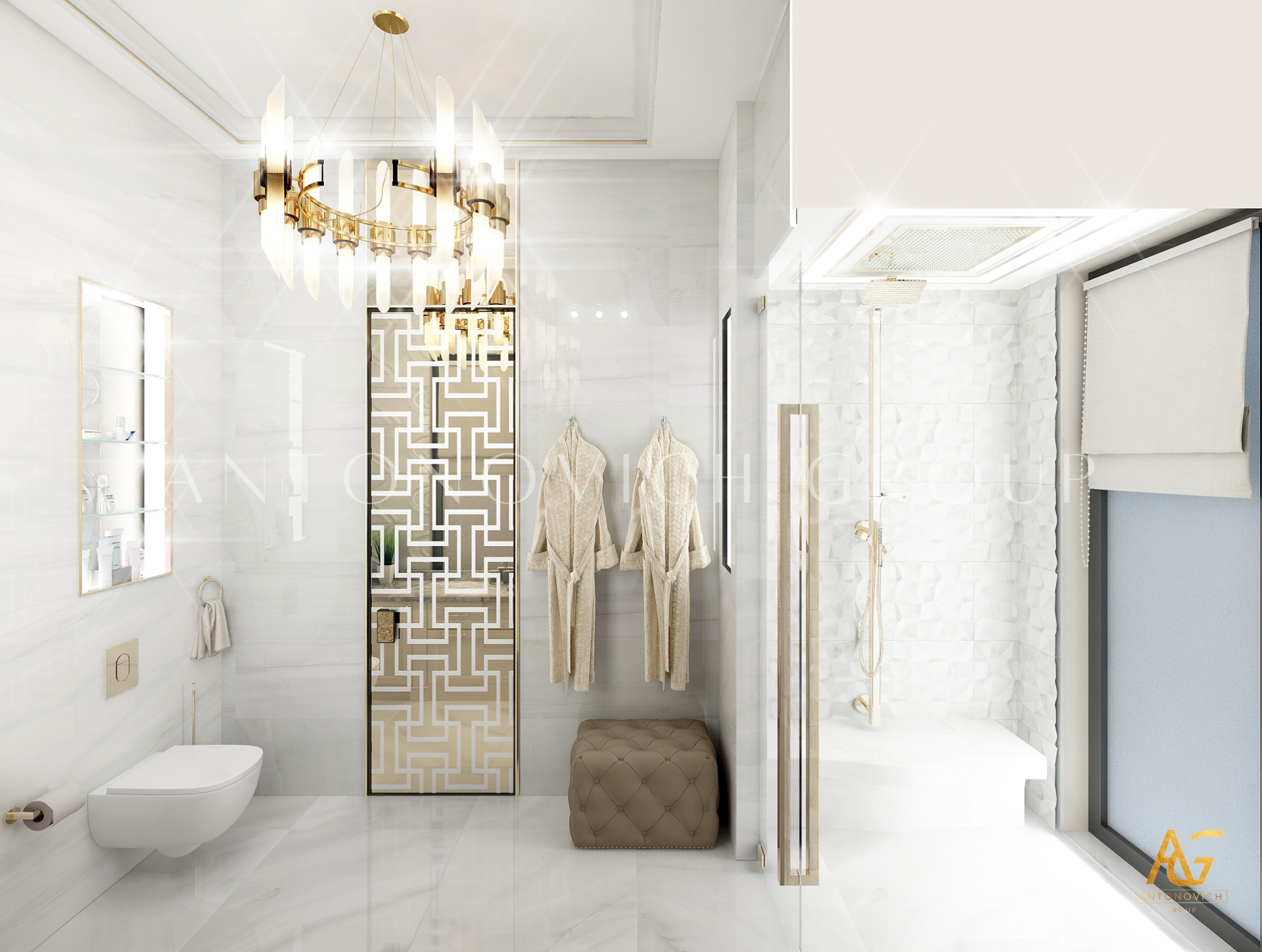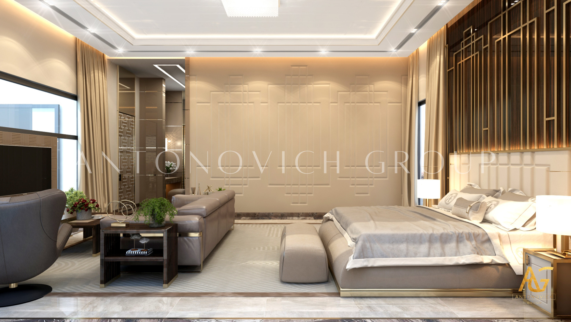 Освещение играет ключевую роль в создании элегантной атмосферы виллы. Antonovich Group включила смесь величественных люстр, светодиодных систем освещения и декоративных элементов потолка, тщательно разработанных для подчеркивания архитектурных деталей. Потолки, украшенные гипсовыми работами и золотыми акцентами, добавляют глубину и утонченность каждому пространству.