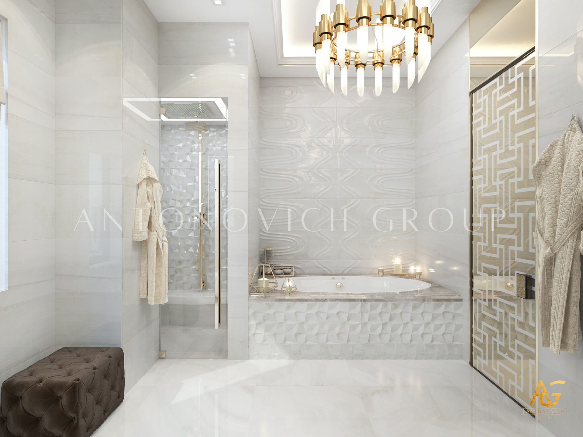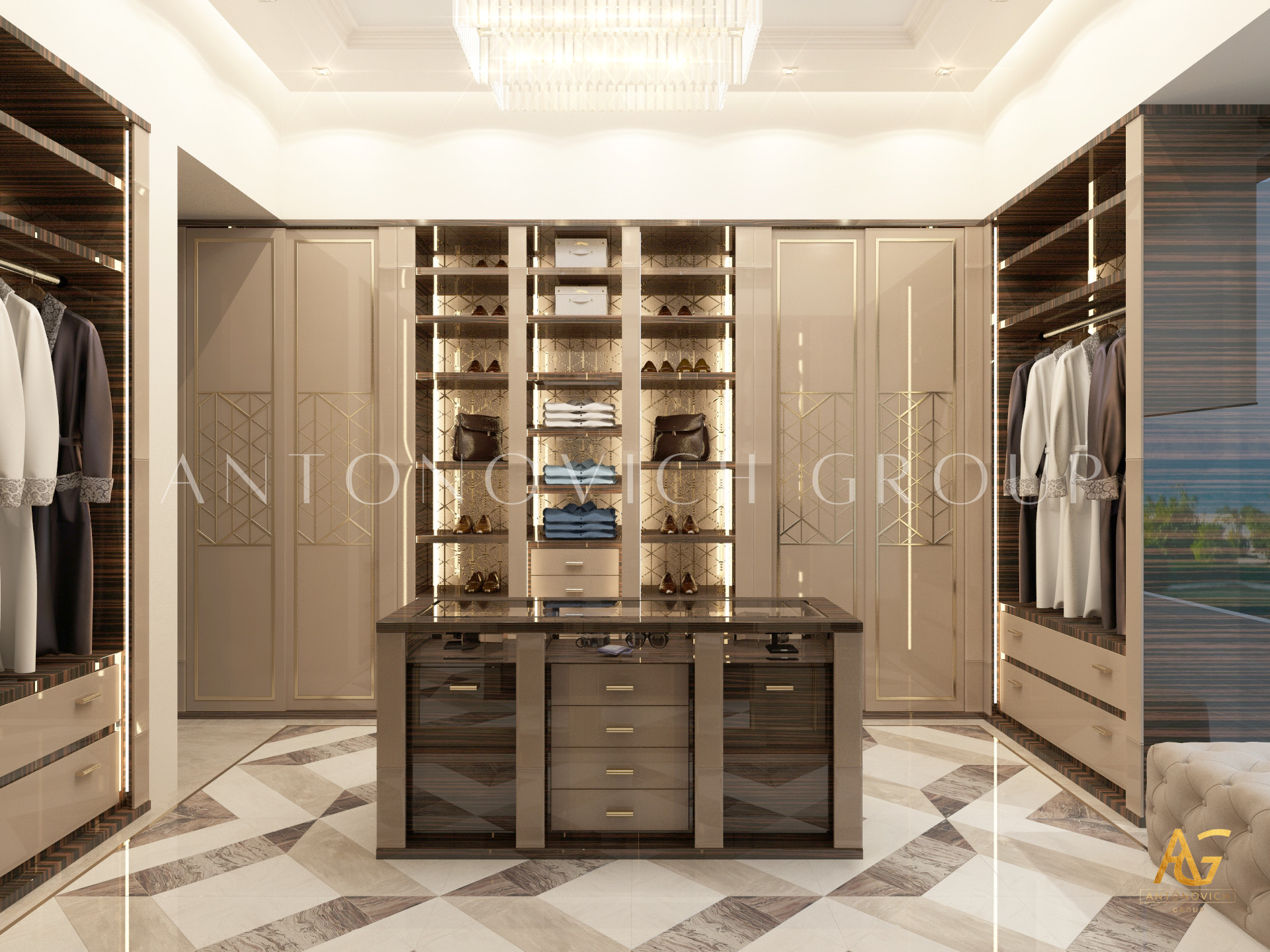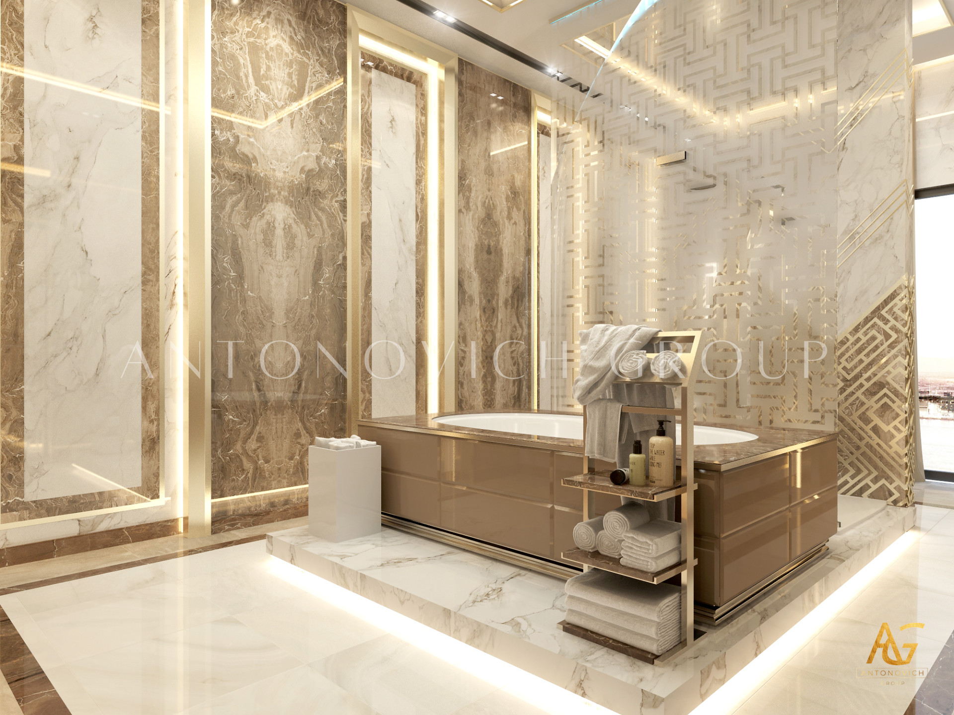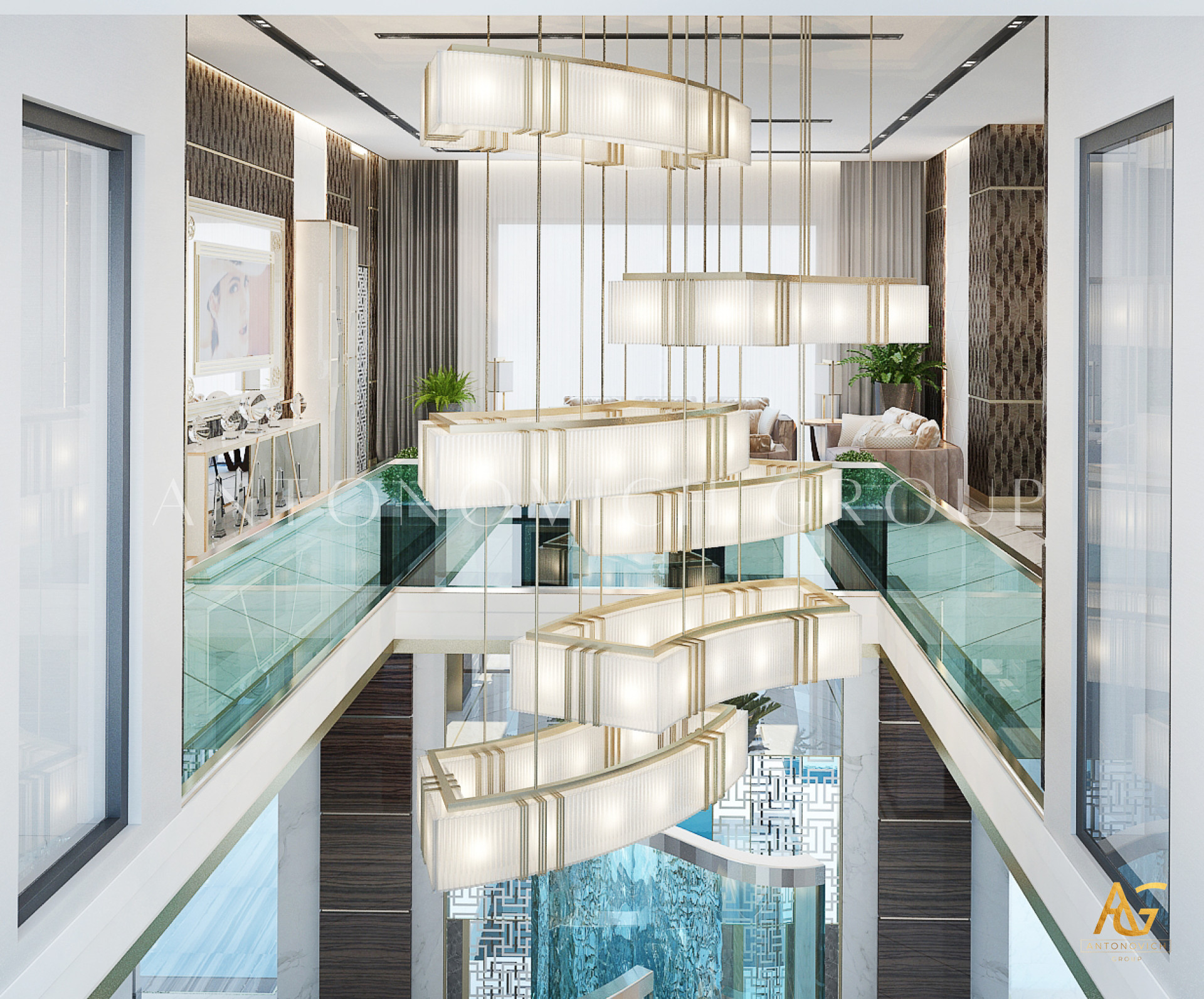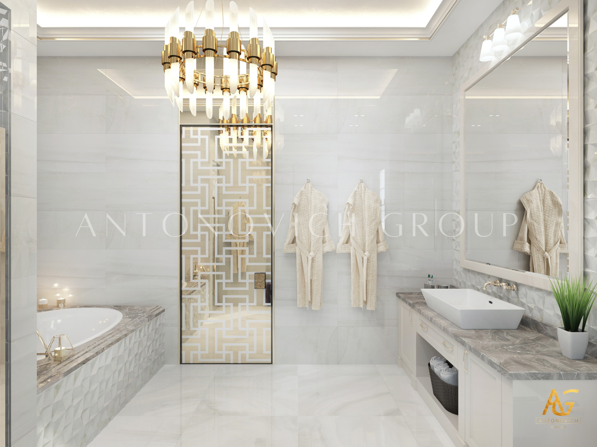 Освещение играет ключевую роль в создании элегантной атмосферы виллы. Antonovich Group включила смесь величественных люстр, светодиодных систем освещения и декоративных элементов потолка, тщательно разработанных для подчеркивания архитектурных деталей. Потолки, украшенные гипсовыми работами и золотыми акцентами, добавляют глубину и утонченность каждому пространству.