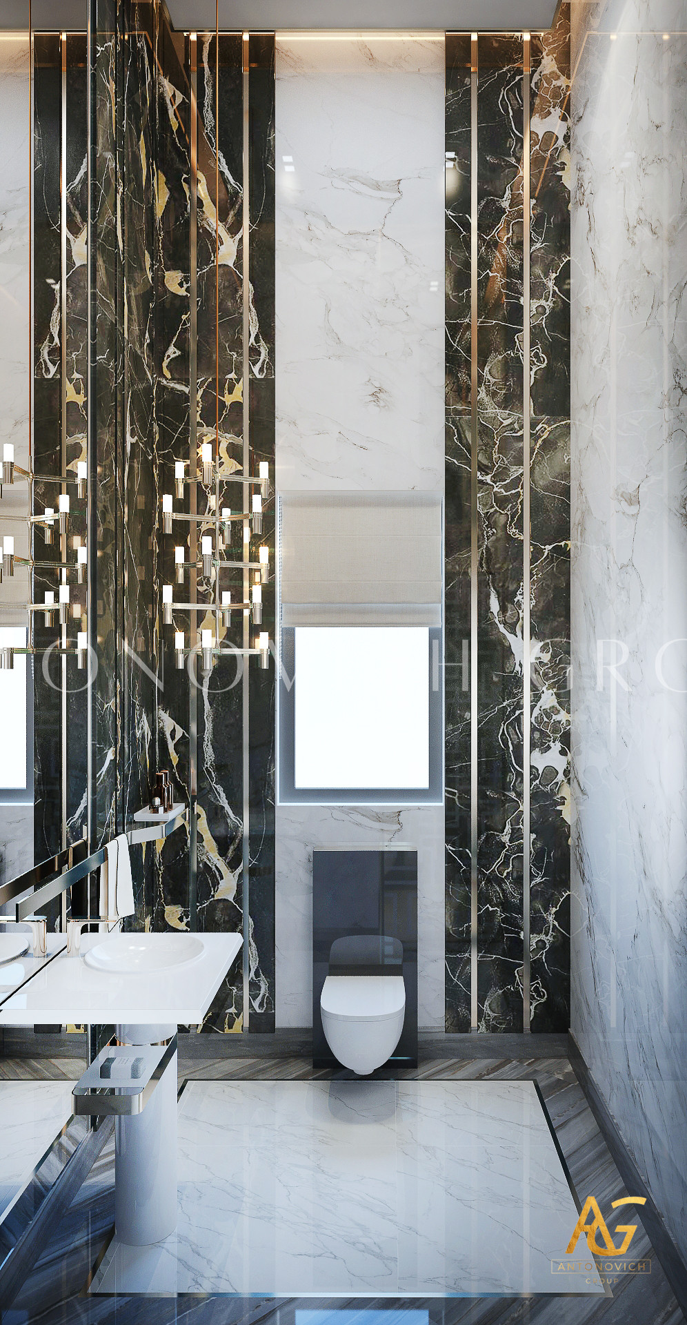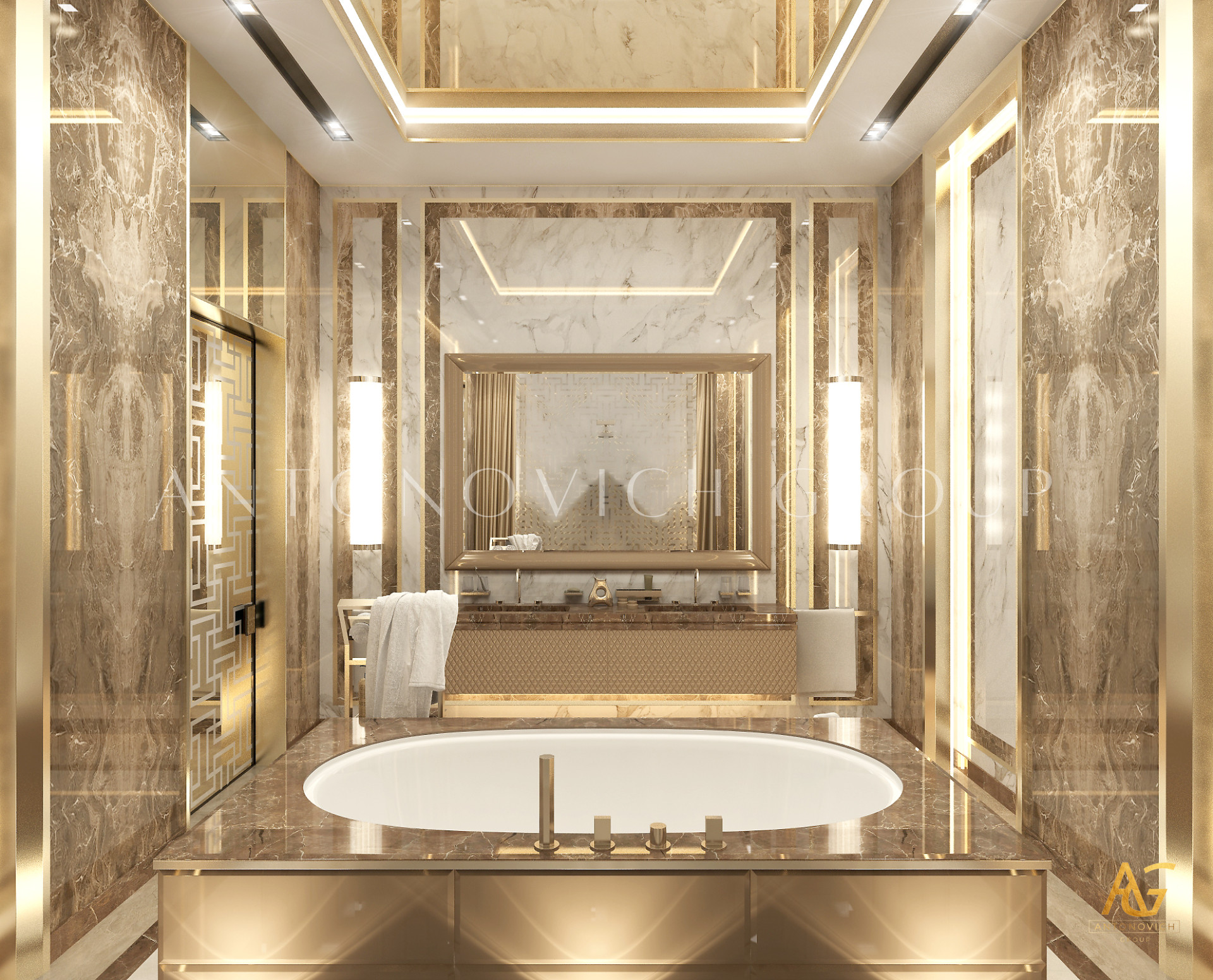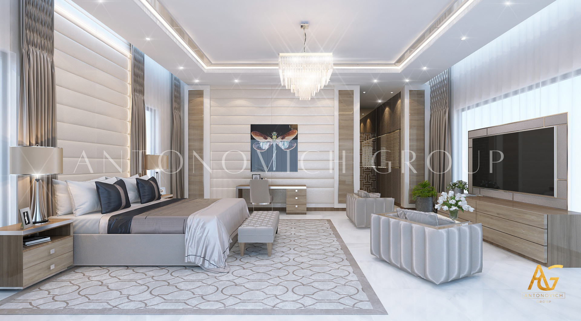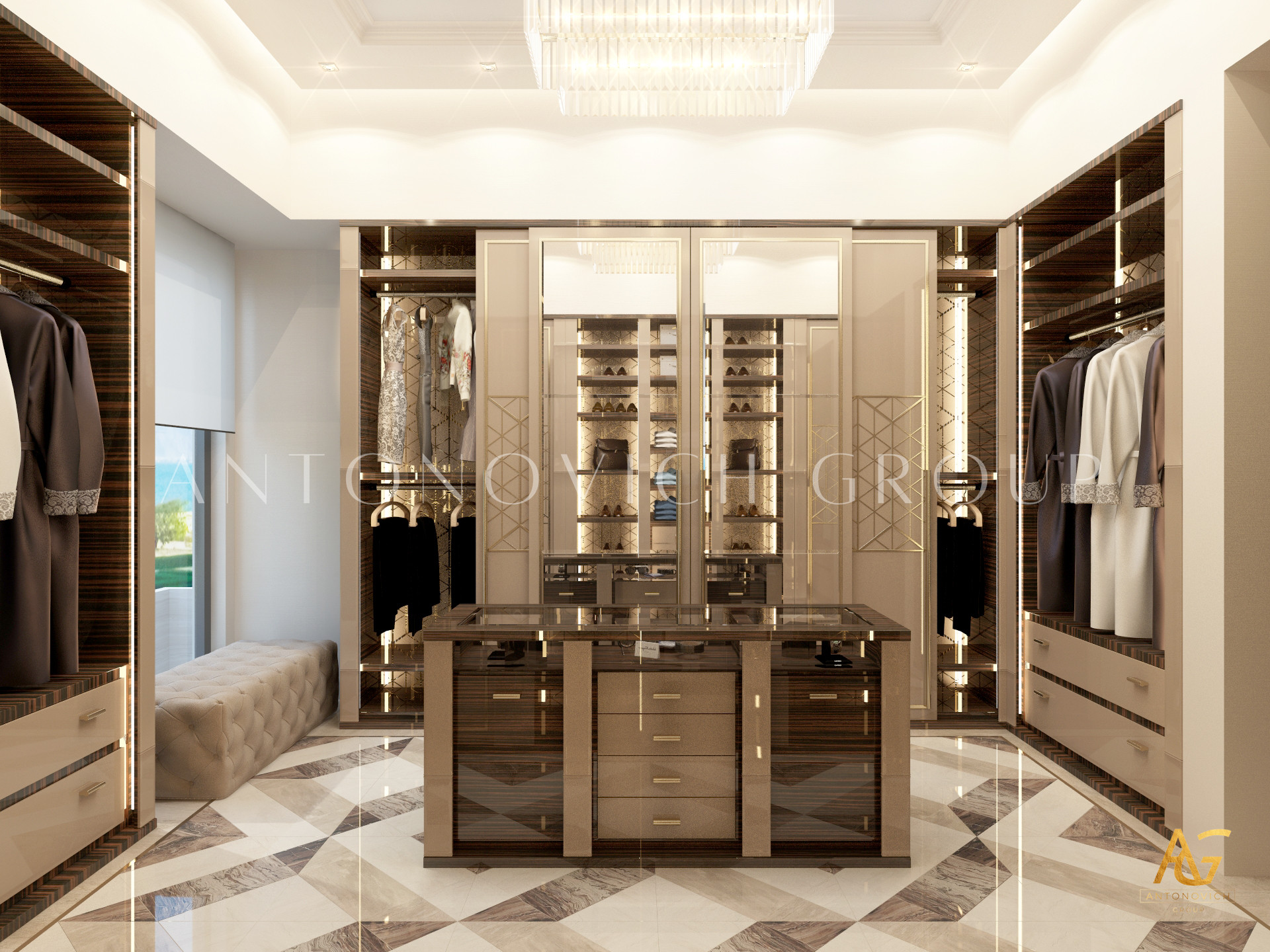Освещение играет ключевую роль в создании элегантной атмосферы виллы. Antonovich Group включила смесь величественных люстр, светодиодных систем освещения и декоративных элементов потолка, тщательно разработанных для подчеркивания архитектурных деталей. Потолки, украшенные гипсовыми работами и золотыми акцентами, добавляют глубину и утонченность каждому пространству.