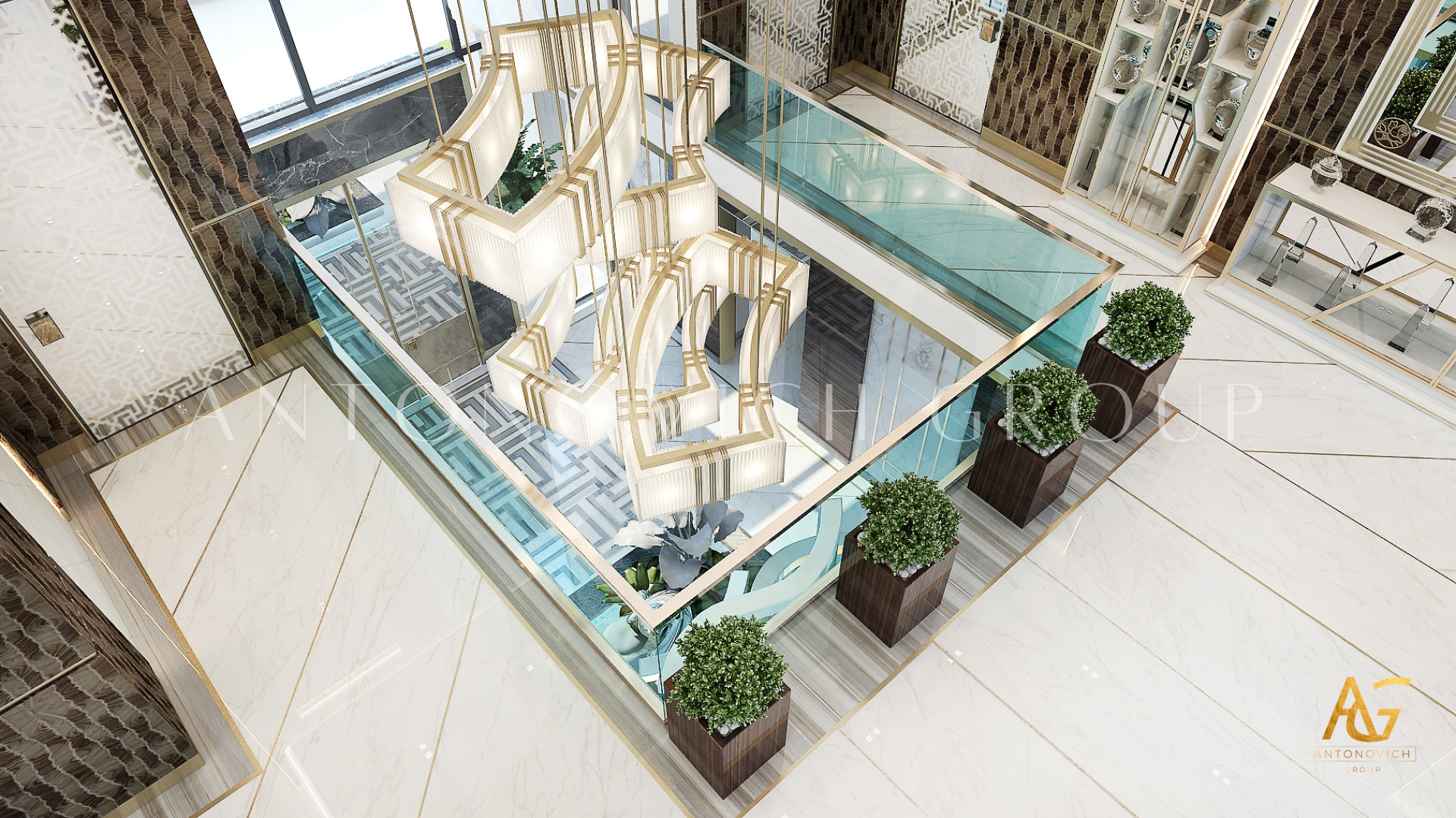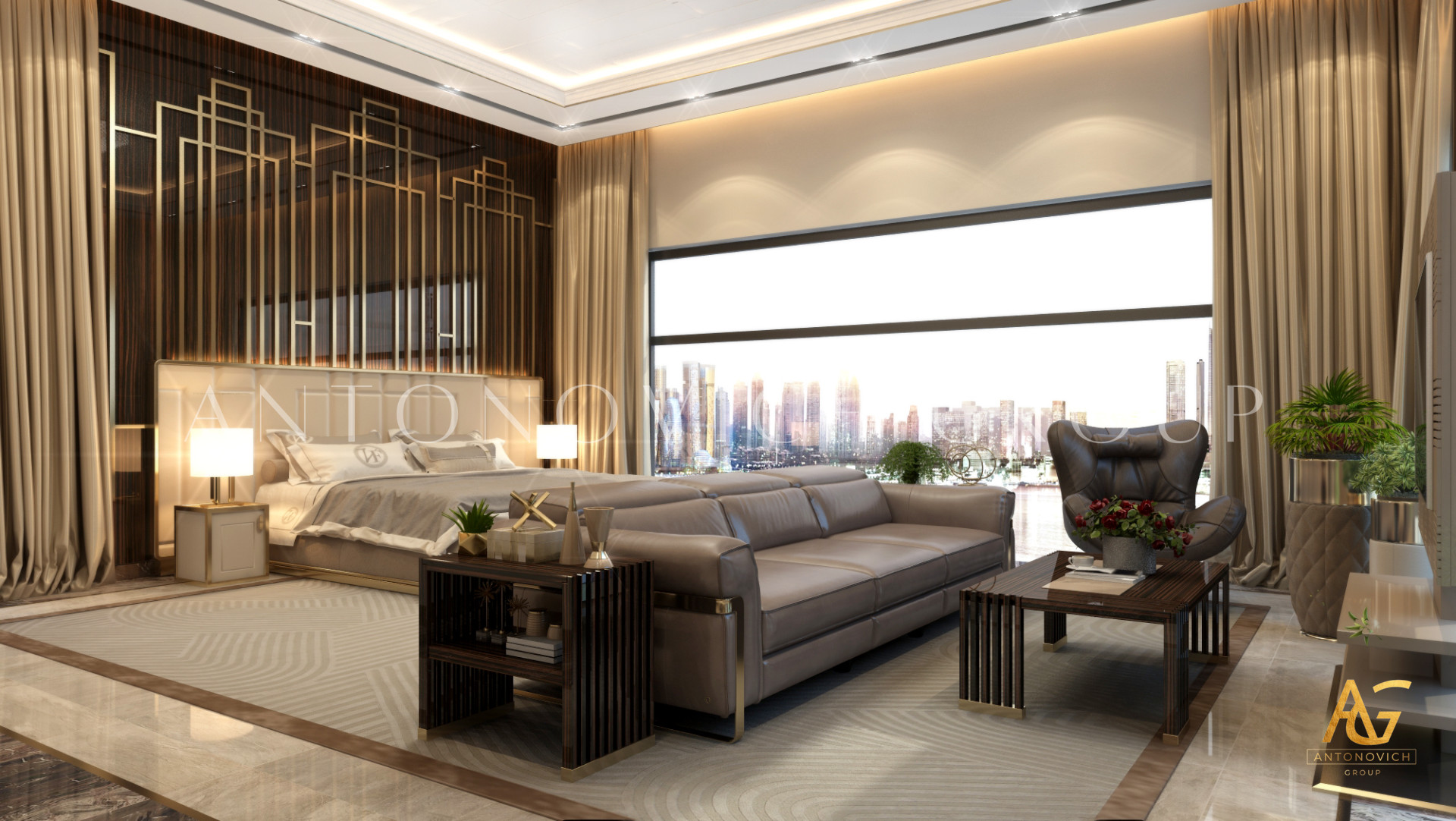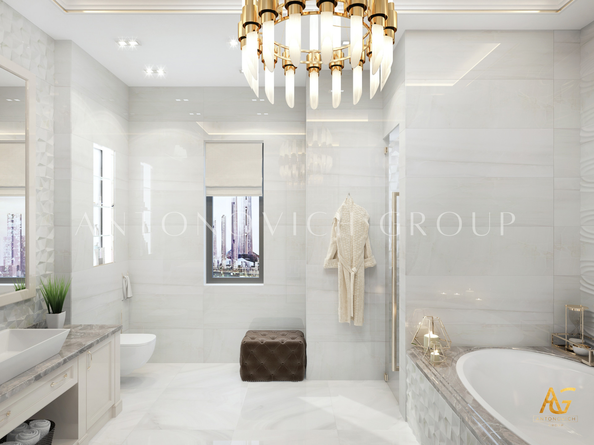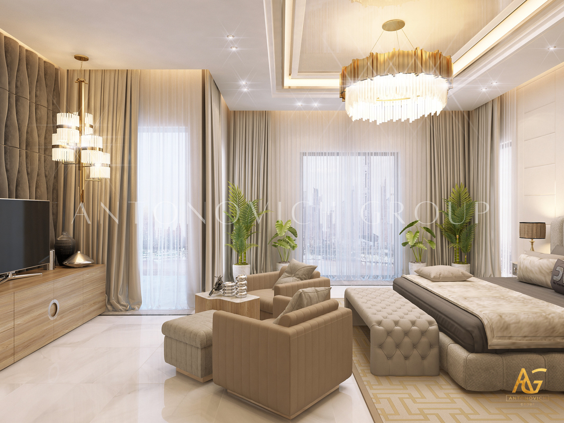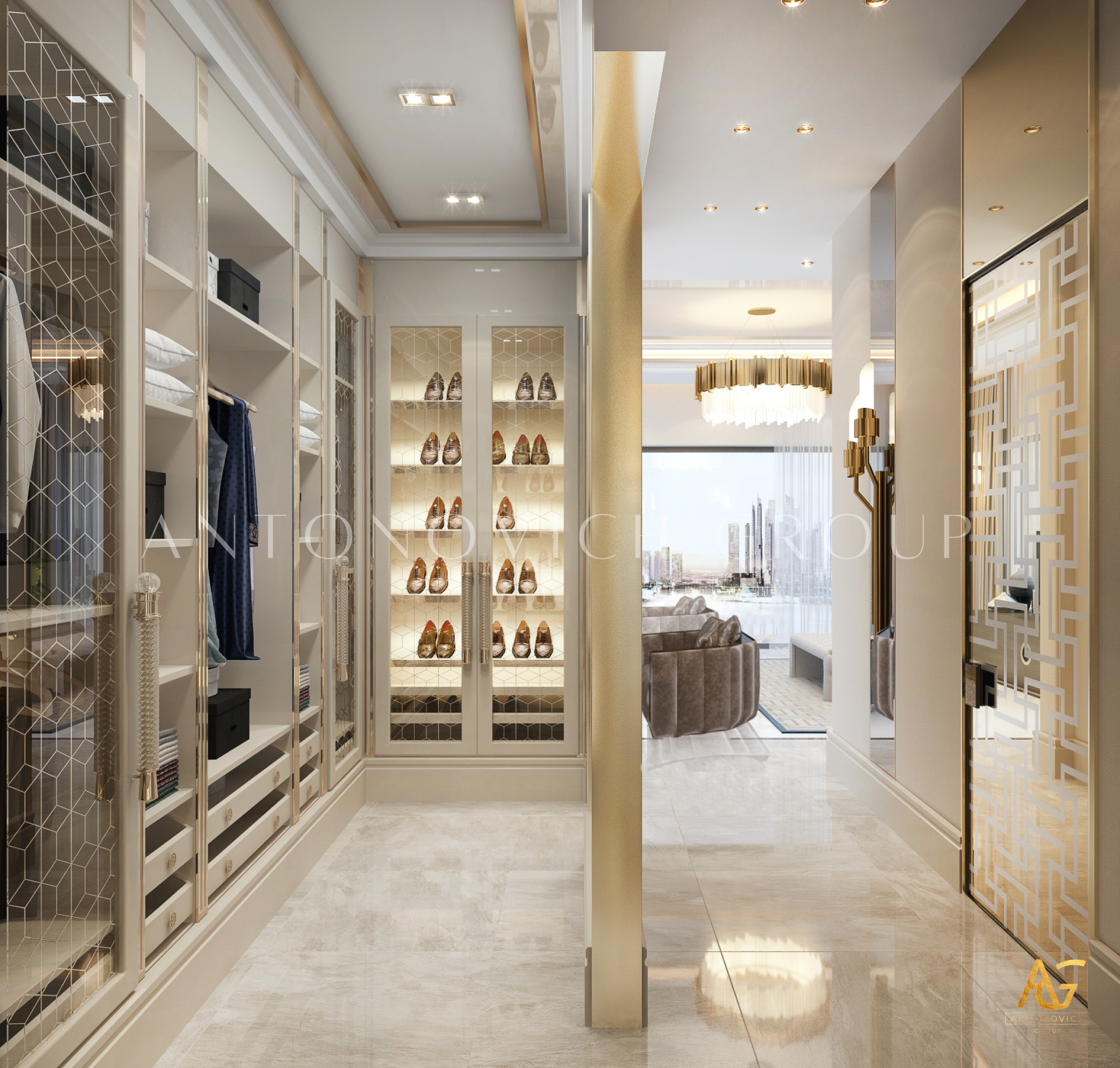Освещение играет ключевую роль в создании элегантной атмосферы виллы. Antonovich Group включила смесь величественных люстр, светодиодных систем освещения и декоративных элементов потолка, тщательно разработанных для подчеркивания архитектурных деталей. Потолки, украшенные гипсовыми работами и золотыми акцентами, добавляют глубину и утонченность каждому пространству.