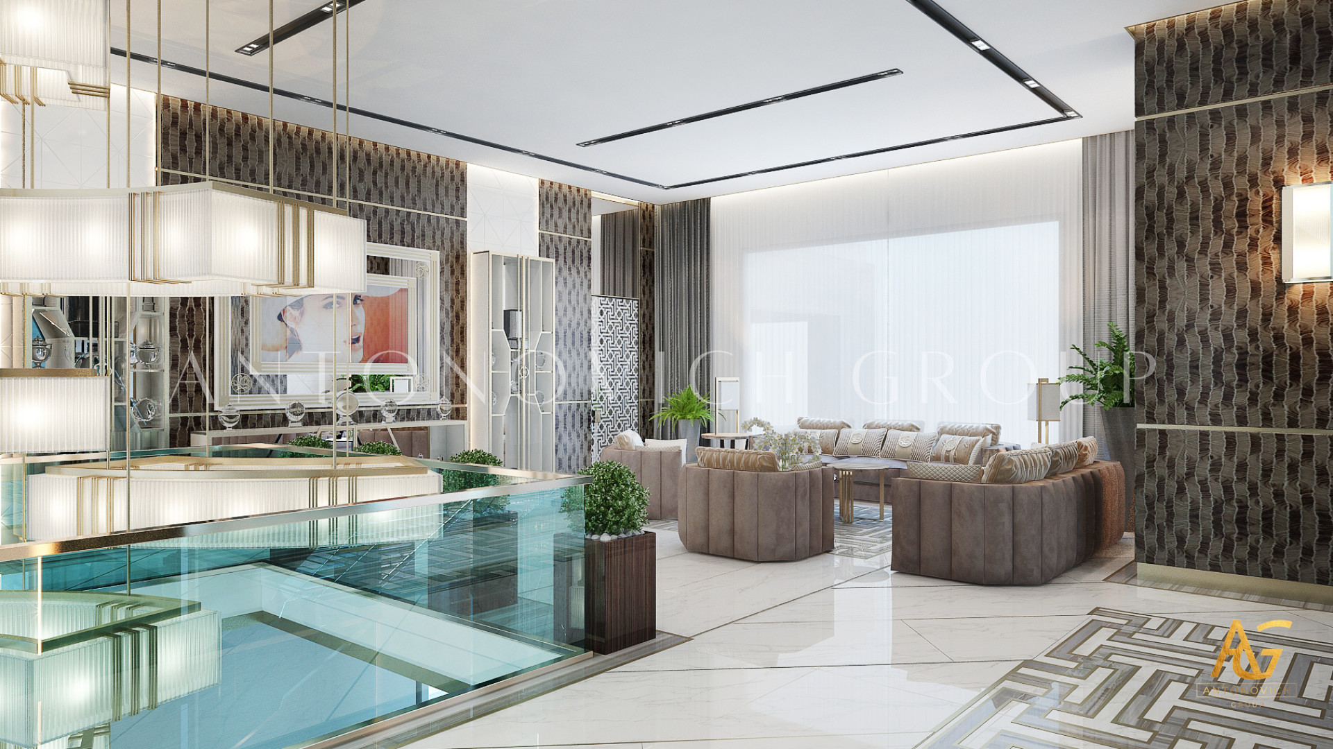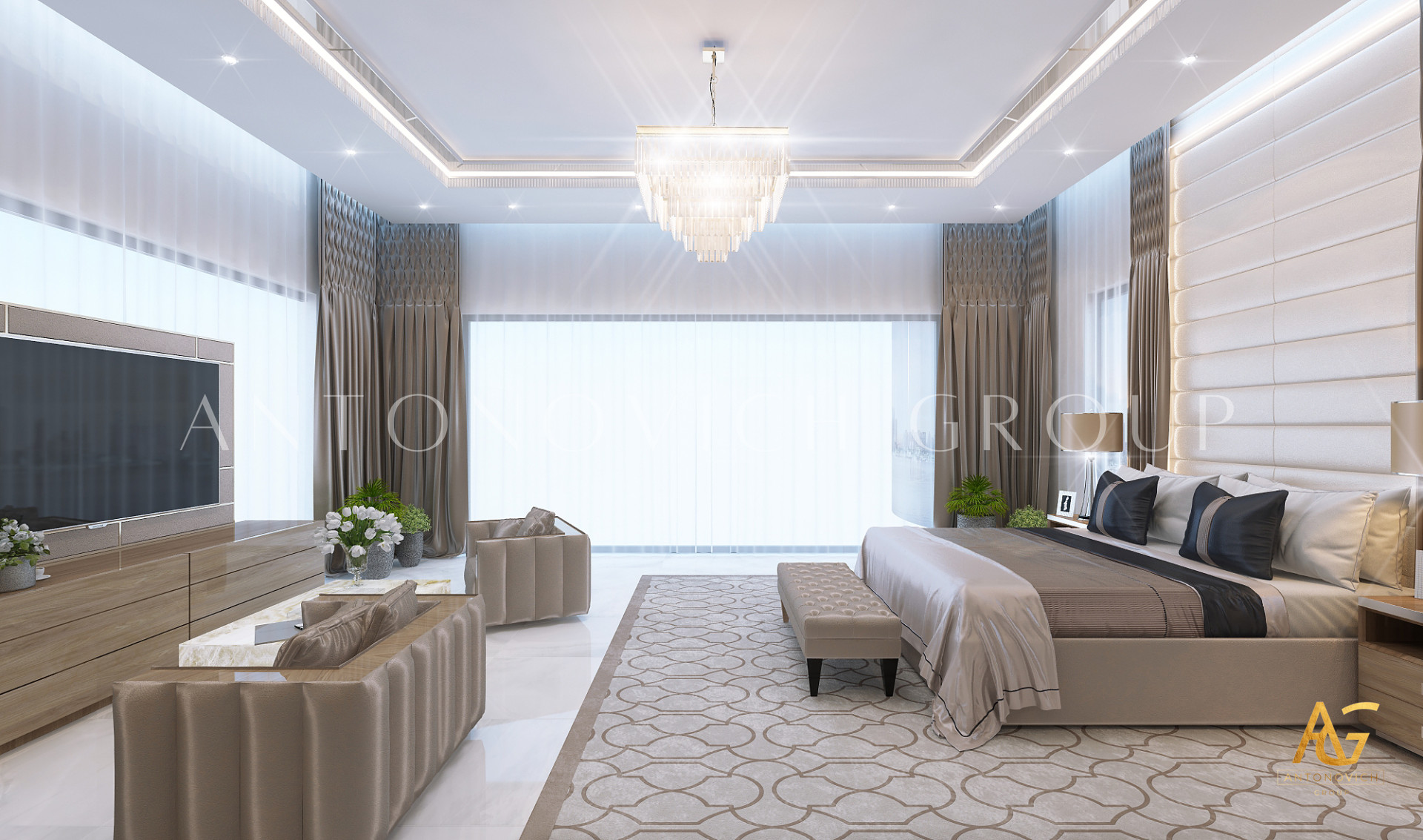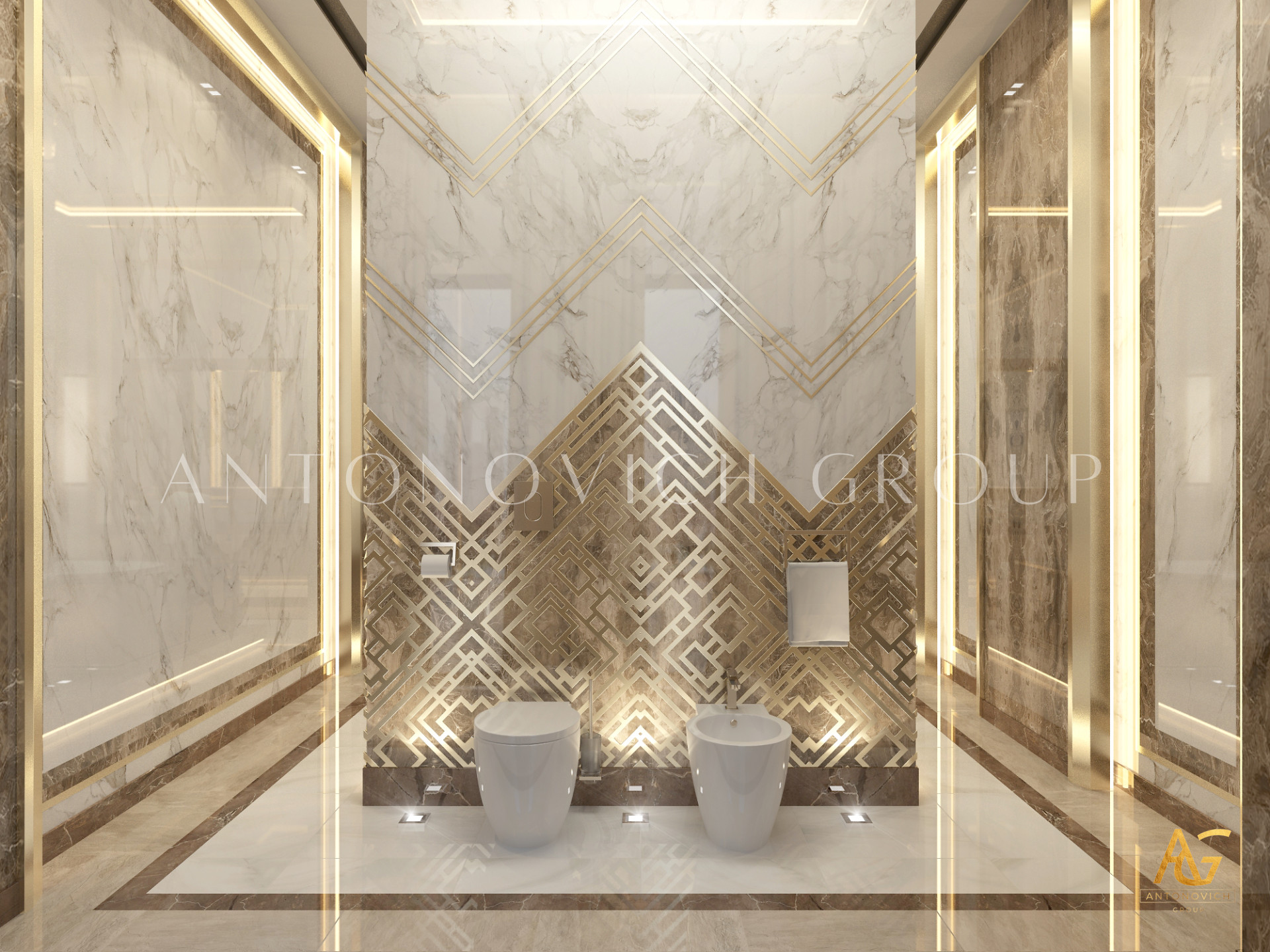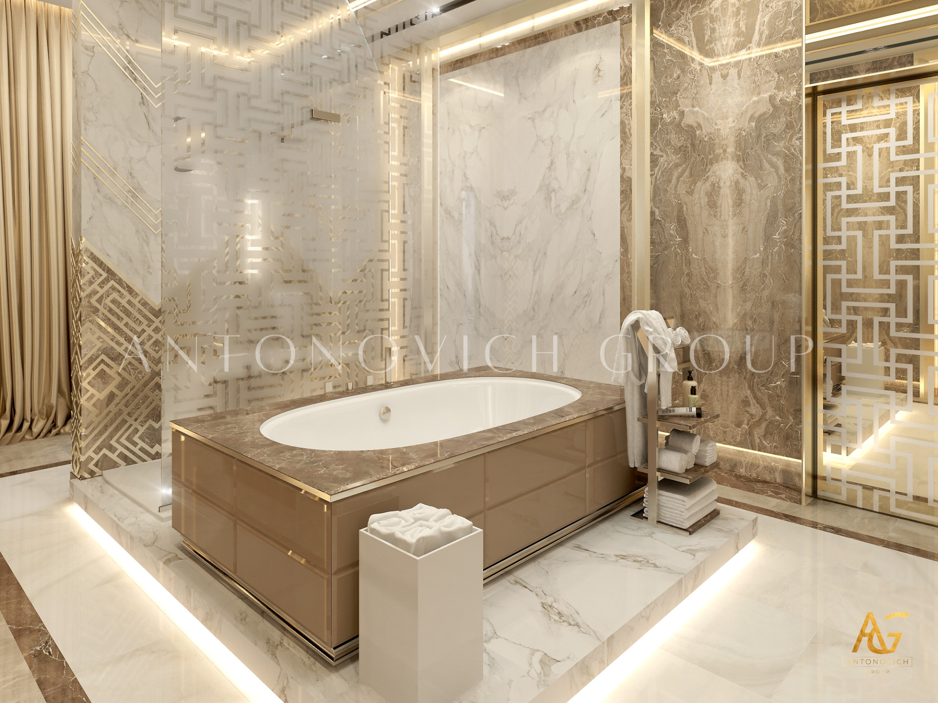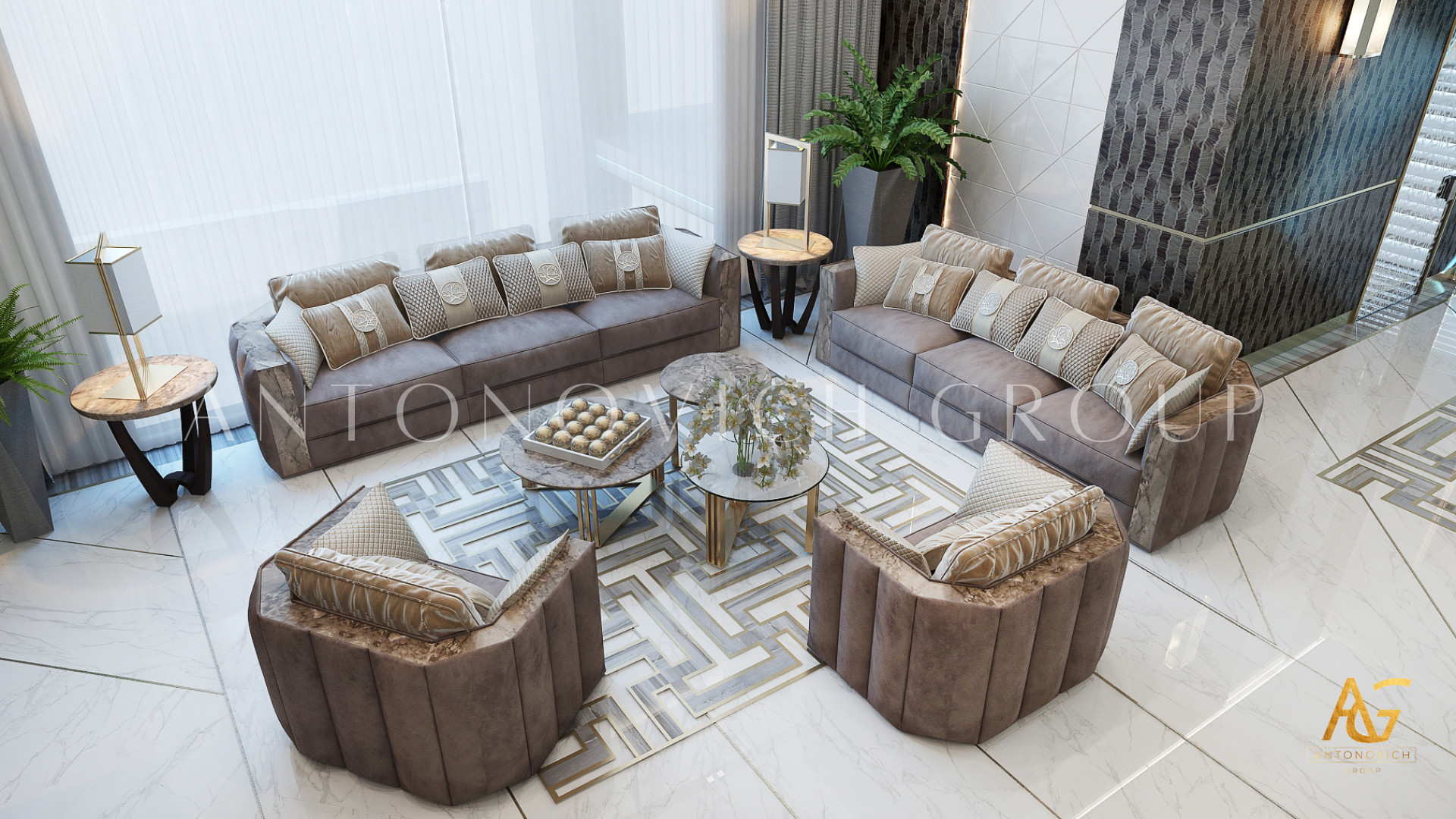 Освещение играет ключевую роль в создании элегантной атмосферы виллы. Antonovich Group включила смесь величественных люстр, светодиодных систем освещения и декоративных элементов потолка, тщательно разработанных для подчеркивания архитектурных деталей. Потолки, украшенные гипсовыми работами и золотыми акцентами, добавляют глубину и утонченность каждому пространству.