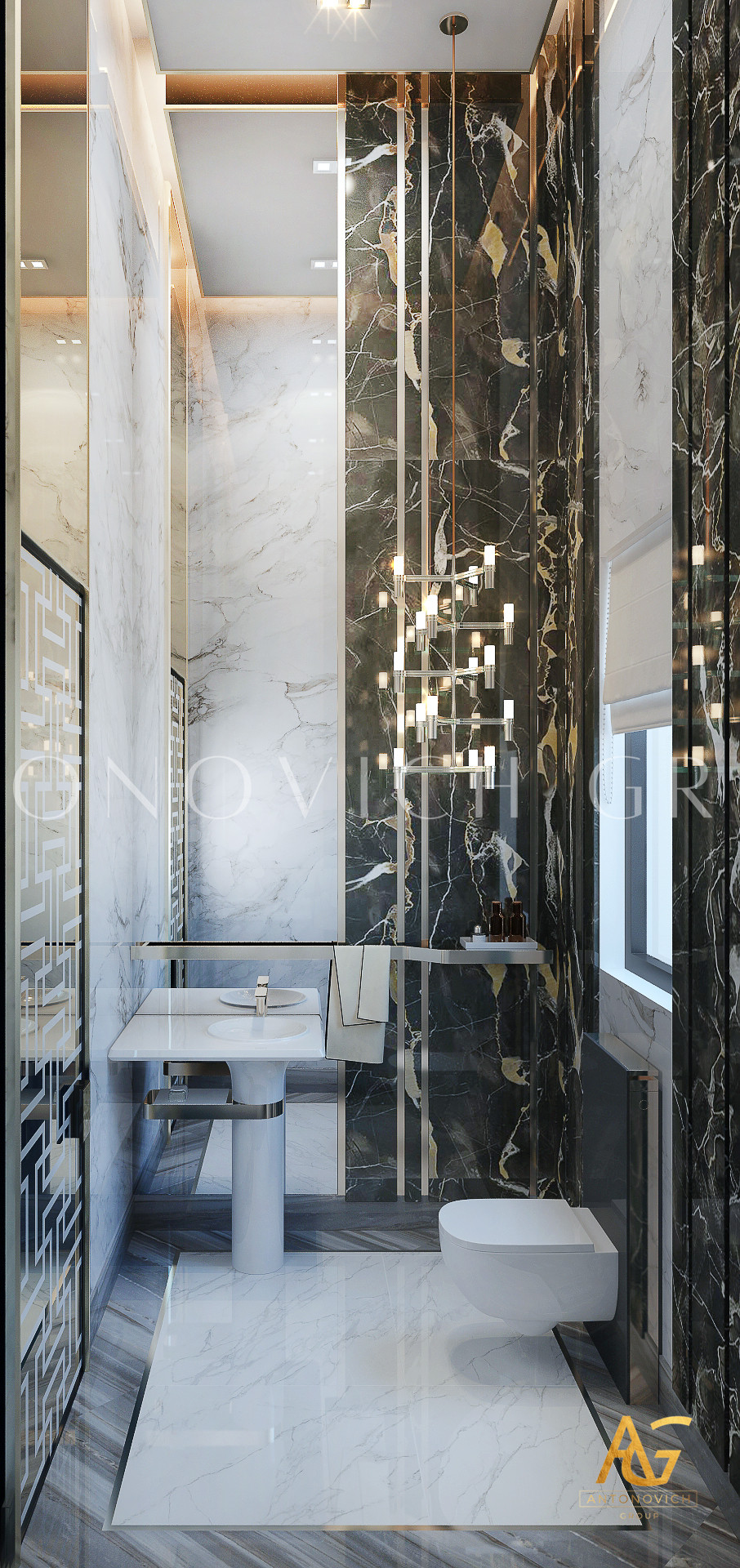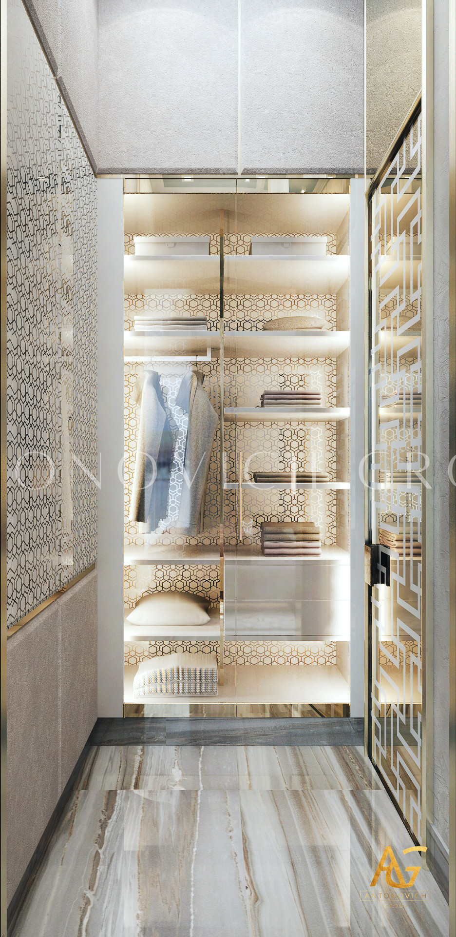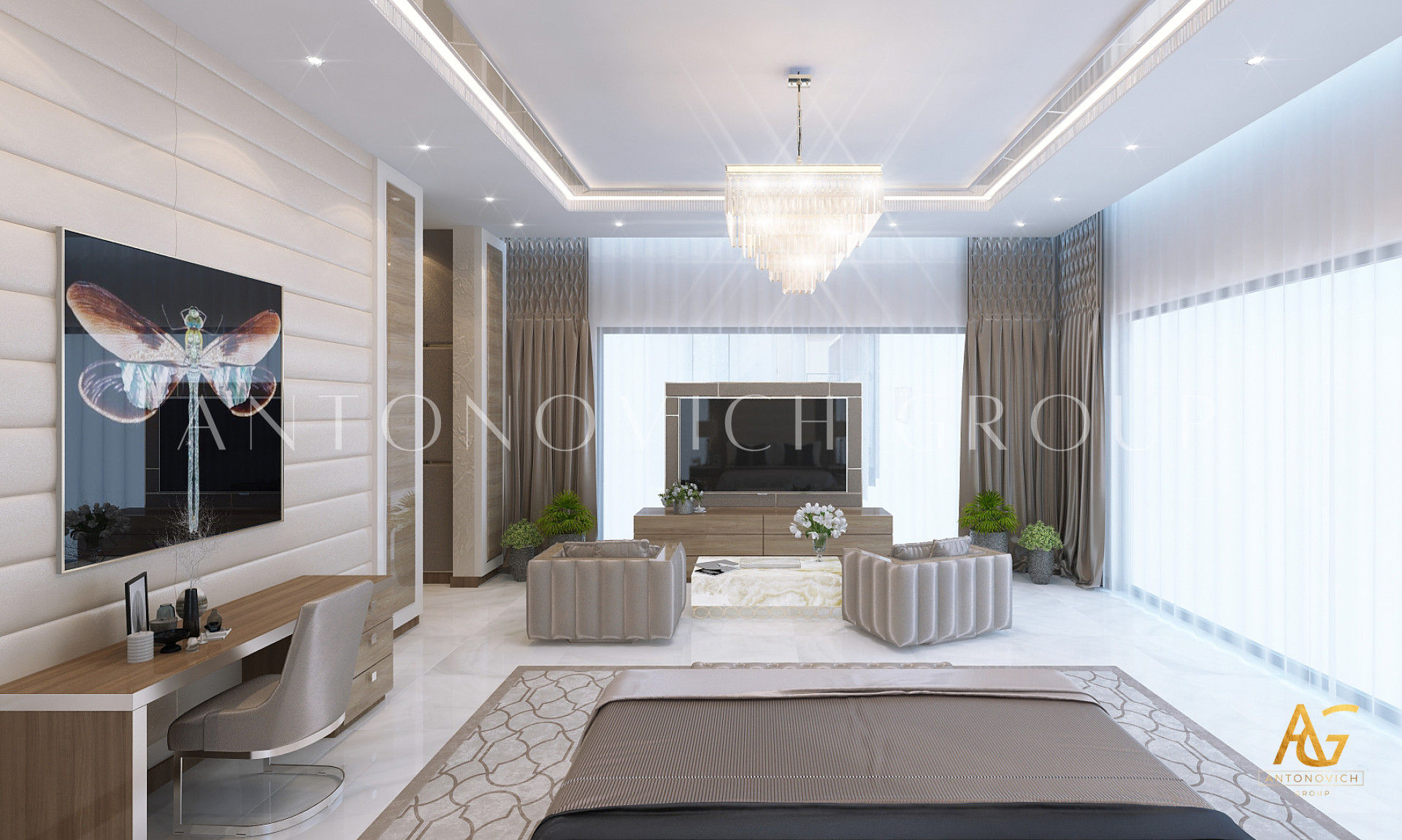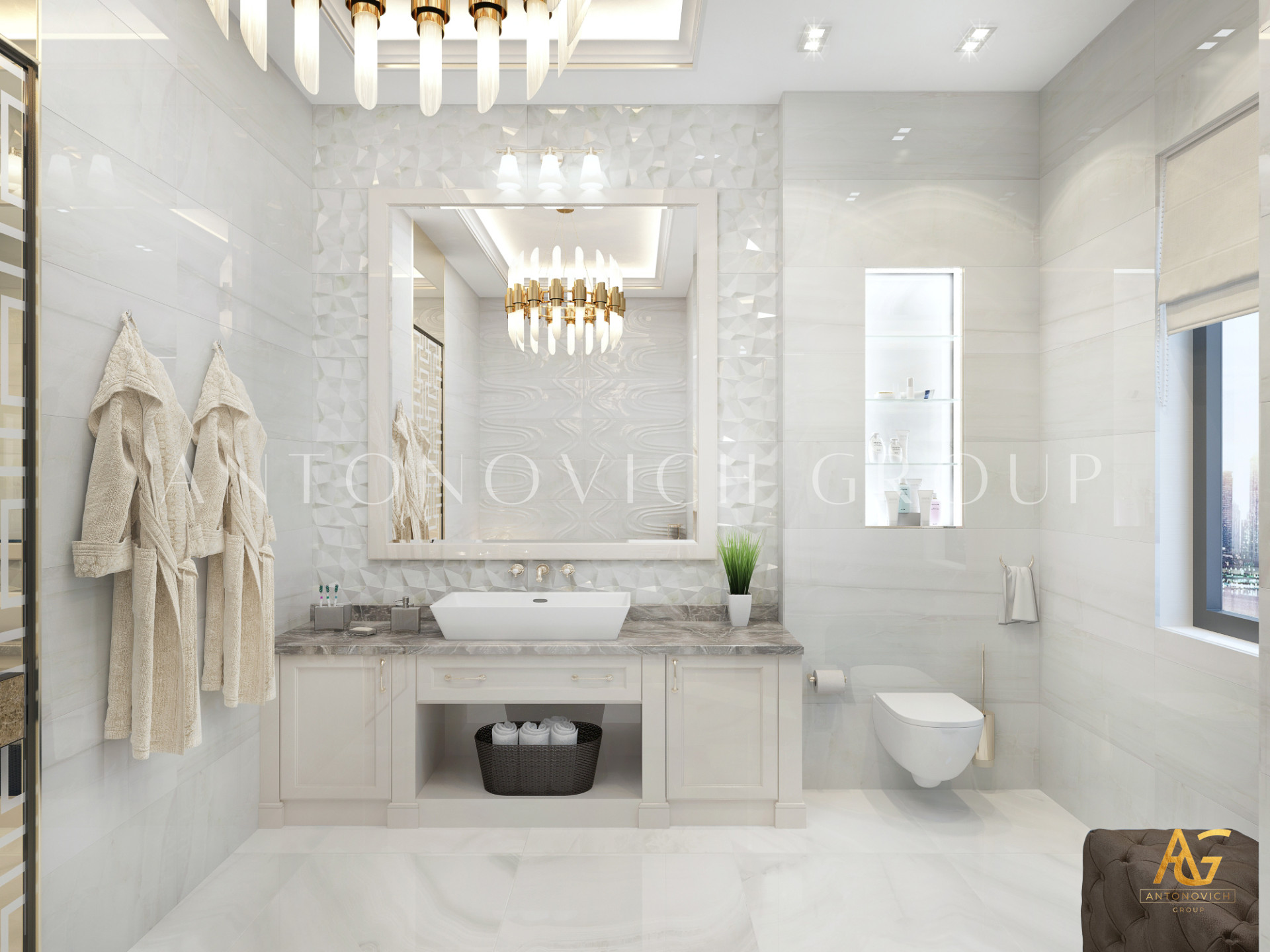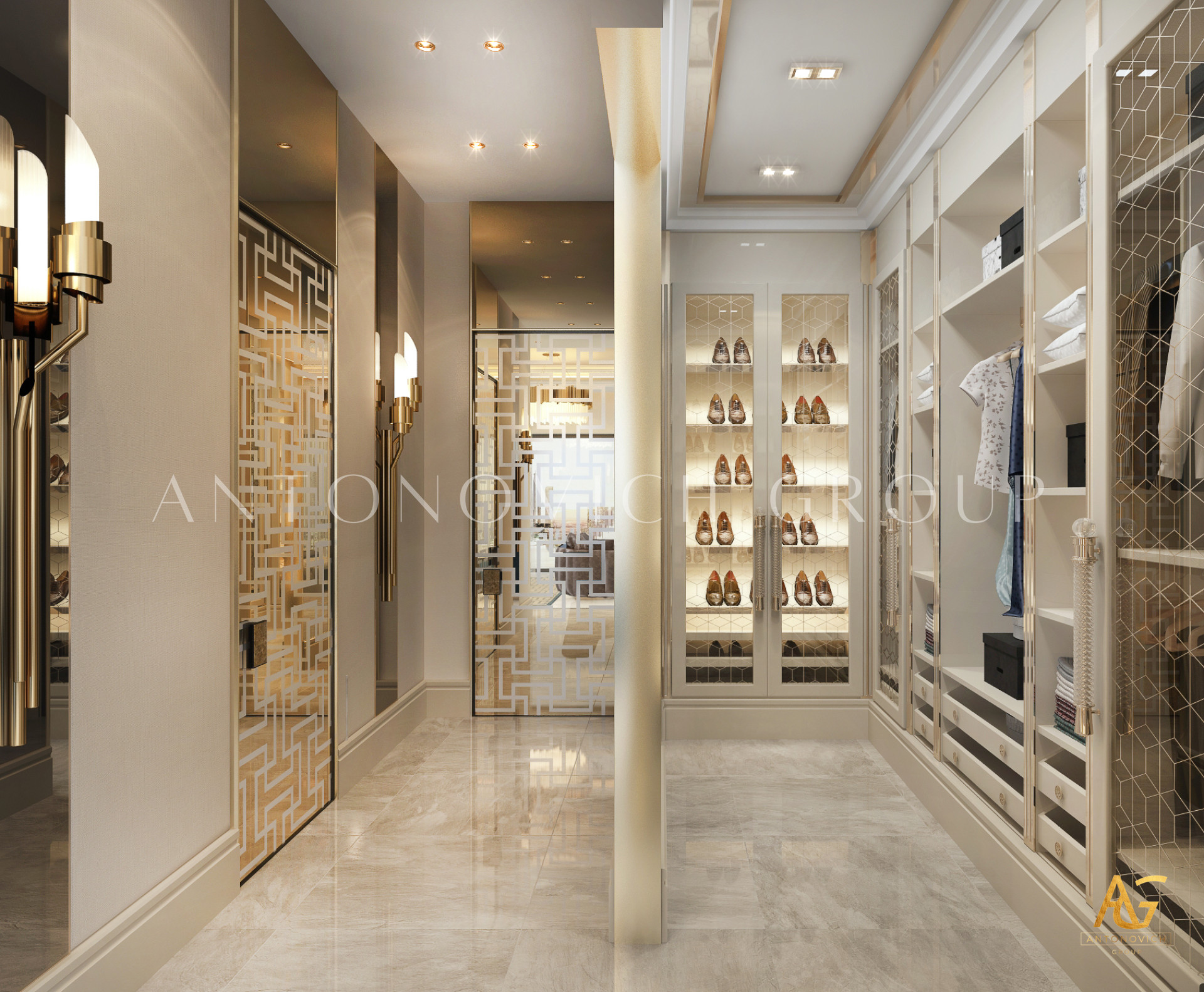 Освещение играет ключевую роль в создании элегантной атмосферы виллы. Antonovich Group включила смесь величественных люстр, светодиодных систем освещения и декоративных элементов потолка, тщательно разработанных для подчеркивания архитектурных деталей. Потолки, украшенные гипсовыми работами и золотыми акцентами, добавляют глубину и утонченность каждому пространству.