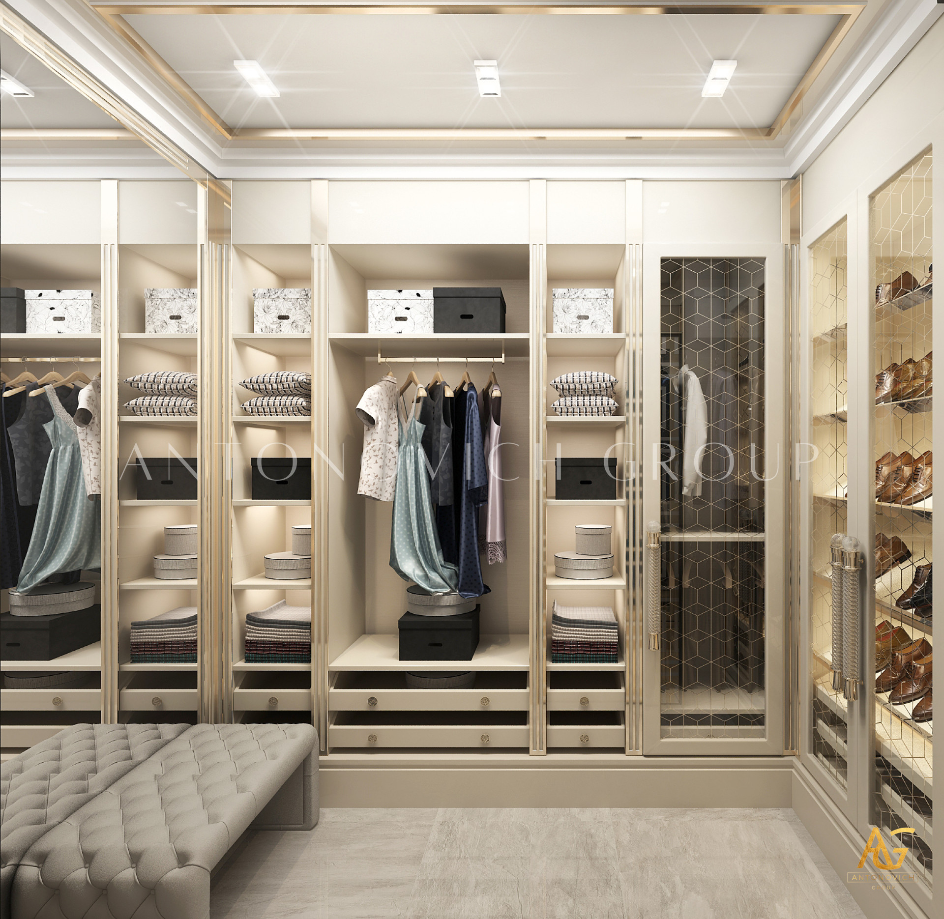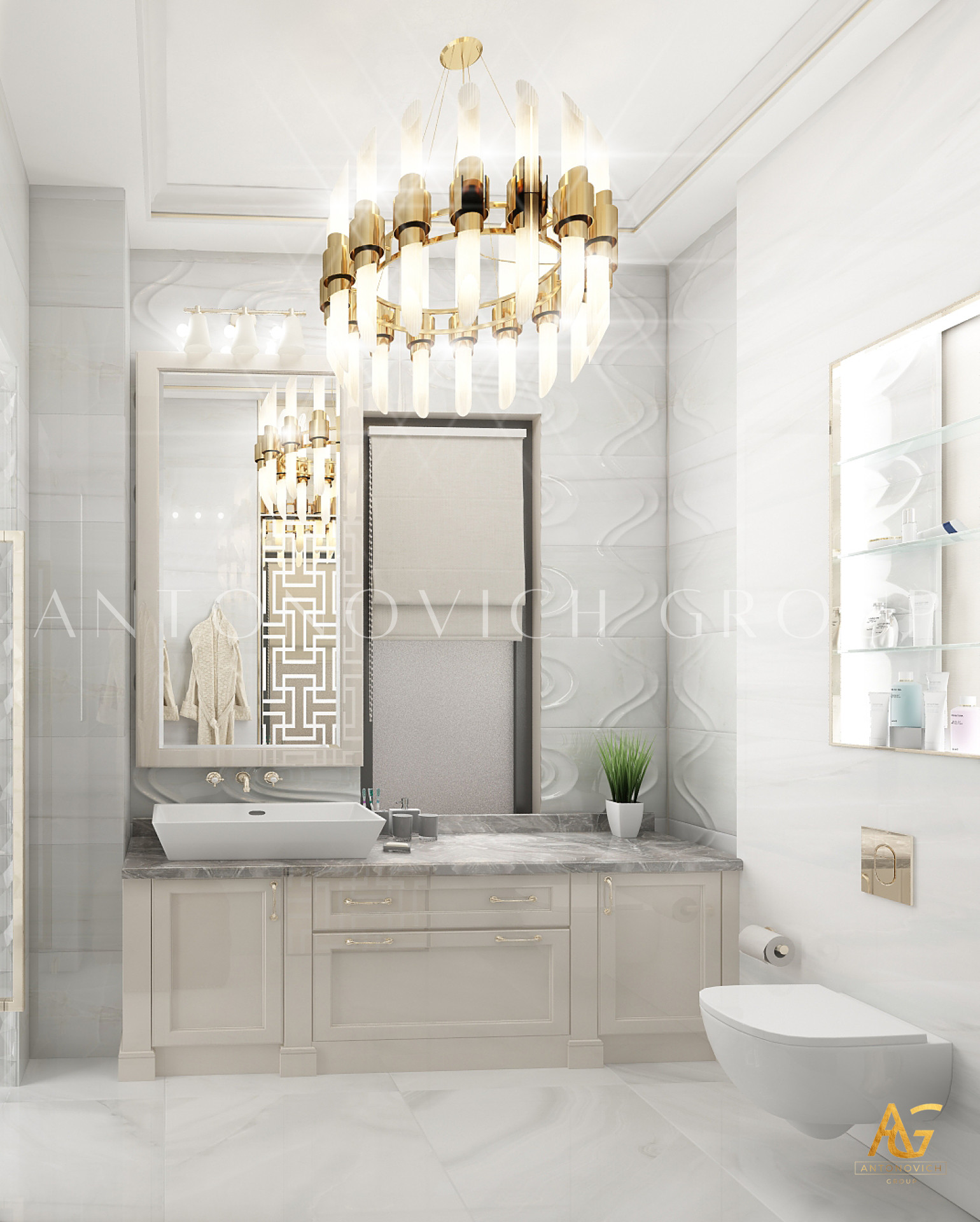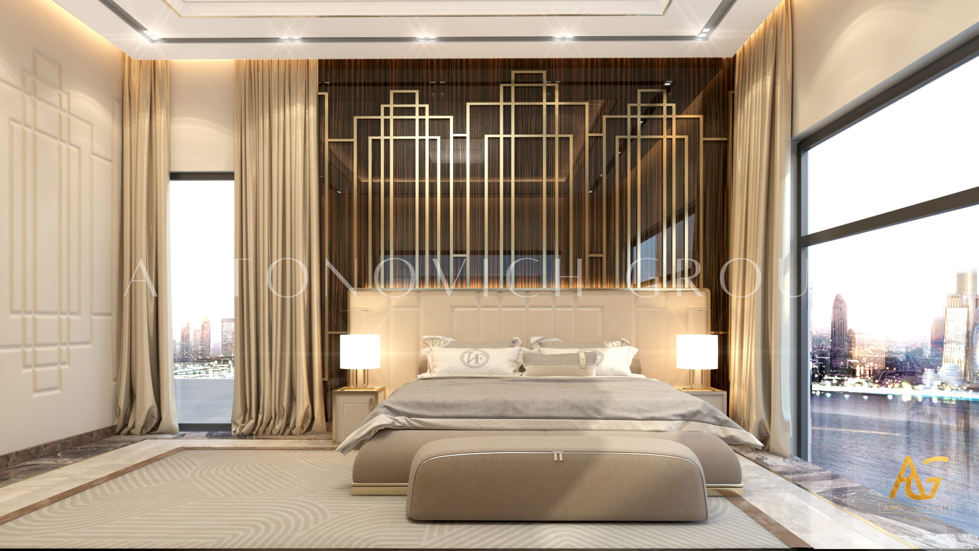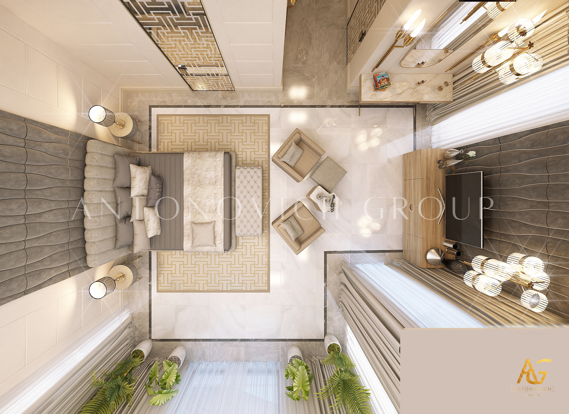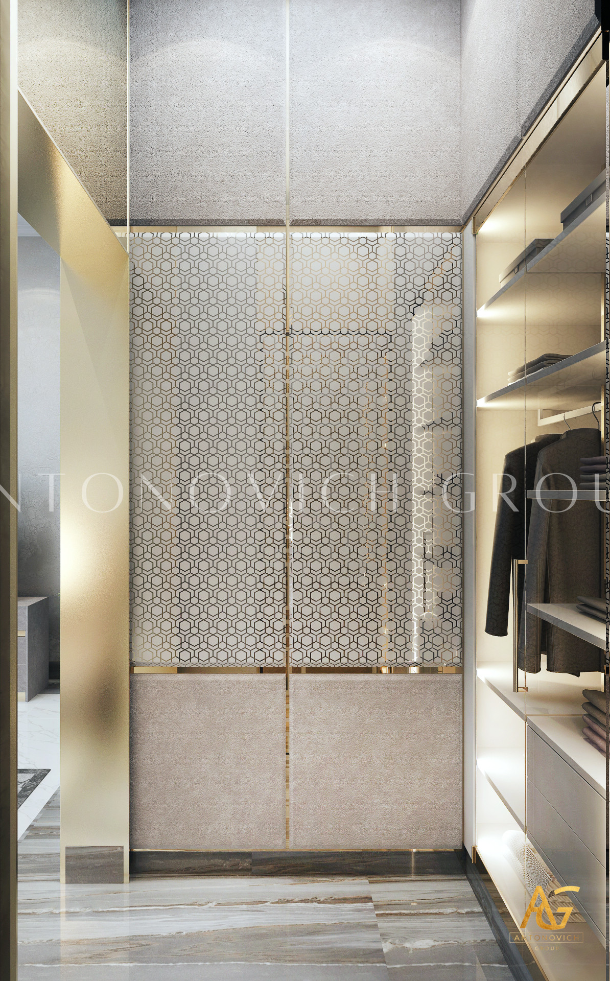 Освещение играет ключевую роль в создании элегантной атмосферы виллы. Antonovich Group включила смесь величественных люстр, светодиодных систем освещения и декоративных элементов потолка, тщательно разработанных для подчеркивания архитектурных деталей. Потолки, украшенные гипсовыми работами и золотыми акцентами, добавляют глубину и утонченность каждому пространству.