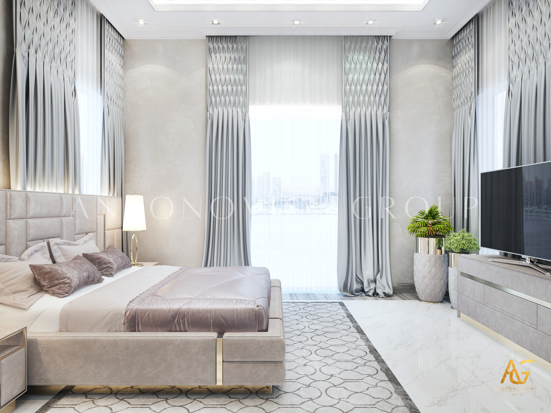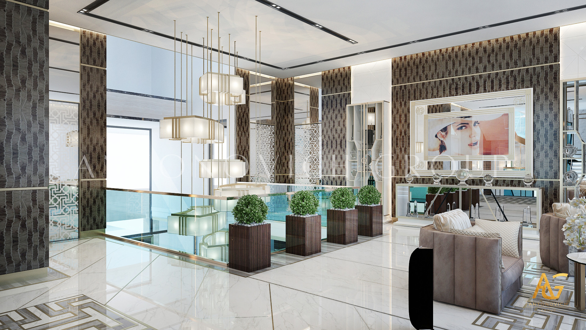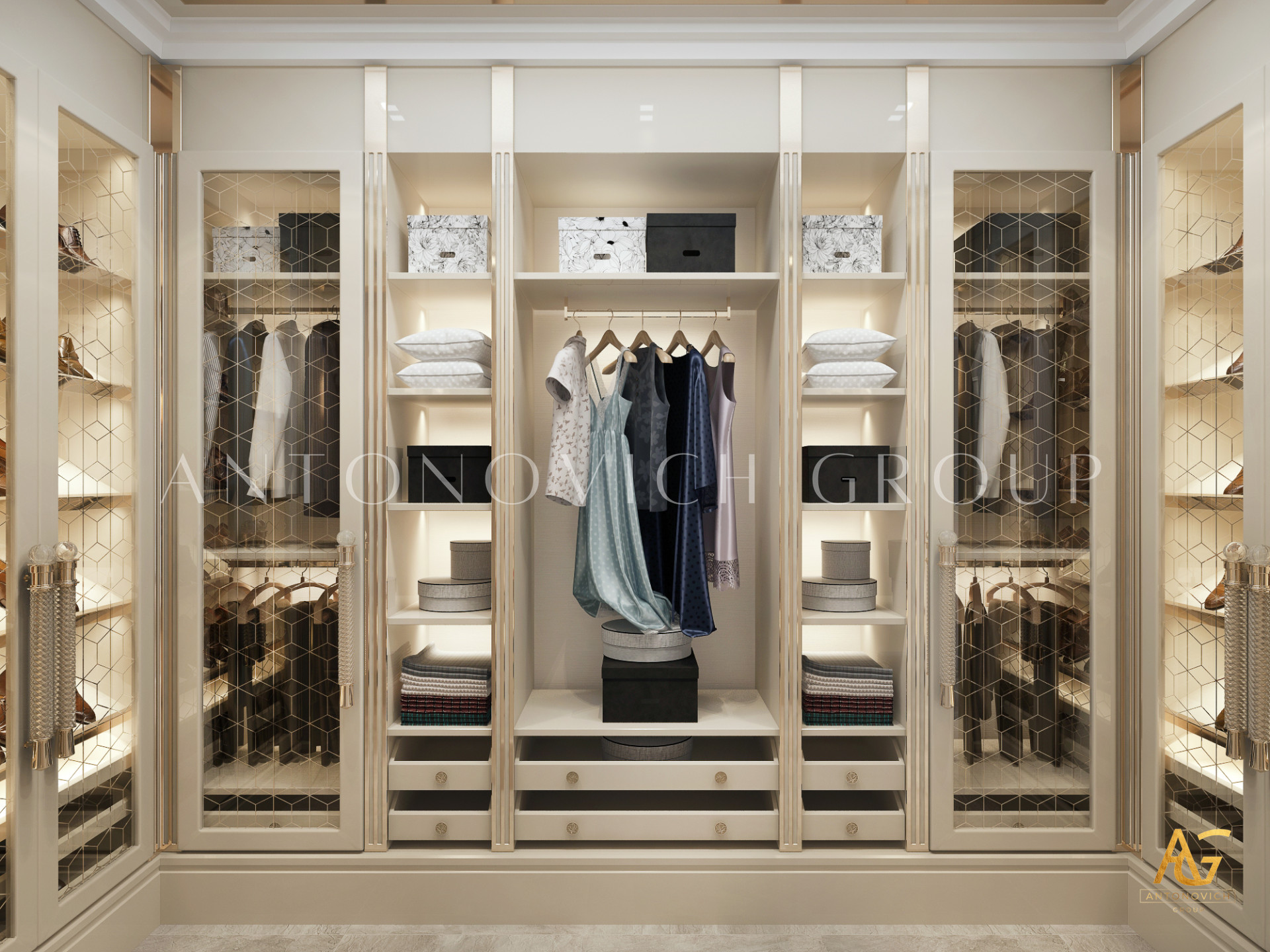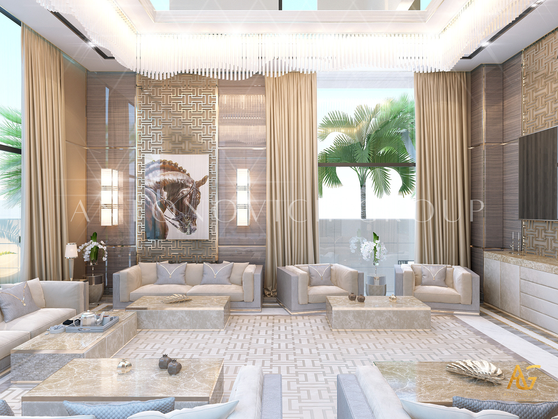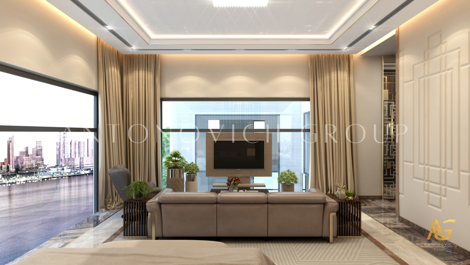 Освещение играет ключевую роль в создании элегантной атмосферы виллы. Antonovich Group включила смесь величественных люстр, светодиодных систем освещения и декоративных элементов потолка, тщательно разработанных для подчеркивания архитектурных деталей. Потолки, украшенные гипсовыми работами и золотыми акцентами, добавляют глубину и утонченность каждому пространству.