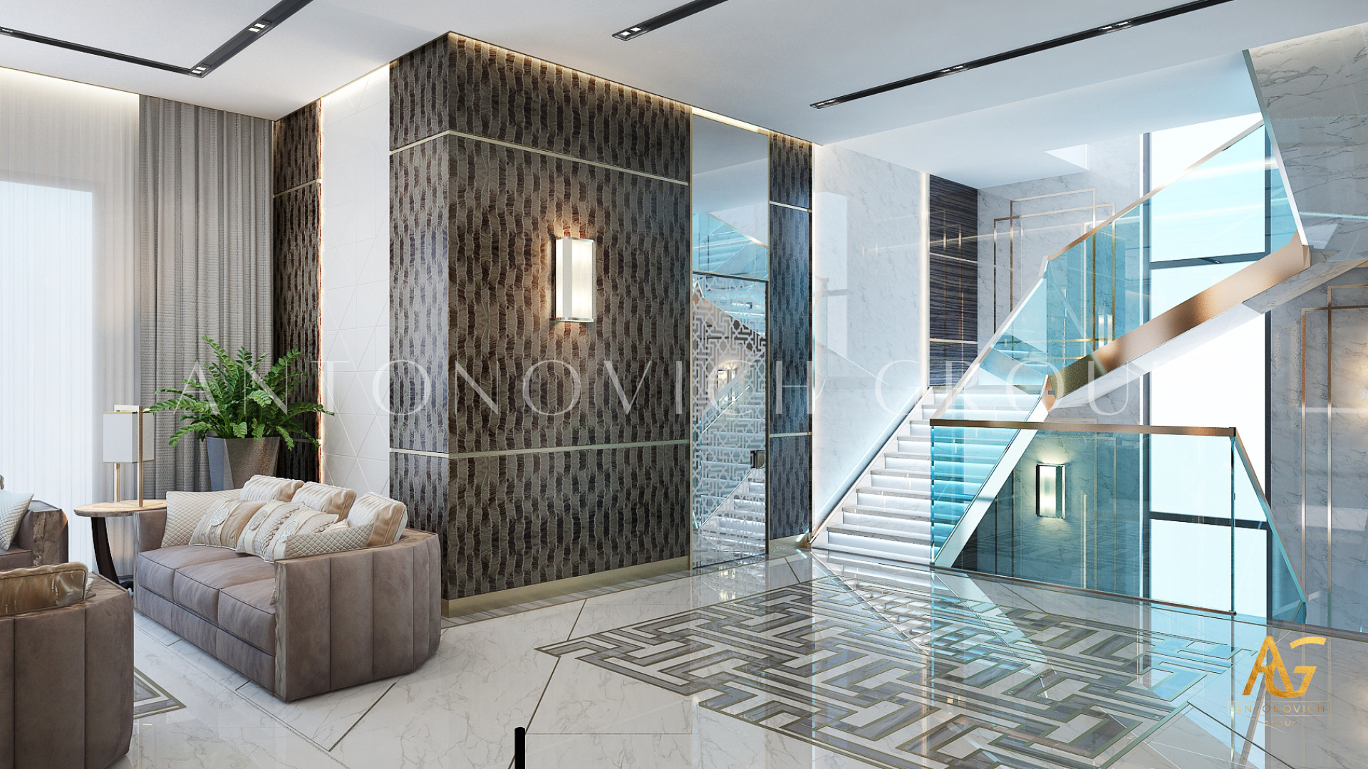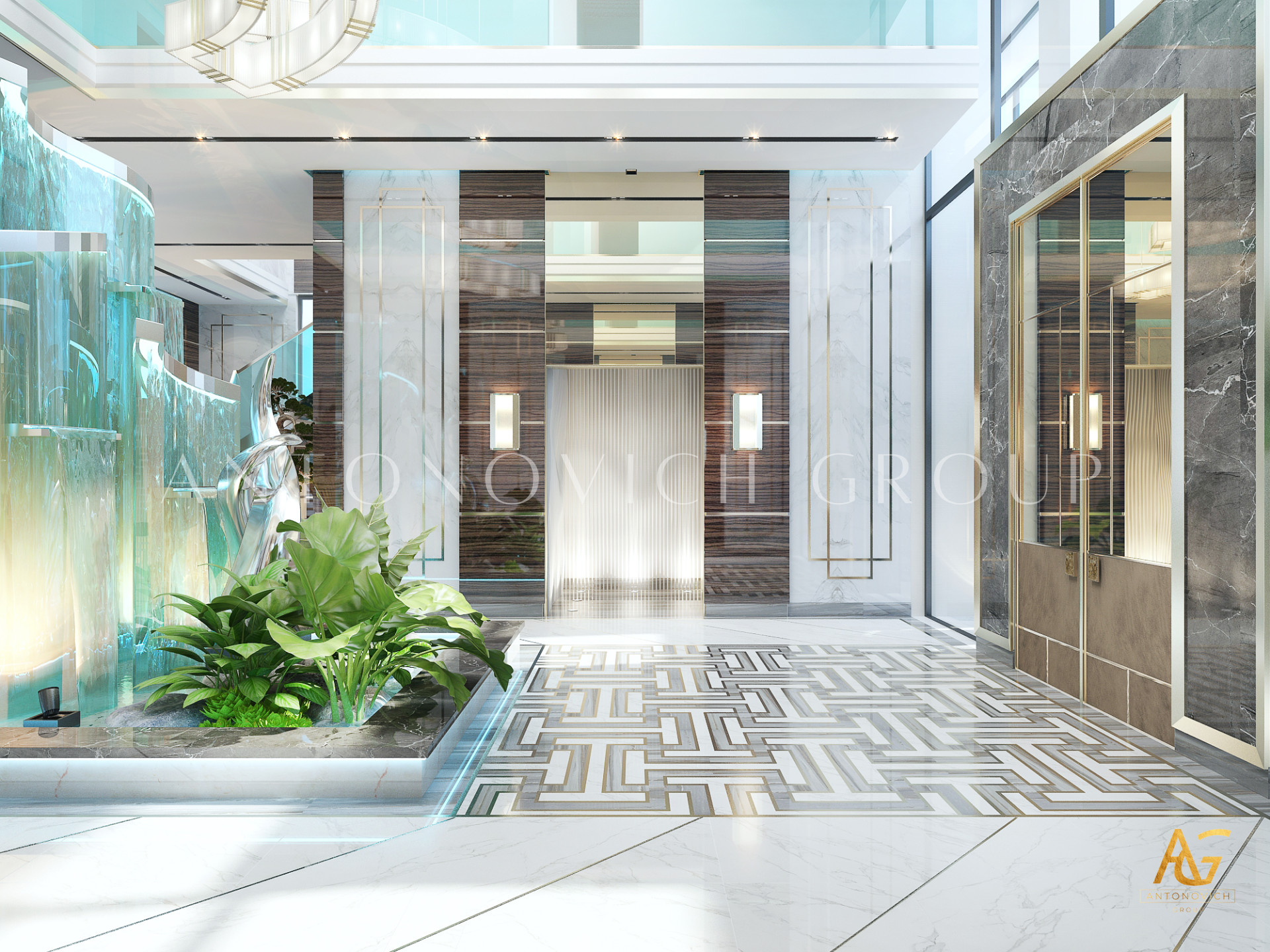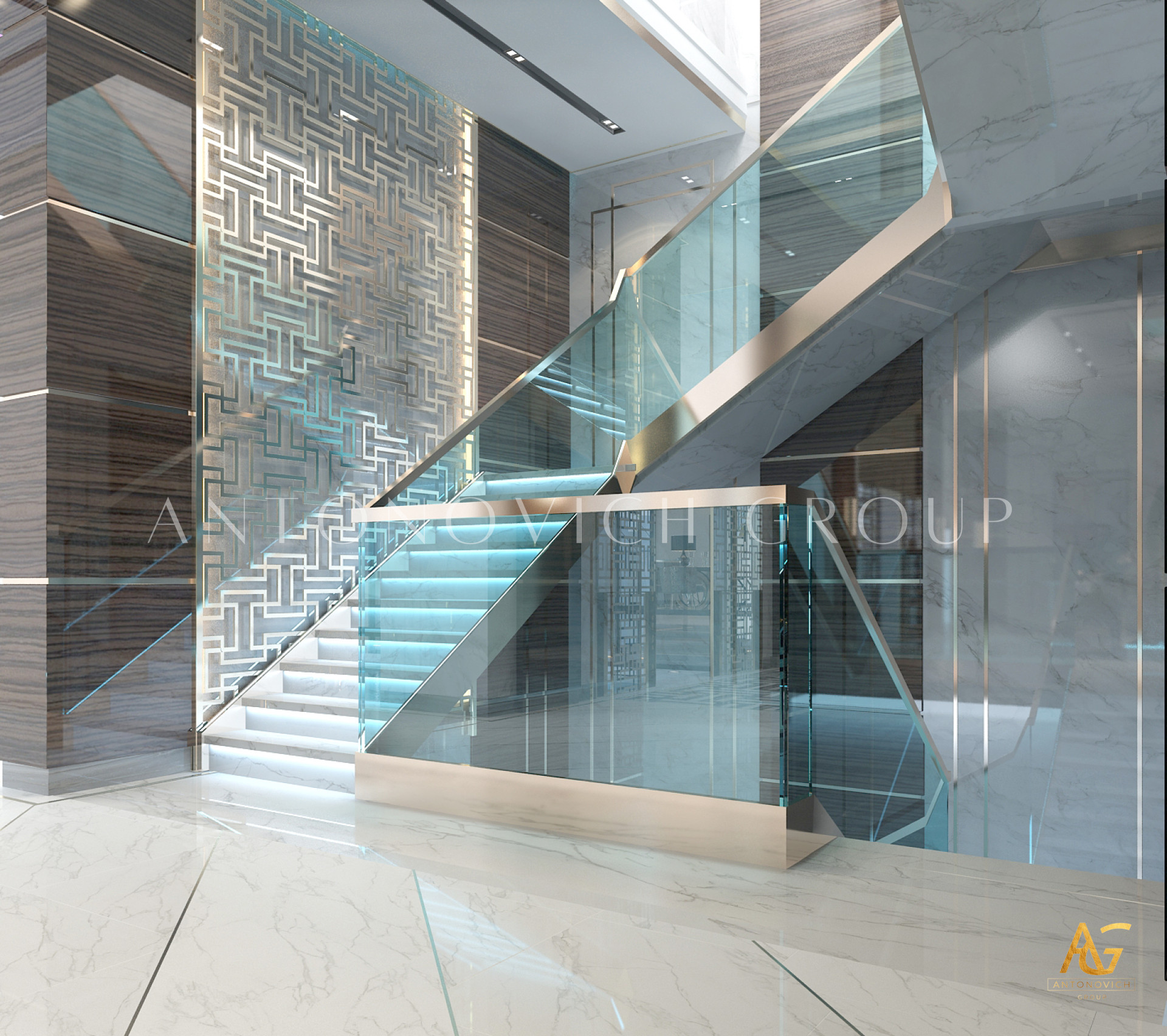 Начало этой истории современного дизайна интерьера дома впечатляет и надолго остается в памяти. Наши клиенты хотели получить необычный проект в современном стиле, который бы соответствовал новейшим модным тенденциям. И их дом стал предметом гордости и восхищения. Особое внимание дизайнеры интерьера уделили холлу. Комбинируя определенные материалы декора, оттенки и элементы освещения, им удалось создать очень многогранное пространство с эффектом бесконечности и новизны. Современный дизайн интерьера элитной недвижимости от студии Luxury Antonovich Design всегда является эксклюзивным решением в определенном стиле. В этом проекте декор стен, дизайн полов и украшение потолка многогранны и имеют определенные философские оттенки. Здесь авторы проекта искусно сочетали тепло природы и акценты в стиле хай-тек.