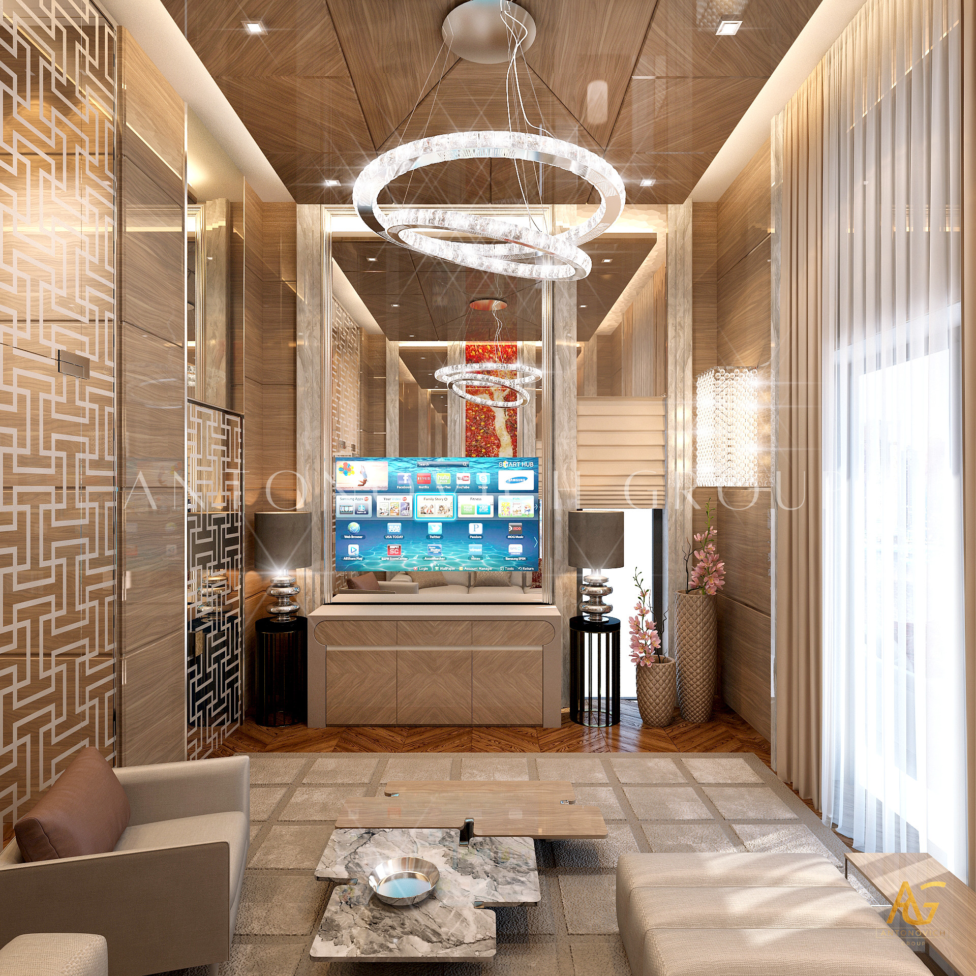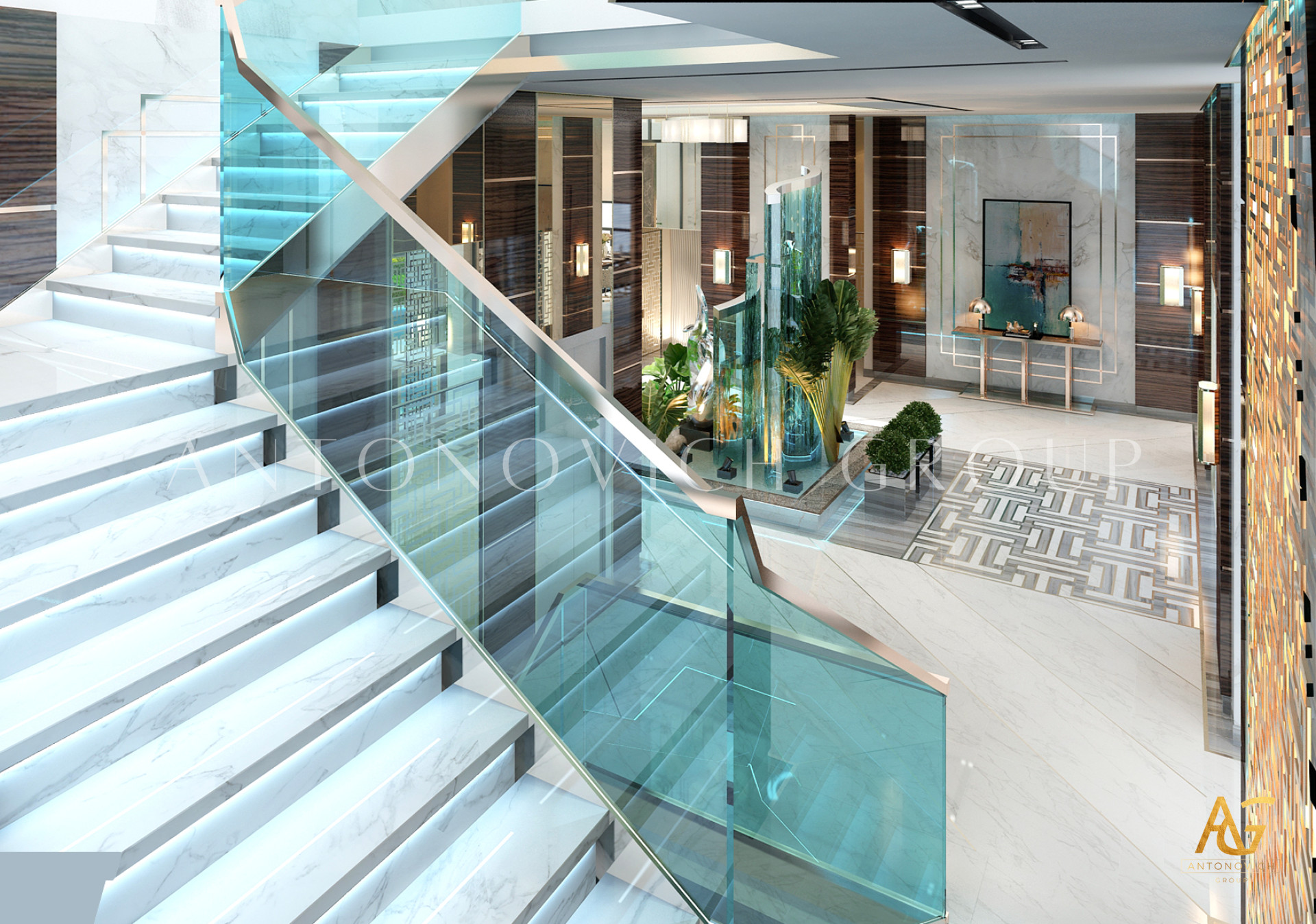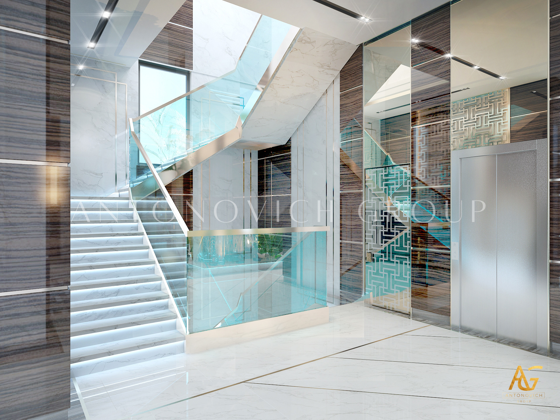 Начало этой истории современного дизайна интерьера дома впечатляет и надолго остается в памяти. Наши клиенты хотели получить необычный проект в современном стиле, который бы соответствовал новейшим модным тенденциям. И их дом стал предметом гордости и восхищения. Особое внимание дизайнеры интерьера уделили холлу. Комбинируя определенные материалы декора, оттенки и элементы освещения, им удалось создать очень многогранное пространство с эффектом бесконечности и новизны. Современный дизайн интерьера элитной недвижимости от студии Luxury Antonovich Design всегда является эксклюзивным решением в определенном стиле. В этом проекте декор стен, дизайн полов и украшение потолка многогранны и имеют определенные философские оттенки. Здесь авторы проекта искусно сочетали тепло природы и акценты в стиле хай-тек.