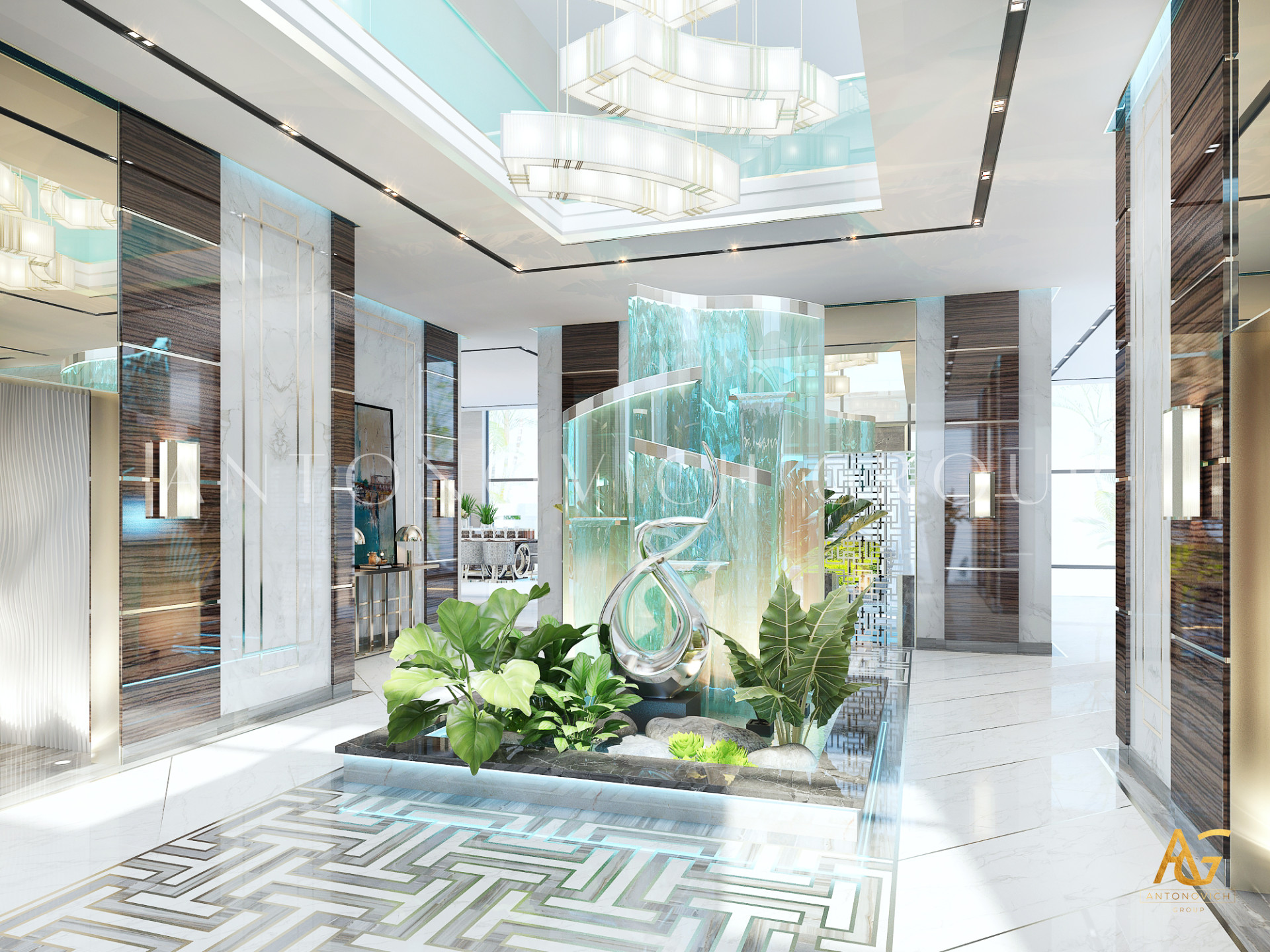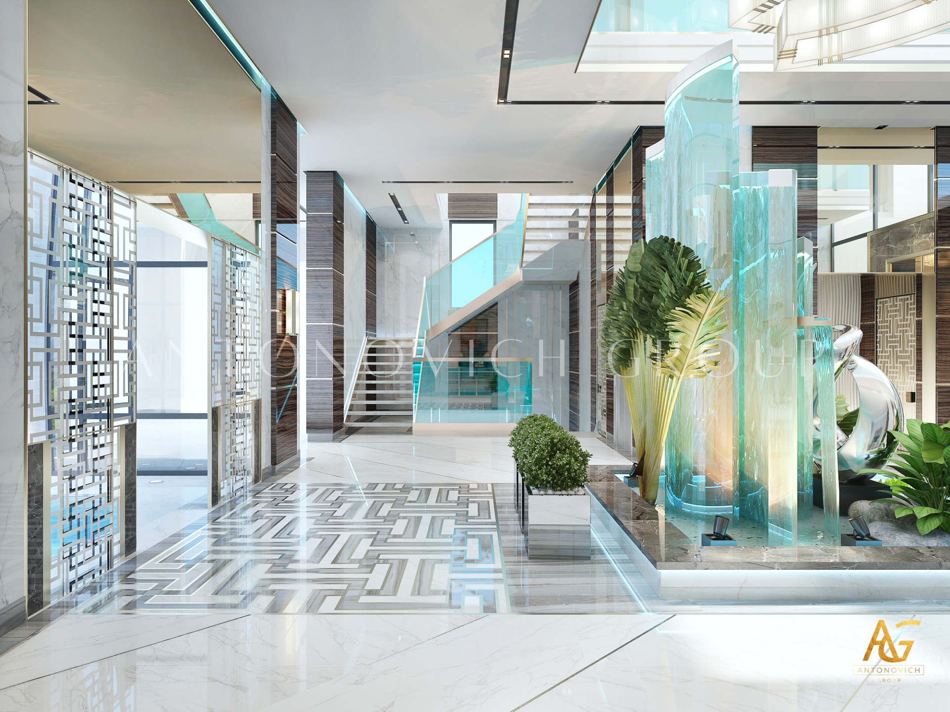 Этот дизайн виллы открывает новые возможности для творчества и рождения блестящих идей. Эпицентром красоты холла становится оригинальная композиция из стекла с имитацией текущей воды. Дополнения в виде полированной нержавеющей стали и освещение с помощью современных прожекторов придали этой скульптурной композиции необычайно красивый и стильный вид. Современная архитектура и дизайн — это концепции, которые тесно взаимосвязаны. Дизайнеры интерьера выгодно подчеркивают архитектурные особенности дома. Дизайн интерьера в современном стиле — это четкая геометрия форм и линий, а также абсолютная гармония. В декоре стен и полов великолепно сочетаются серый и белый мрамор с красивыми узорами природных жилок. Линии из нержавеющей стали и акценты освещения делают интерьер более выразительным.
