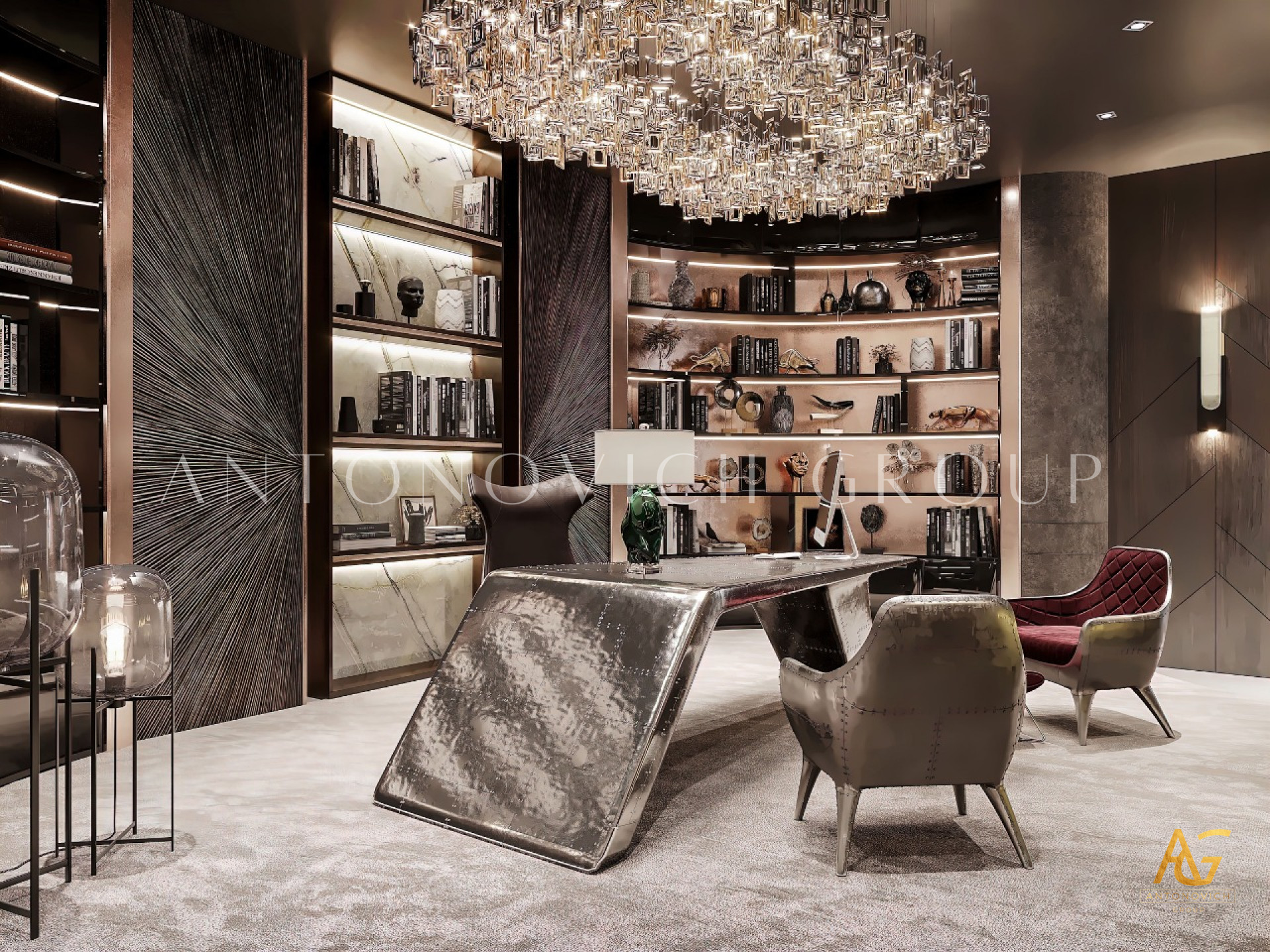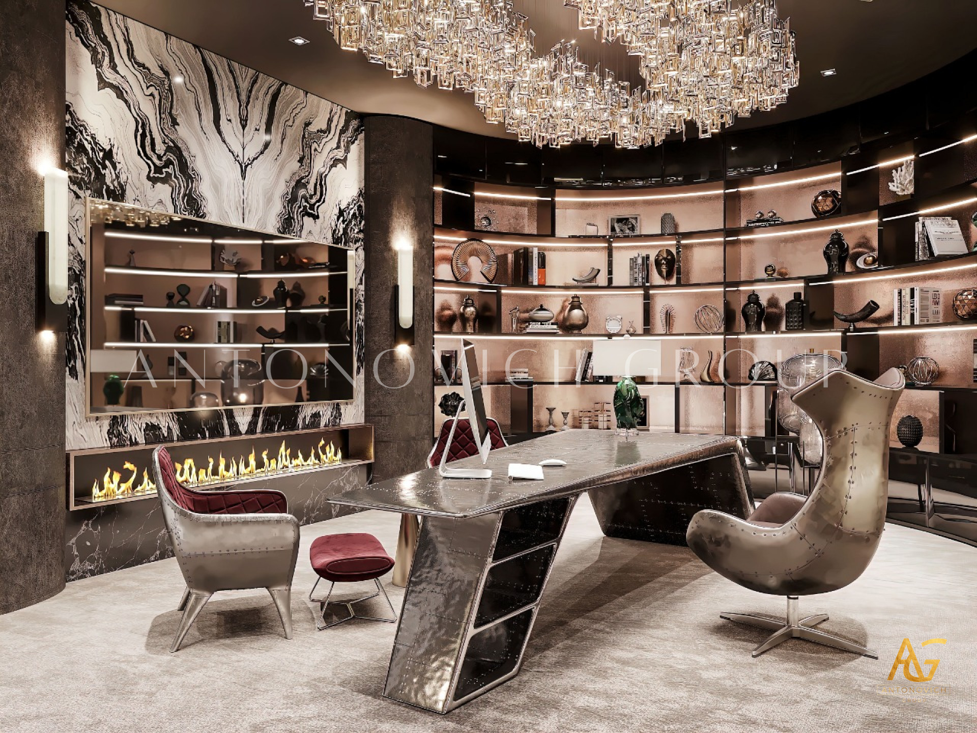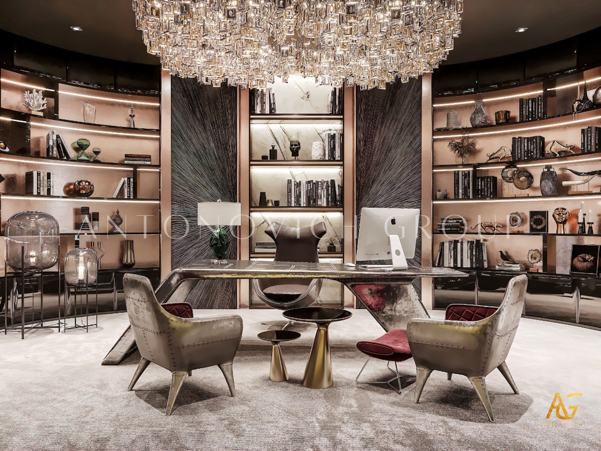 Изысканная концепция офисного интерьера от Антонович Дизайн (Antonovich Design). Мы создаём самые утончённые решения для дизайн‑проектов офисов в Дубае. Используя разнообразные художественные и благородные материалы, Антонович Дизайн формирует эксклюзивную атмосферу с ярким чувством креатива и элегантной компоновкой пространства. Компания — одна из ведущих студий по дизайну интерьеров в Дубае и ОАЭ, признанная поставщиком комплексных решений для офисных интерьеров. Команда предлагает полный цикл работ по дизайну и отделке, подчёркивая уникальность стиля и отражая характер и образ жизни владельца. Когда речь идёт об офисном интерьере, команда Антонович Дизайн расширяет возможности, чтобы реализовать максимально выразительные проекты.