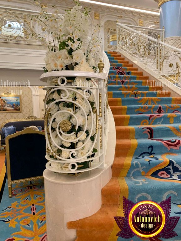 В проекте сочетаются: дизайн лестницы в частном доме, мраморная лестница с ковровой дорожкой, кованые перила и элементы декора, лестница в стиле классика и модерн, ковровая дорожка с цветочным узором, ступени из натурального камня, воздушный интерьер с плавными линиями, гармоничное сочетание теплых и холодных материалов, лестница для загородного дома, ступени с декоративным ковровым покрытием, проект лестницы с эксклюзивным декором, обработка камня с использованием инновационных технологий.
