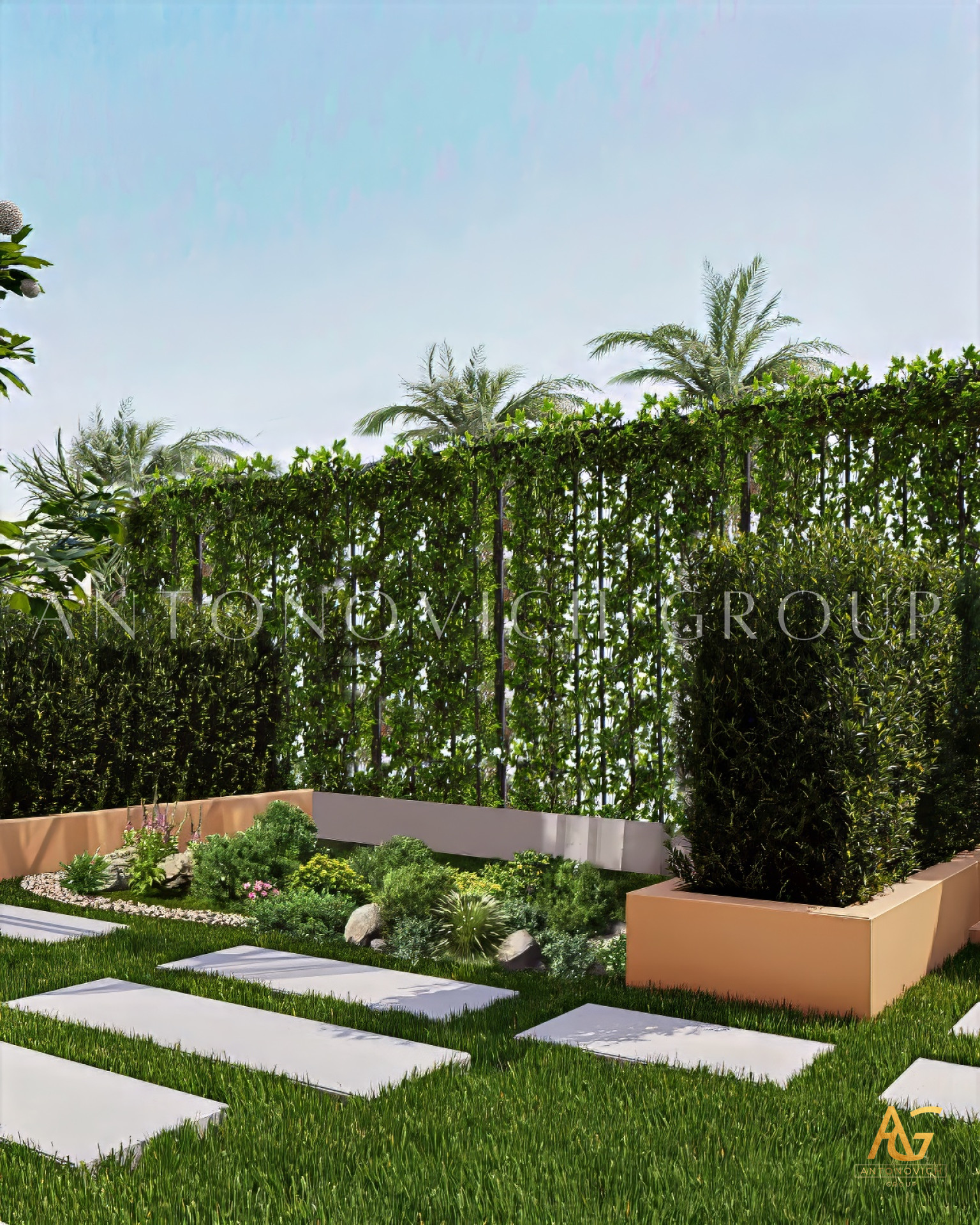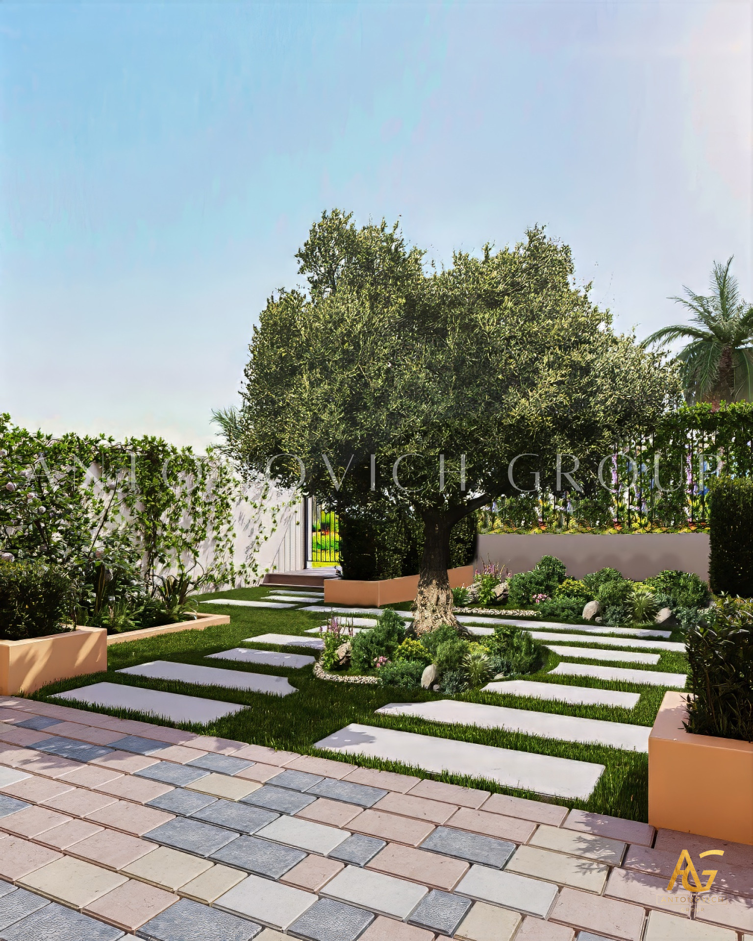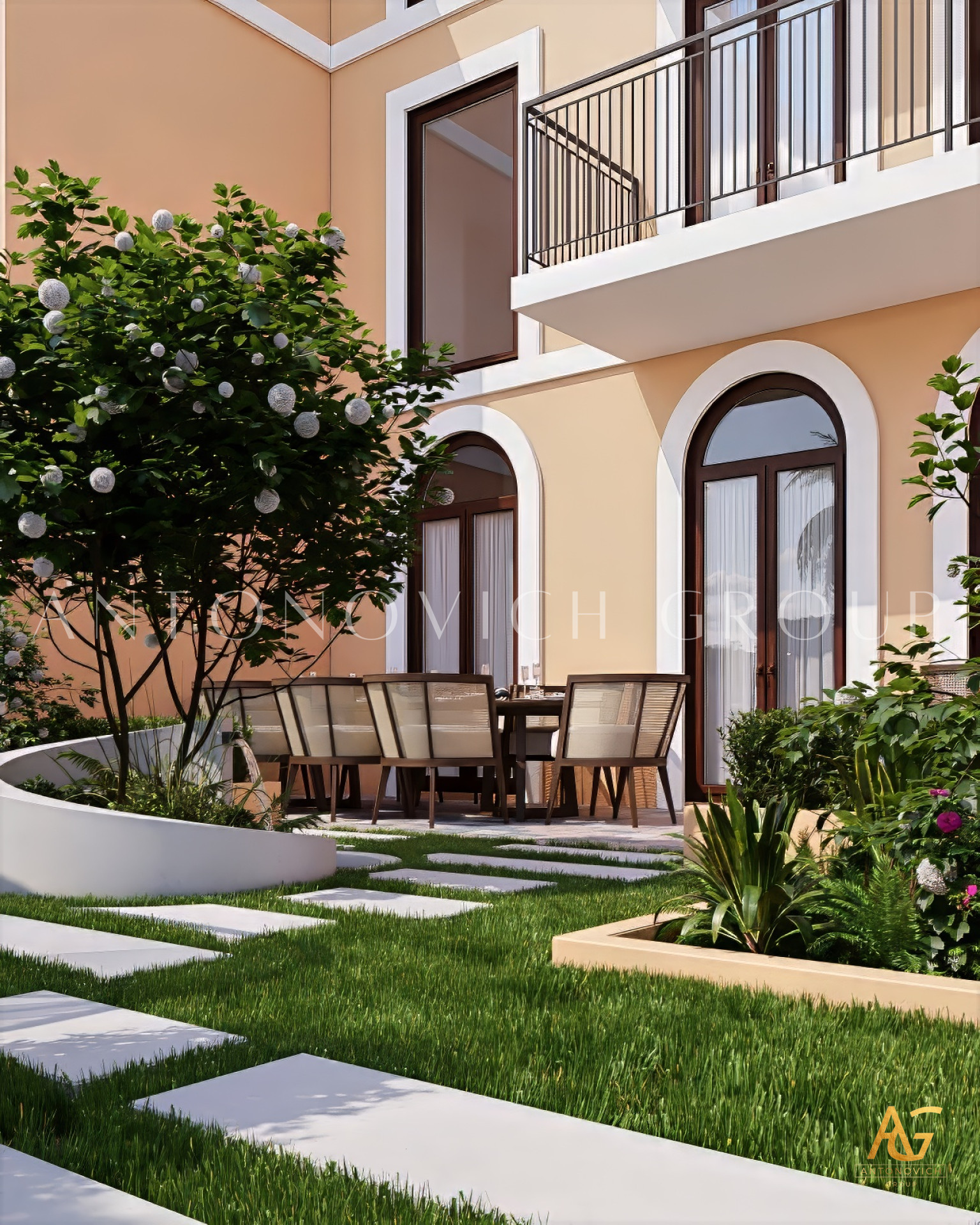 Помимо интерьеров, Антонович Дизайн преобразовал наружные зоны в полноценный оазис. Благоустроенные сады, стильные зоны для отдыха и продуманное освещение создают атмосферу спокойствия — ландшафтный дизайн и бассейн La Mer гармонично дополняют общую концепцию.