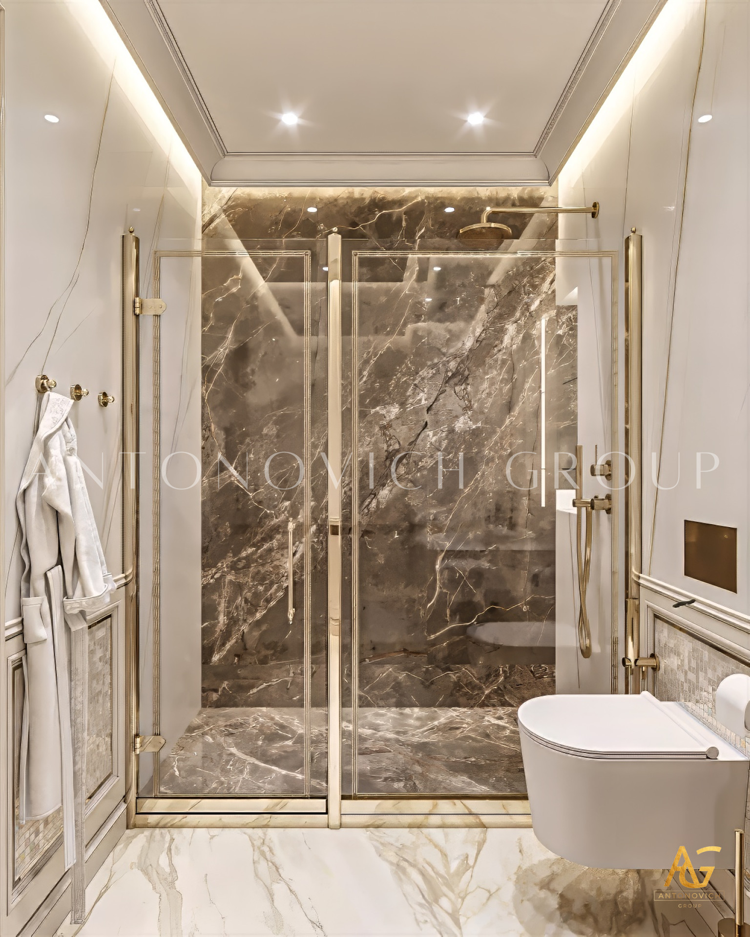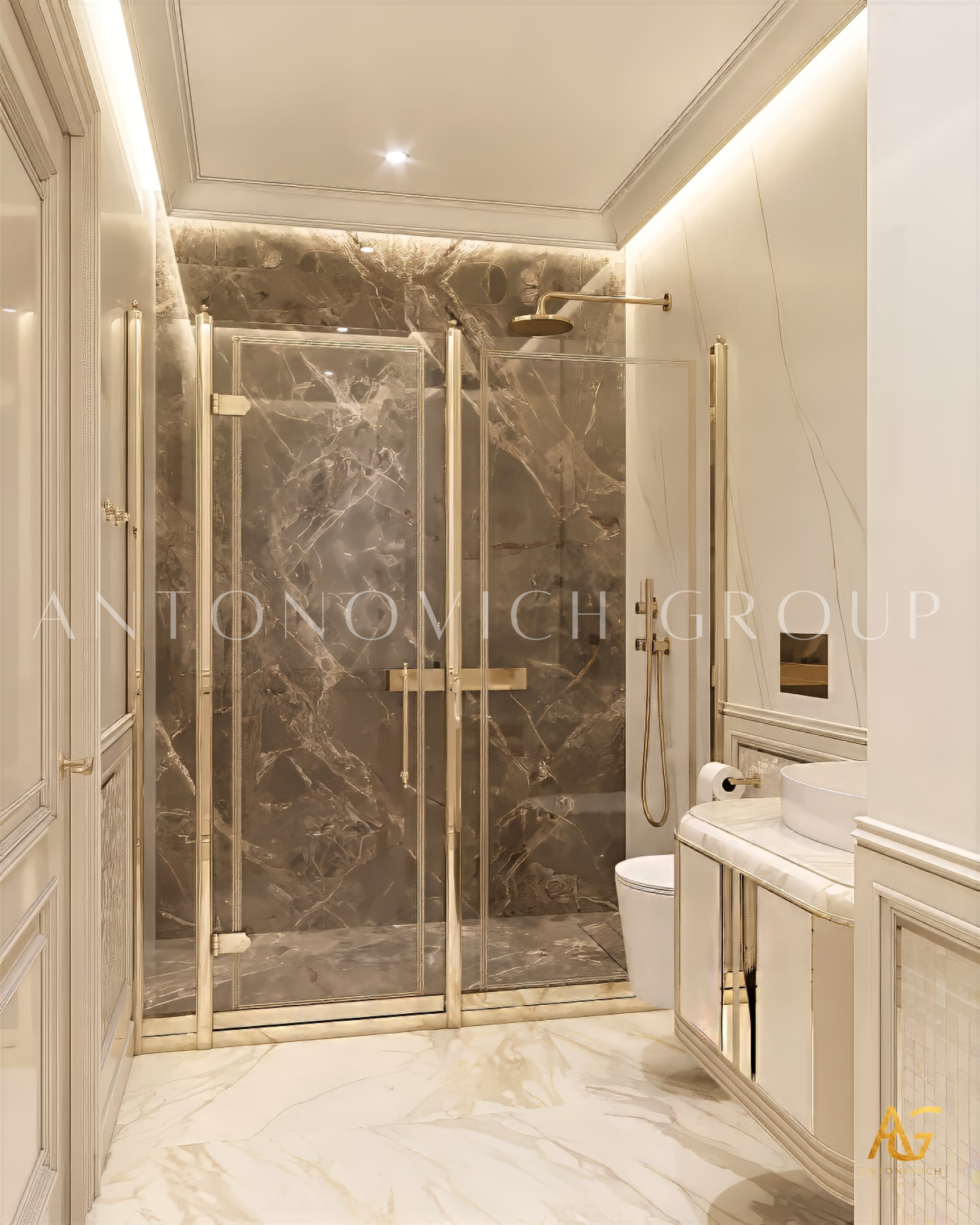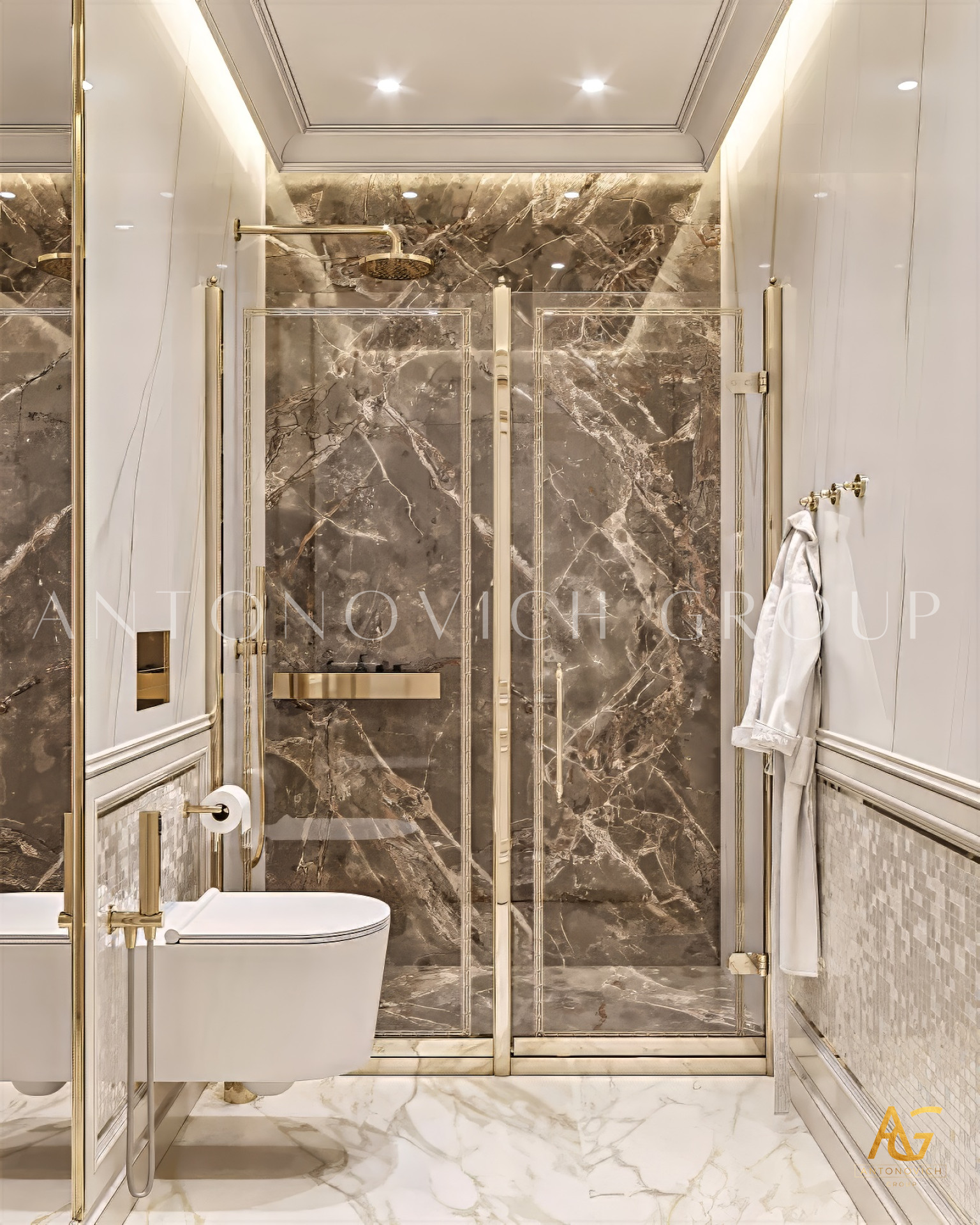 • Акцентные стены из зеркально подобранного мрамора, бронзовые акценты и фактурные панели