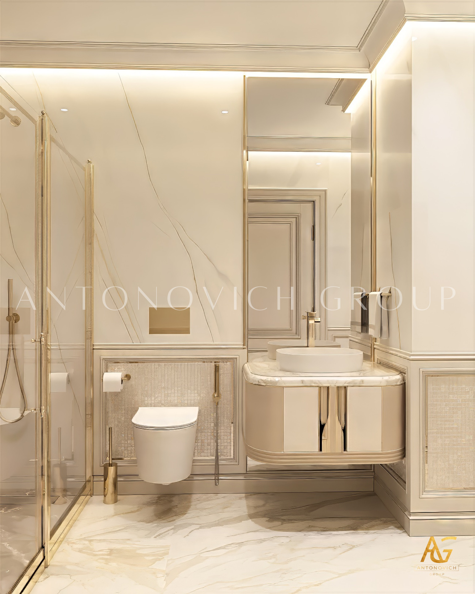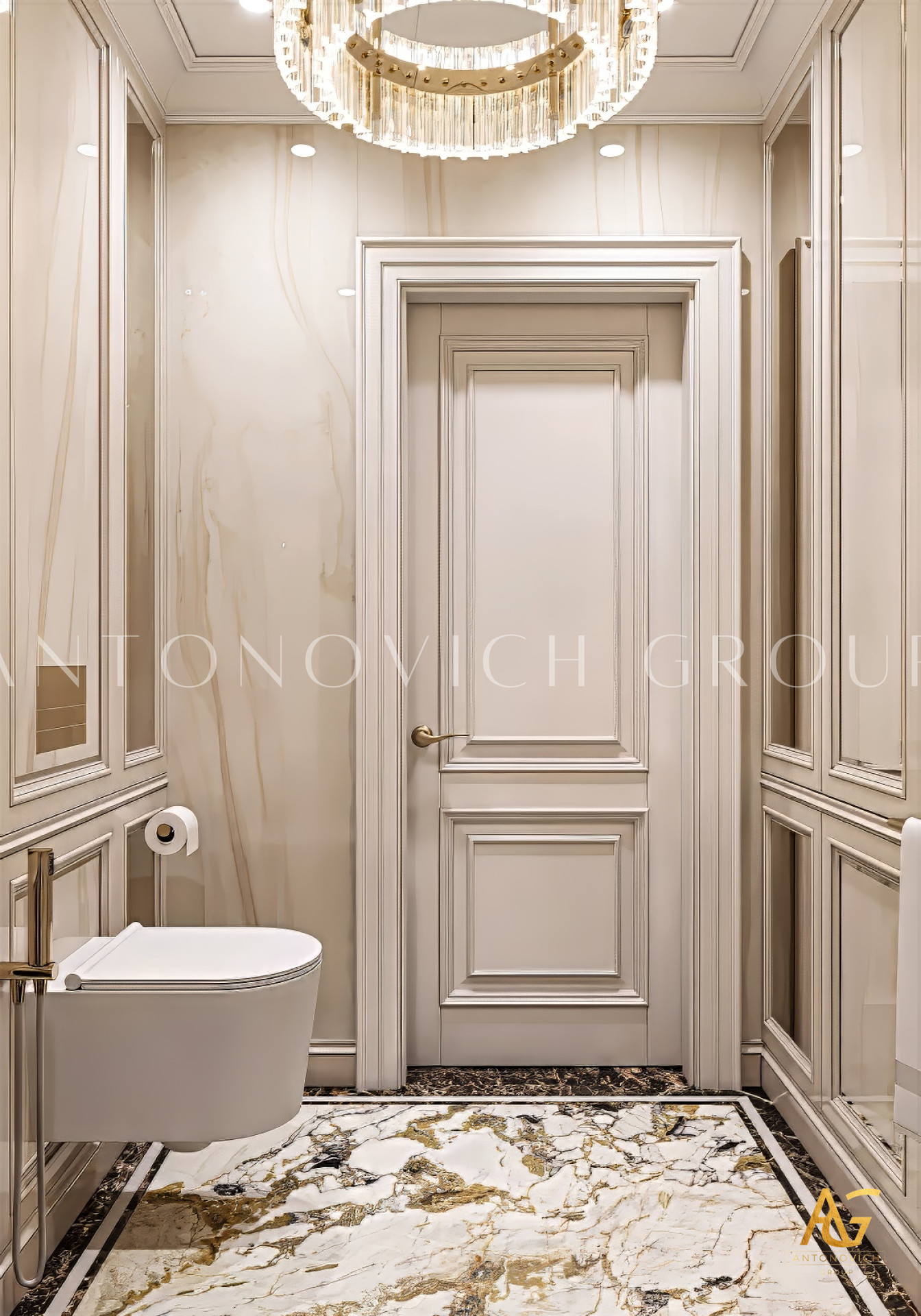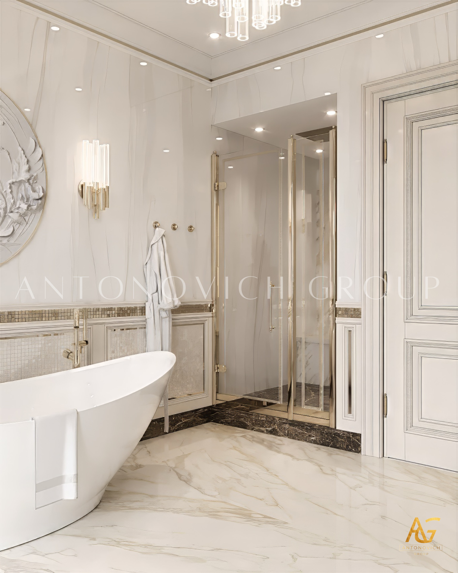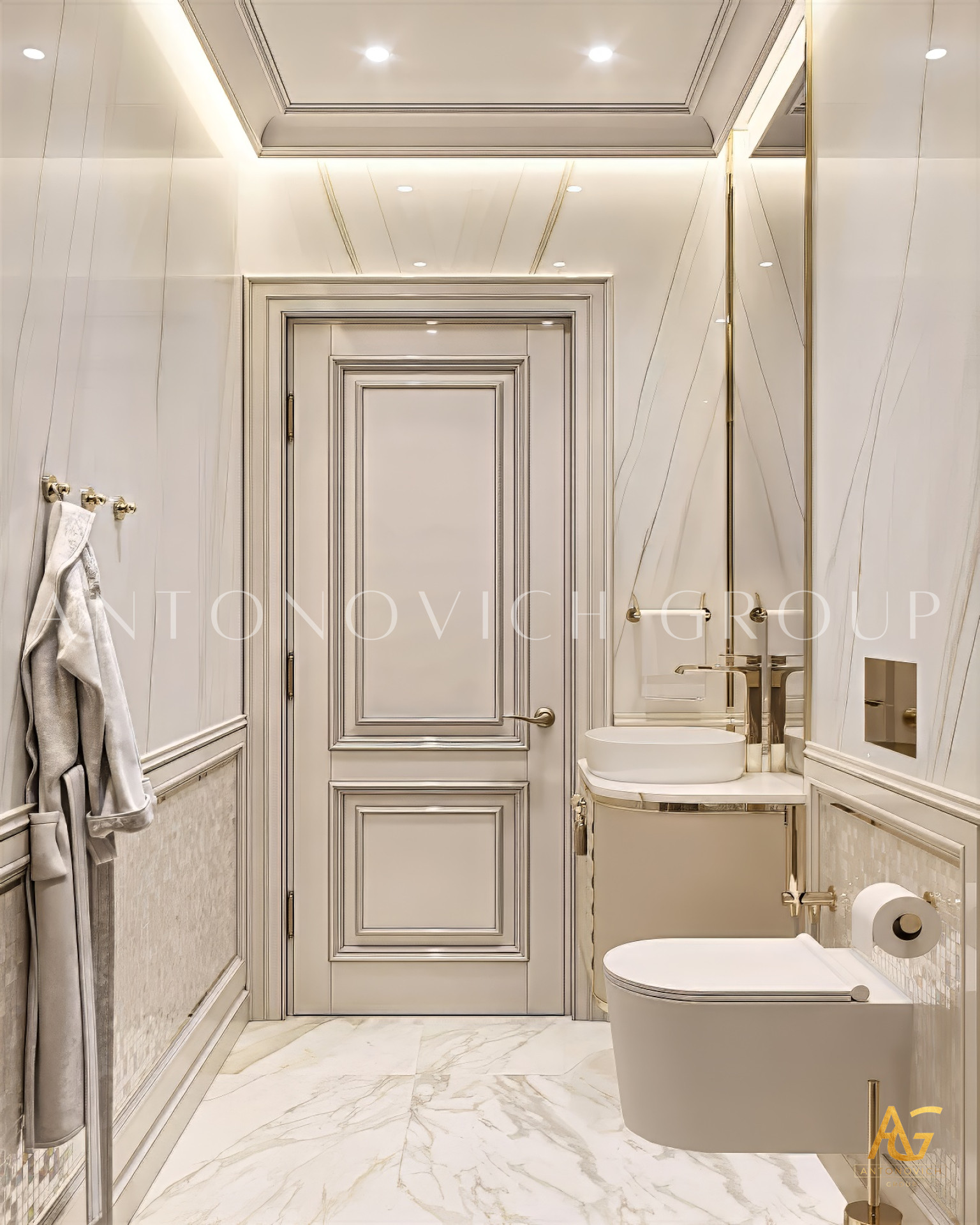 • Акцентные стены из зеркально подобранного мрамора, бронзовые акценты и фактурные панели