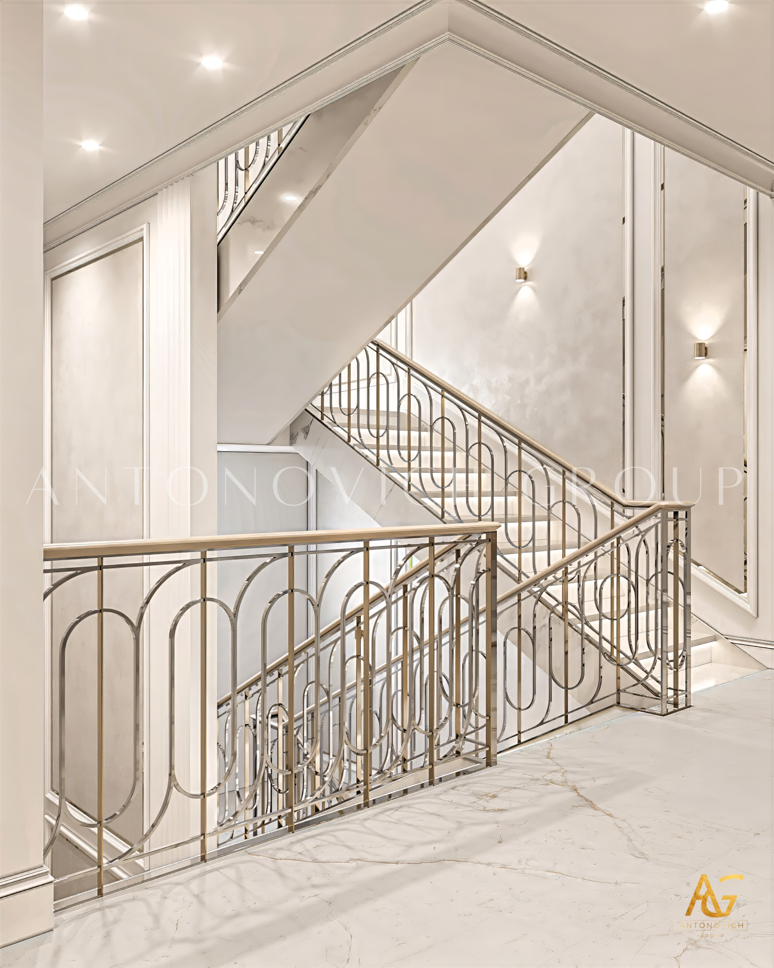 • Скульптурная парящая лестница с мраморными ступенями и перилом цвета шампанского