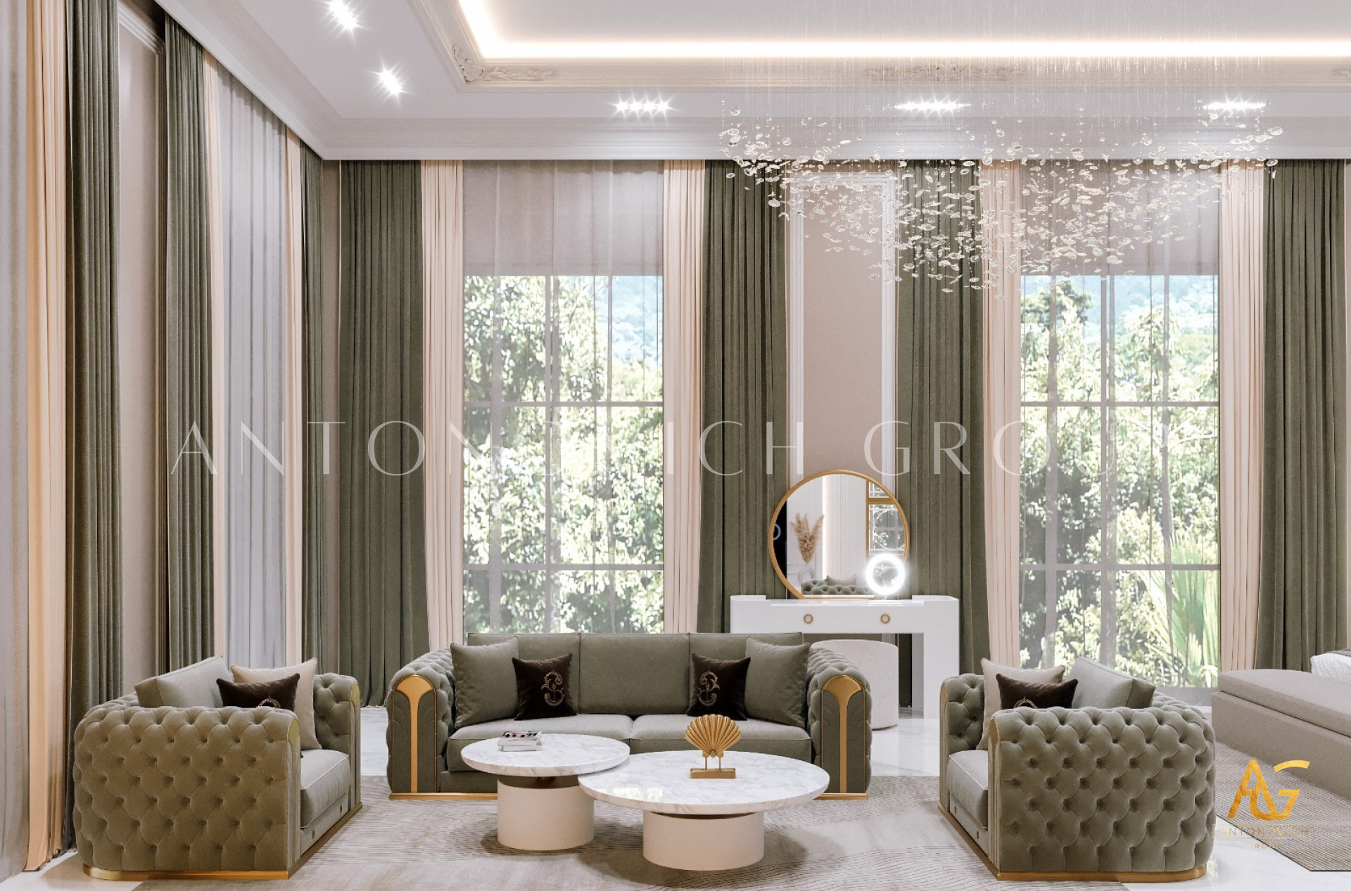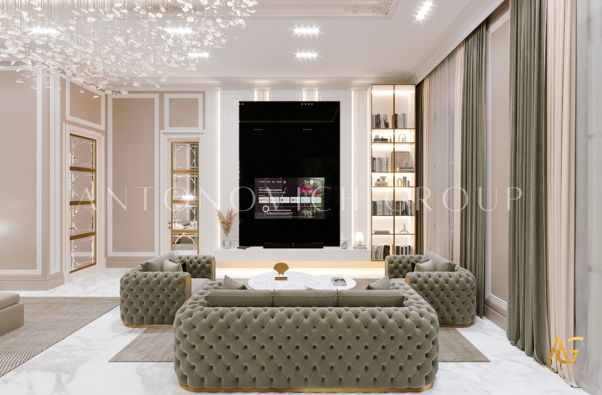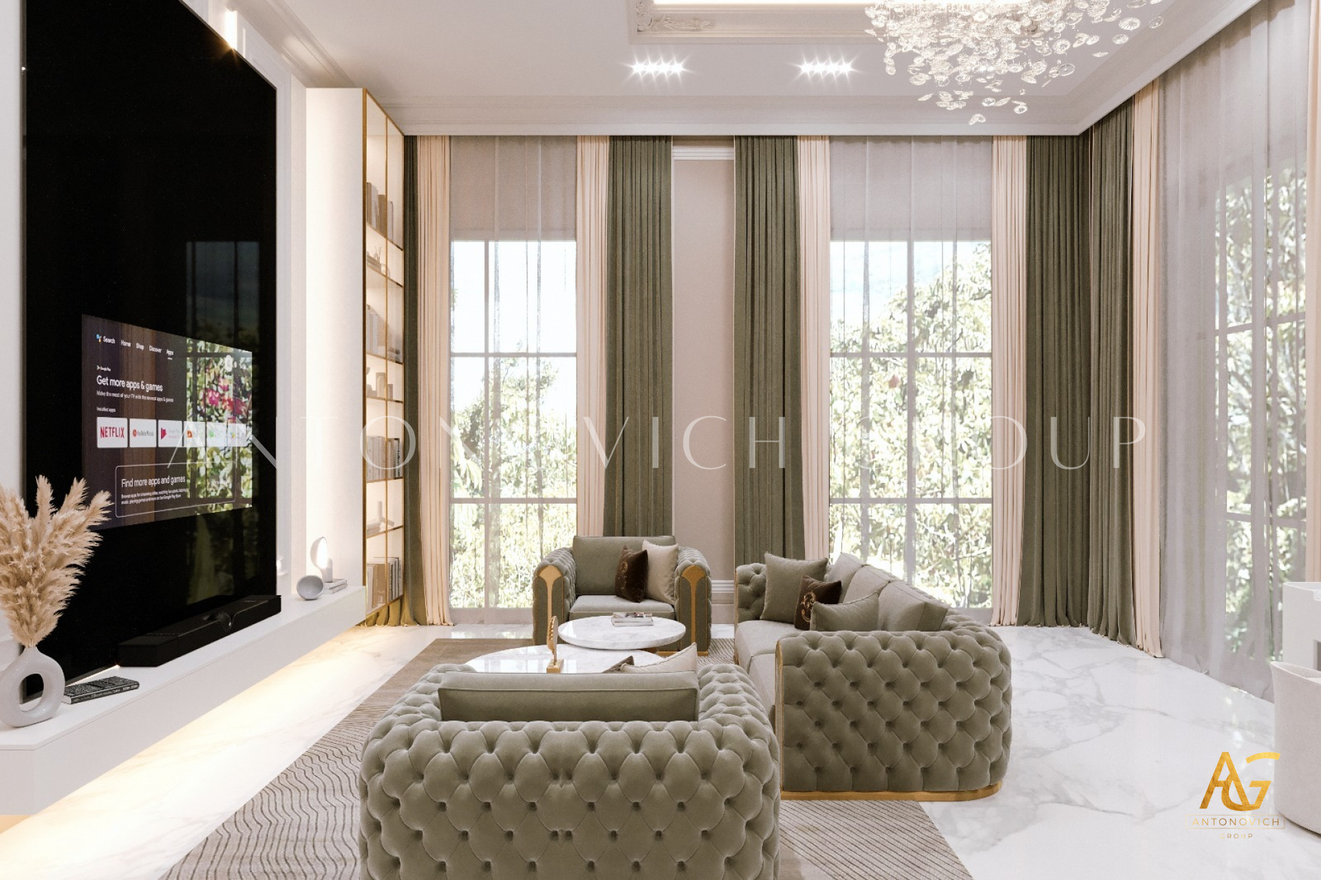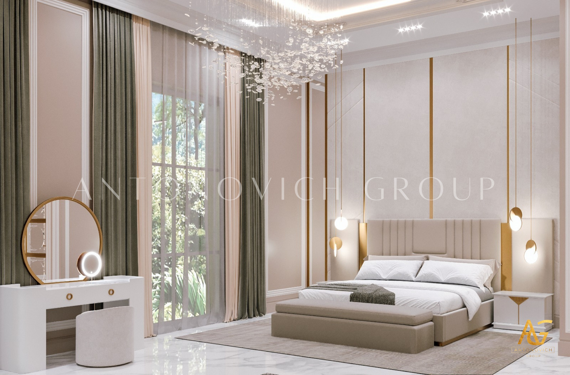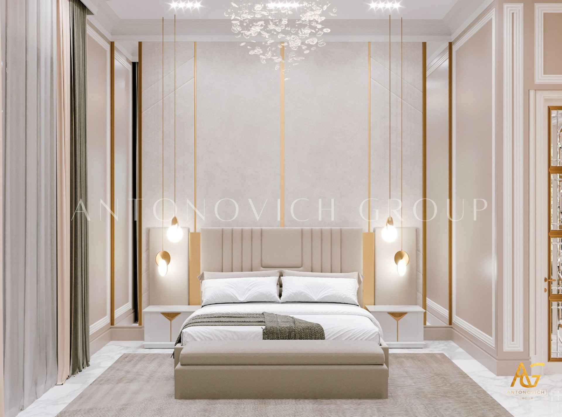Идея этого роскошного дизайна спальни восходит к традициям европейских домов. Здесь представлен классический дизайн спальни с выразительными акцентами потолка — в деталях они подчёркнуты и превращают потолок в центральный элемент. Часто потолок оставляют простым, но Антонович Дизайн (Antonovich Design) позаботилась, чтобы ни одна часть интерьера не была простой. Уникальная форма потолка и центр создают яркий фокус; под ним размещена впечатляющая люстра — люстра для классической спальни, которая идеально дополняет общую концепцию. Такая проработка подчёркивает дизайн потолка в спальне.