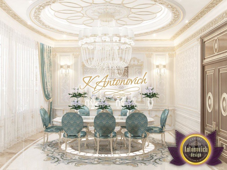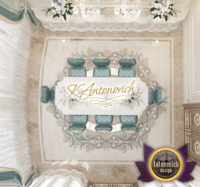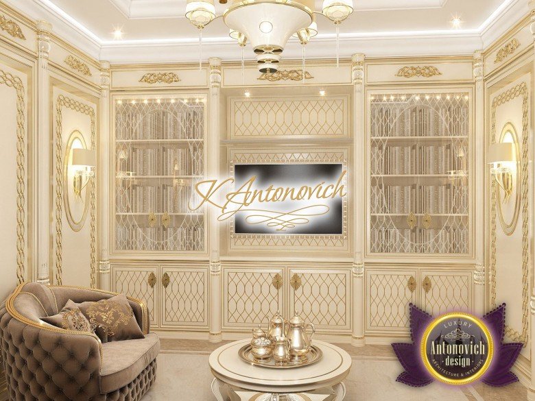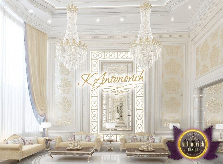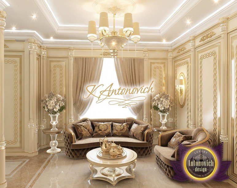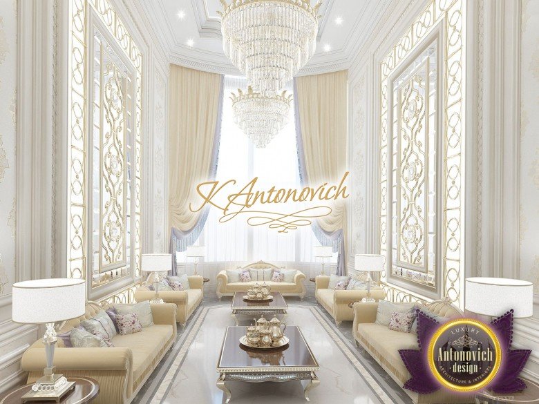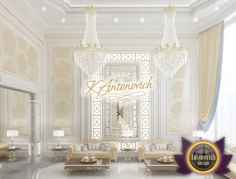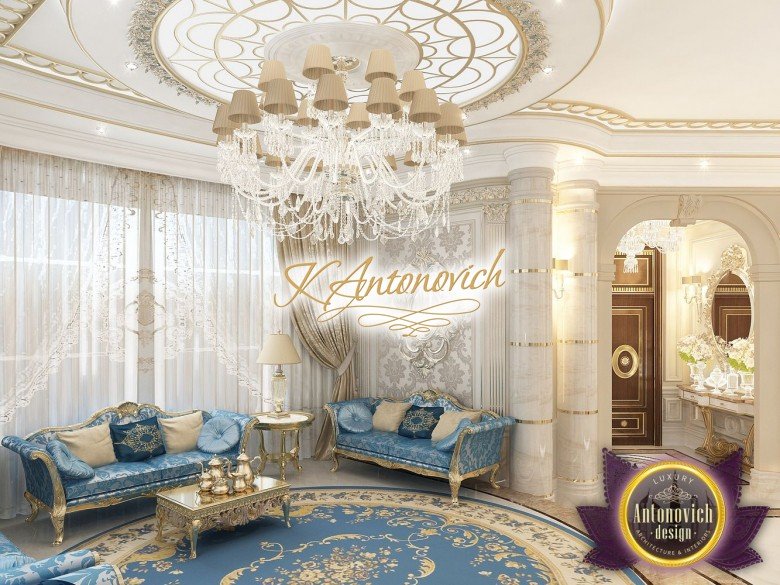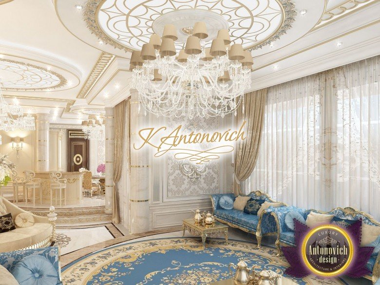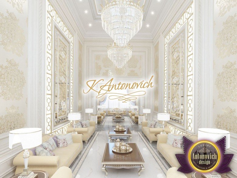В классическом проекте дизайна изящно добавлены ноты восточного колорита — ориентальный акцент в интерьере. Дизайн-студия в Дубае учитывает культурные традиции страны, для которой разработан проект: владельцы виллы в Саудовской Аравии — аристократическая семья с глубокими корнями, чтящая свои традиции. Это наш подход к дизайн интерьера для арабских стран: интерьер мажлиса полностью передаёт тепло и гостеприимство знатной семьи. Каждая деталь интерьера — эксклюзивное решение, подчёркивающее индивидуальность дома и его хозяев. Гостиная оформлена столь же роскошно: стены украшены зеркальными панелями на стенах, текстильными панелями и лепниной. Мраморный пол украшен изящно вырезанным узором из нескольких сортов натурального мрамора. В доме много мягкой мебели, что позволяет принять большое количество гостей.