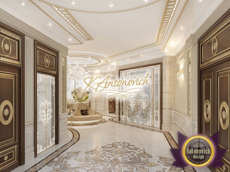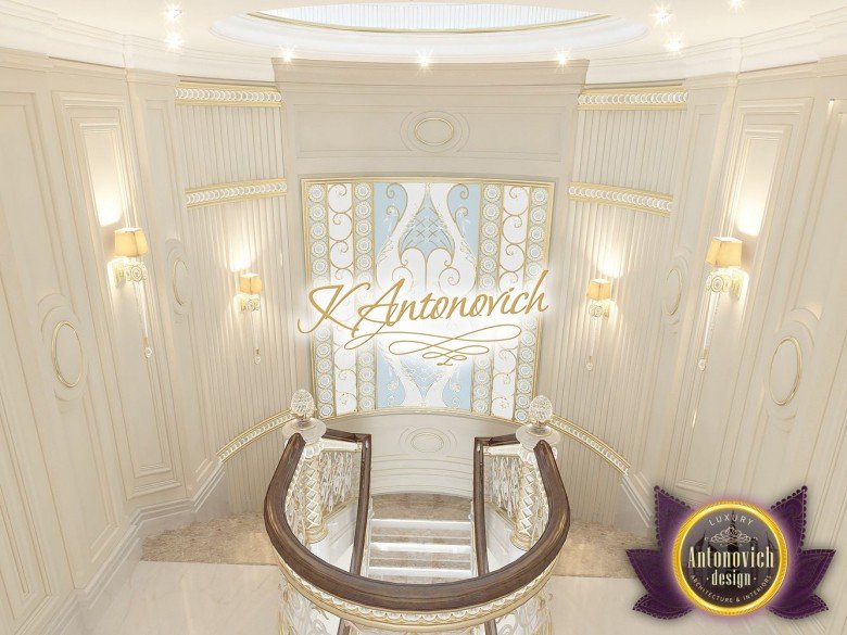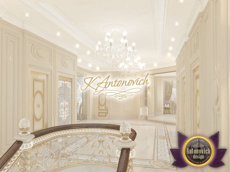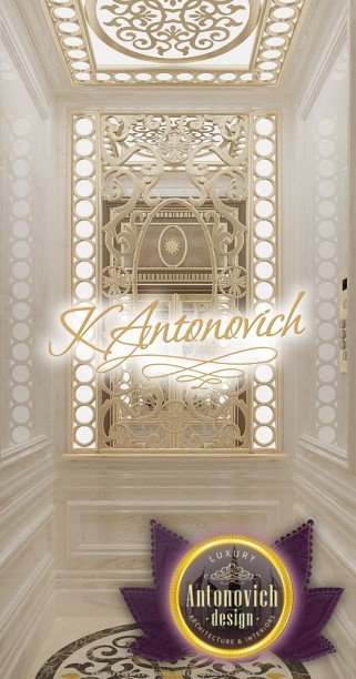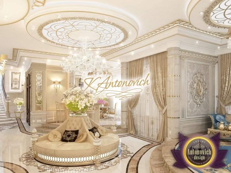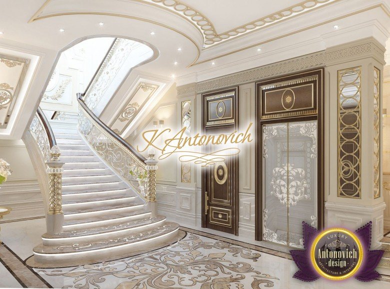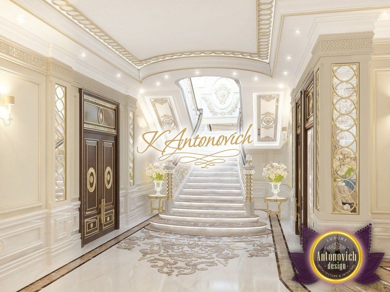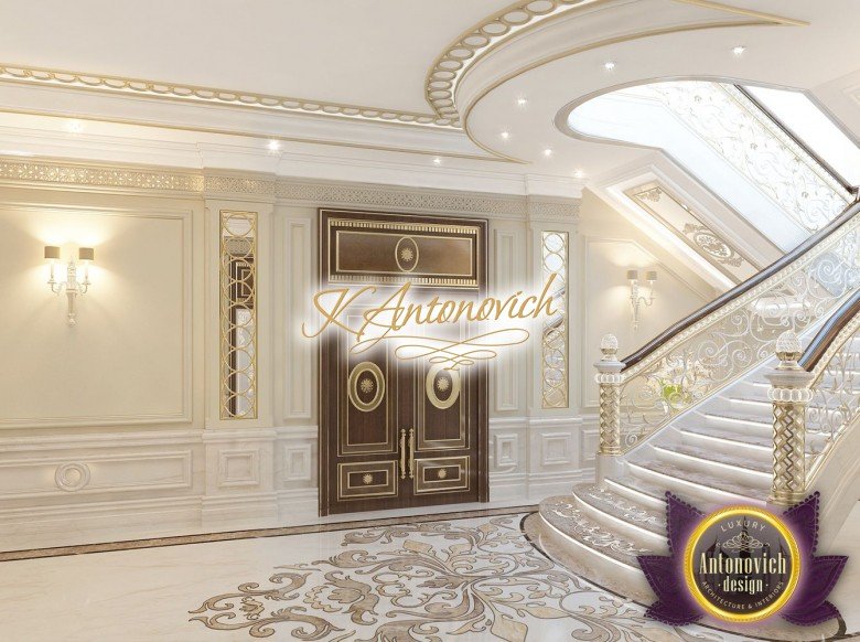 Этот проект создан для ценителей роскоши из Саудовской Аравии: интерьер виллы Мадина Мунавара (Madina Munawara) отражает мировые тенденции в дизайне элитной недвижимости. Интерьер роскошной виллы продуман до мельчайших деталей. Акцент по‑прежнему — на классический стиль в интерьере. Дизайнеры студии Антонович Дизайн (Antonovich Design) привнесли в него своё видение новых тенденций. Весь интерьер дома выглядит очень респектабельно и аристократично. Эта респектабельность начинается с оформления холла: резной мраморный пол и мраморная лестница в интерьере стали гармоничным сочетанием. Авторы повторяют ручные завитки в узорах витражных дверей и кованой балюстраде лестничного портала.