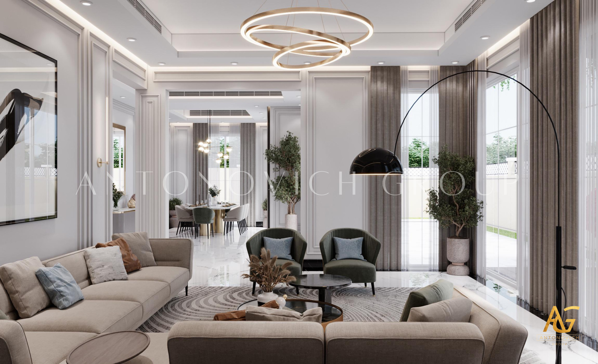 Во главе современного дизайна гостиной в Дубае стоит фирменный почерк Антонович Дизайн (Antonovich Group): впечатляющая высота потолков, драматические архитектурные решения и тщательно отобранные материалы, говорящие языком роскоши. Их проекты часто включают эффектные пространства с двойной высотой потолка, украшенные люстрами авторской разработки, которые задают тон всей вилле. Мастерство компании в области интерьер гостиной в Дубае проявляется в продуманной планировке пространства: гостиная становится и впечатляющим центром приема, и уютной семейной зоной.