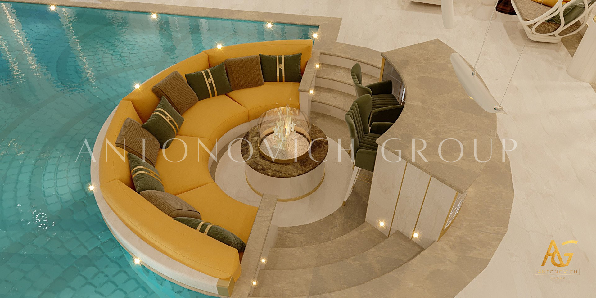 Интерьер этого проекта демонстрирует дизайн интерьера роскошного бассейна — тёплый и располагающий. Крытые бассейны не обязаны быть скучными: современный дизайн крытого бассейна тому подтверждение. В этом проекте дизайн бассейна исполнен в современной эстетике, полной характера. Кажется, что ваш интерьер блеклый и лишён индивидуальности? Этот роскошный интерьер бассейна оформлен тепло и гостеприимно, создавая просторный интерьер с бассейном, который излучает элегантность и роскошь. Лавочки, столы и кресла у бассейна также уникальны по дизайну. Кроме того, элегантные текстуры для бассейна и мягкие оттенки создают особенно изысканную атмосферу.