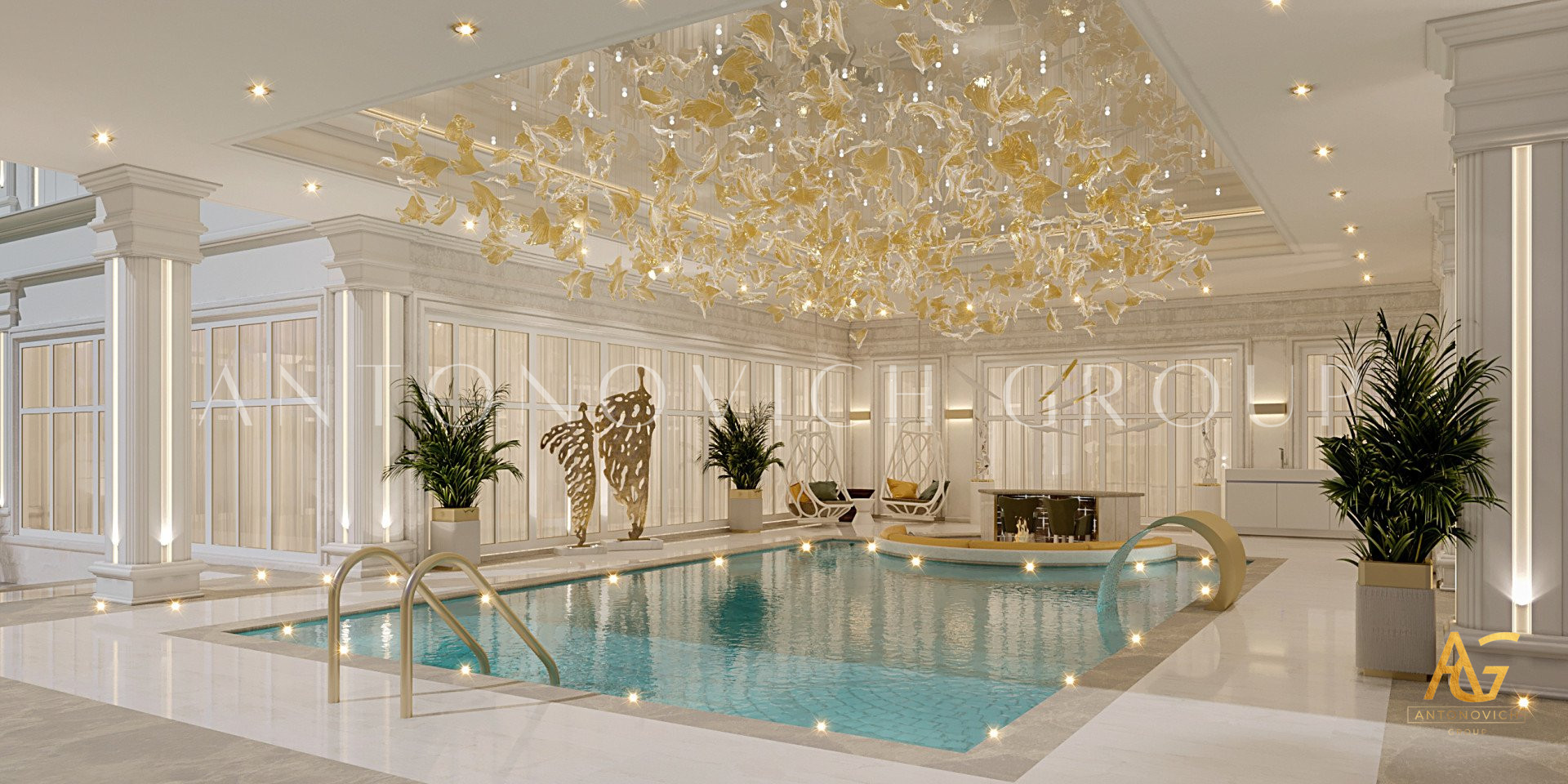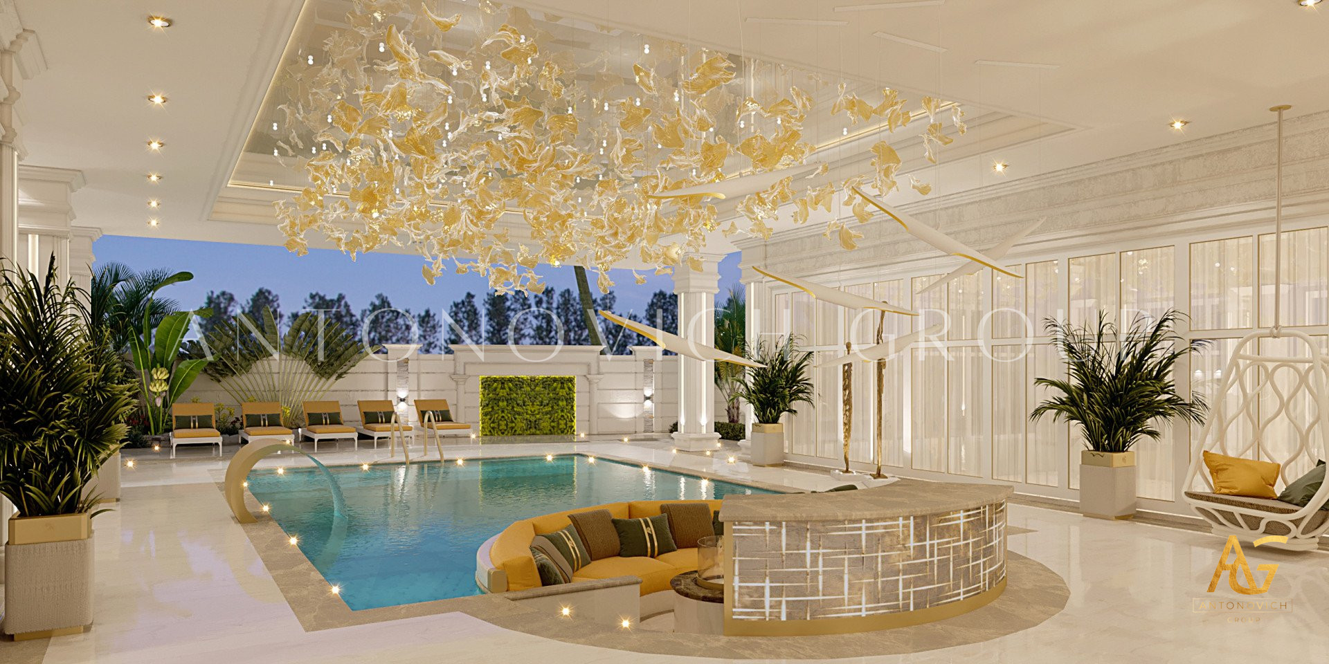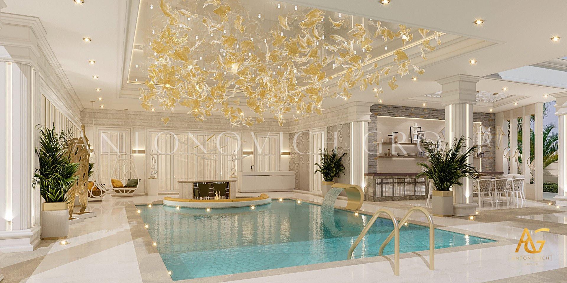 Если вы ищете идеи или хотите превратить бассейн в нечто более красивое и престижное, вы попали в нужное место. Это помещение великолепно и роскошно: огромное пространство тщательно продумано и стильно оформлено. Оно само по себе — произведение искусства. Золотые украшения и изысканное оформление бассейна с золотом вместе с освещением придают комнате роскошный вид. Мы опирались на современные тенденции дизайна бассейна из самых глянцевых изданий. Оттенки успокаивают, а текстуры изящно подчёркивают интерьер. Освещение для бассейна и интерьера дополняет общий замысел и завершает трансформация бассейна в роскошь, создавая уютный интерьер крытого бассейна.