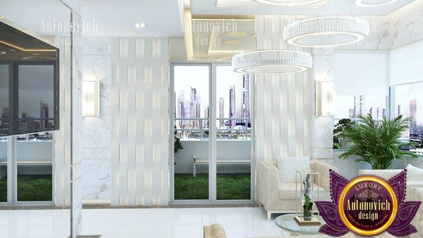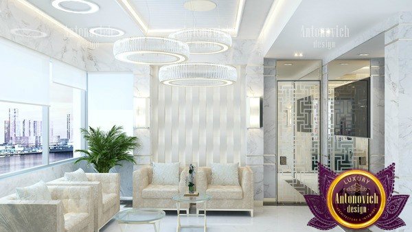 Интерьер выполнен преимущественно в белой палитре: лаковые поверхности, ламинированные панели, белые мраморные плиты с элегантной серой текстурой. Стены и пол оформлены в светлых тонах. Для потолка выбрана многоуровневая конструкция с белыми деревянными панелями, к которым прикреплены оригинальные круглые светильники. В интерьере применены стеклянные двери и перегородки. Плавная мягкая перегородка делит пространство на две зоны: рецепцию и лечебные кабинеты и офисы, что соответствует принципам функционального планирования и обеспечивает эргономичную отделку медицинских помещений.