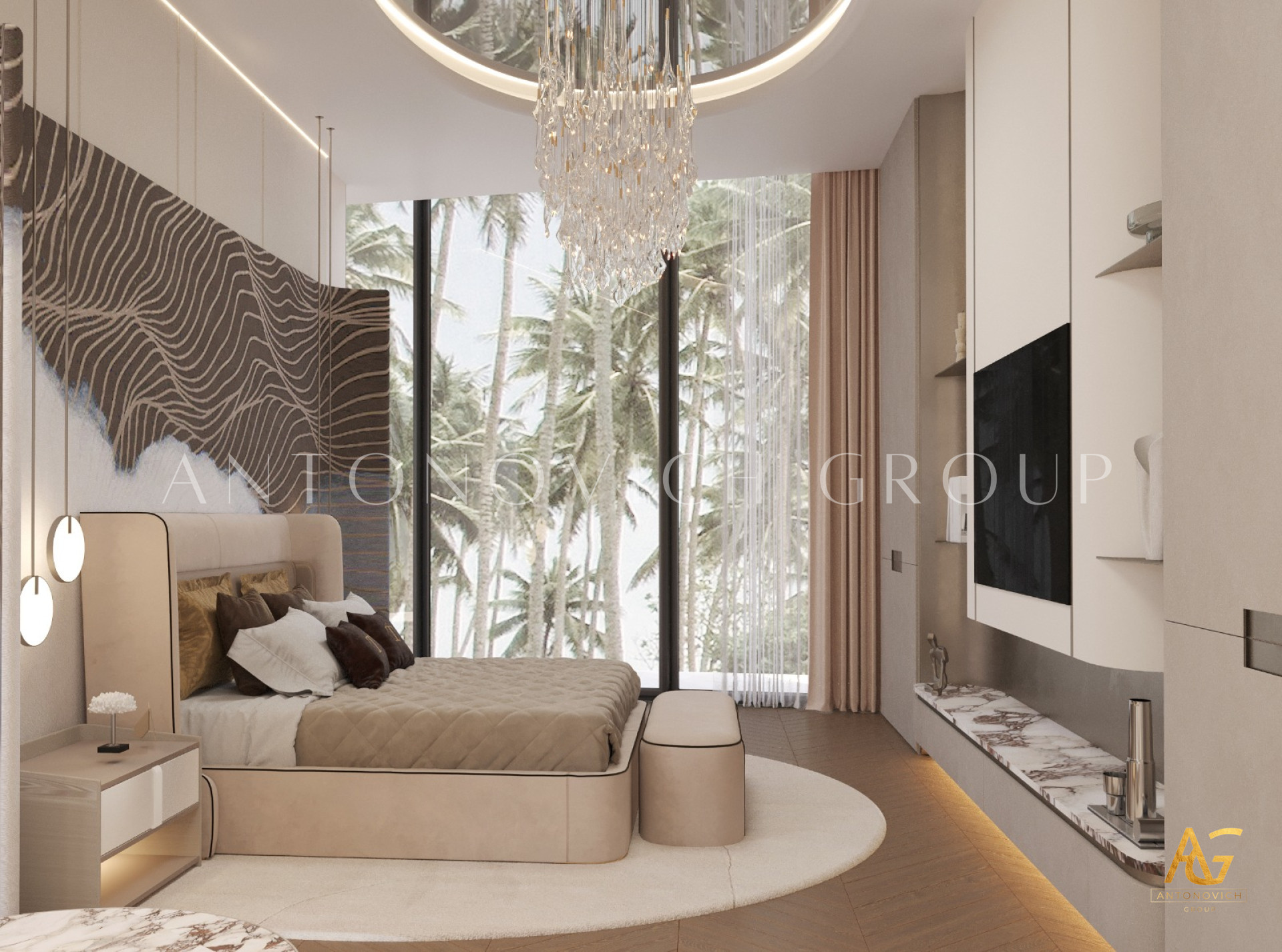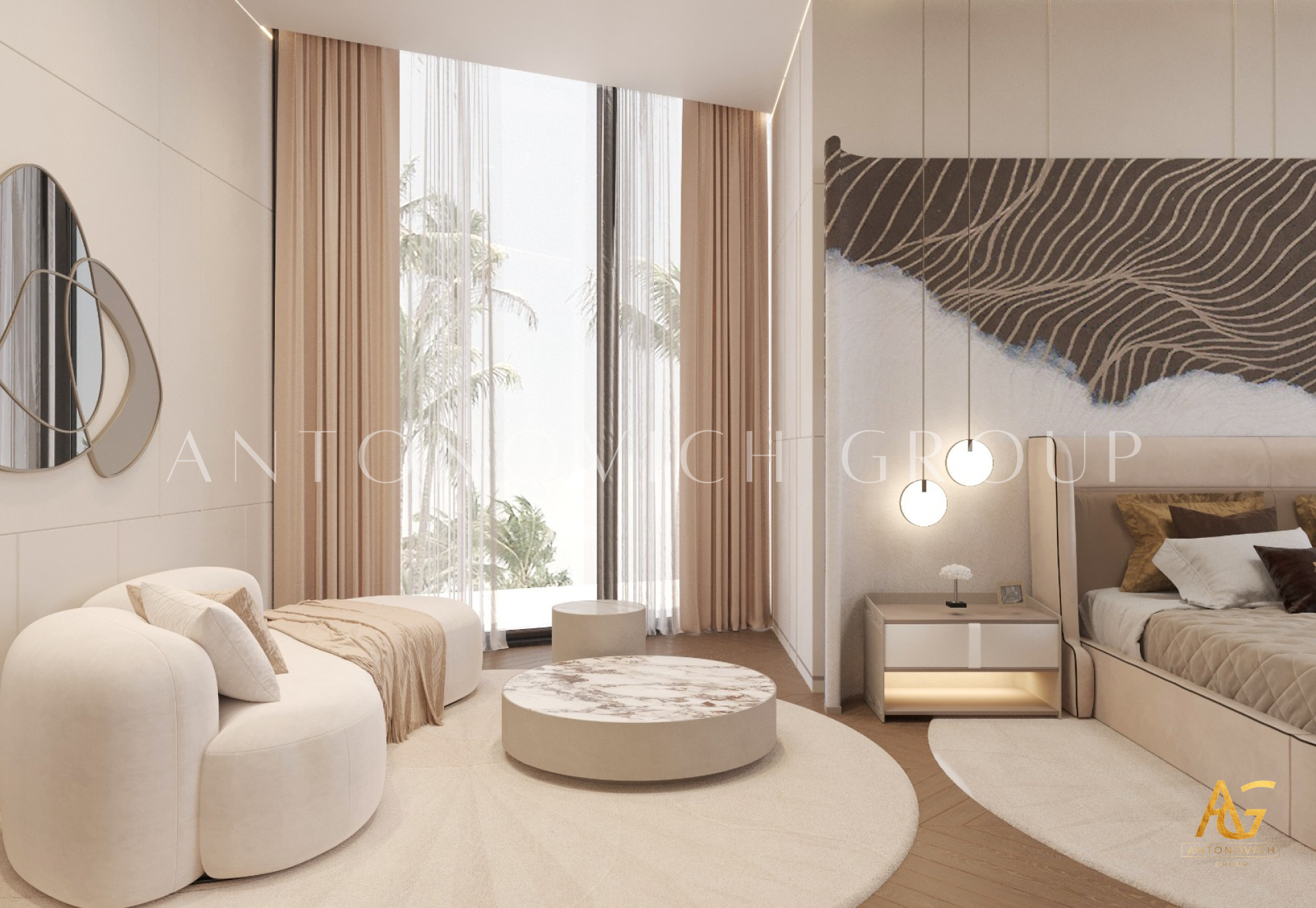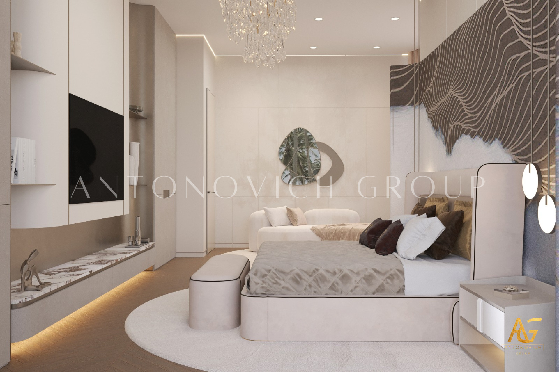 Включая элементы мебели из элитных коллекций, Антонович Дизайн гарантирует, что каждая деталь поддерживает общую тему интерьера. От мягких кроватей до шкафов на заказ — подбор предметов создаёт целостную и роскошную атмосферу.