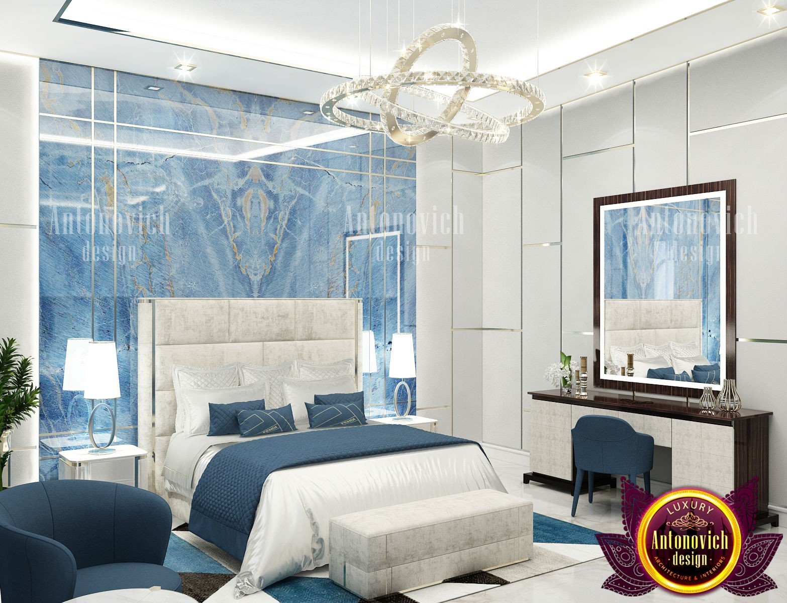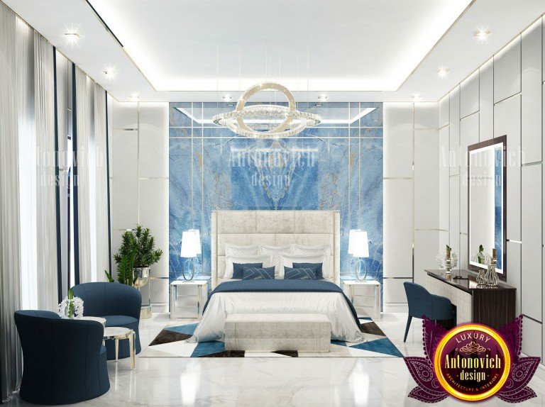 Для грамотного завершения интерьера этой роскошной спальни наши дизайнеры подобрали впечатляющую и красивую мебель. Кровать считается ключевым элементом любой спальни, определяющим её основную функцию. Мы подобрали мебель для спальни с высоким изголовьем: шикарная кровать с высоким изголовьем, обитая белым бархатом, и комплект кресел насыщенного королевского синего цвета, который повторяет отделку акцентной стены. Дорогая деревянная мебель в виде консоли и туалетного столика гармонично вписалась в общую светлую картину комнаты.
