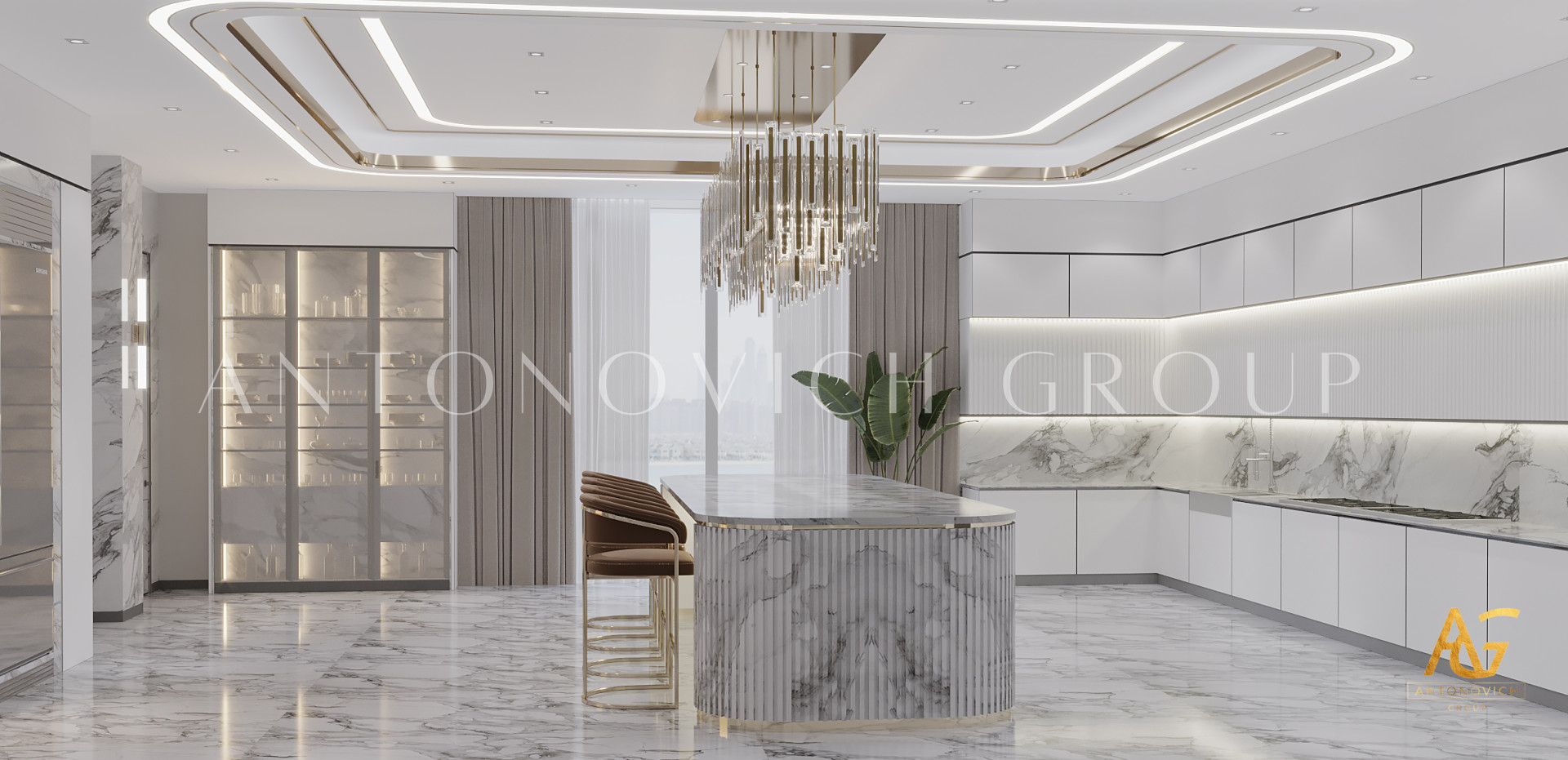 Вам понравится удивительная атмосфера, которую создаёт этот проект — дизайн роскошной кухни. Коричневый цвет выбран для создания роскошной среды: это кухня в коричневых тонах. Этот роскошный кухонный интерьер обладает прорывной атмосферой, усиленной талантом Антонович Дизайн (Antonovich Design). Здесь применены золотые элементы интерьера кухни, и концепция по‑настоящему гламурна и выполнена полностью Антонович Дизайн. В контексте роскоши каждый предмет в этом интерьере предлагает свою уникальную ценность. Внимание к деталям в кухне отчетливо заметно, а баланс и гармония в интерьере кухни обеспечивают комфорт и эстетическое удовольствие.