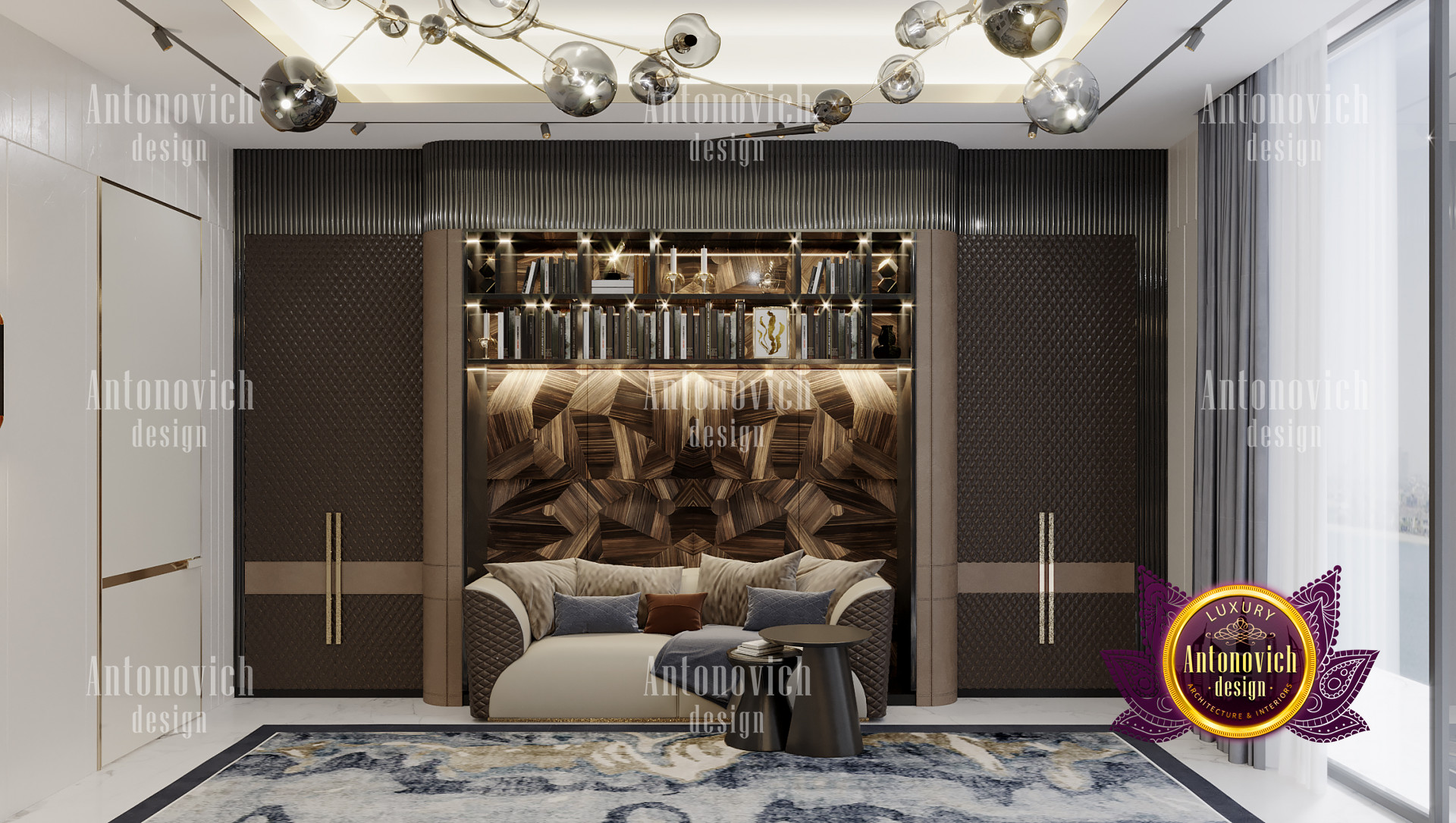 В этом проекте роскошный офисный интерьер дополняет вместительная книжная полка позади стола — офисный интерьер с книжным шкафом подчёркивает характер пространства. Грамотная планировка современного офиса облегчает передвижение и работу в помещении. Интерьер дополняют уникальная люстра и продуманное освещение для современного офиса, подробнее — на сайте.