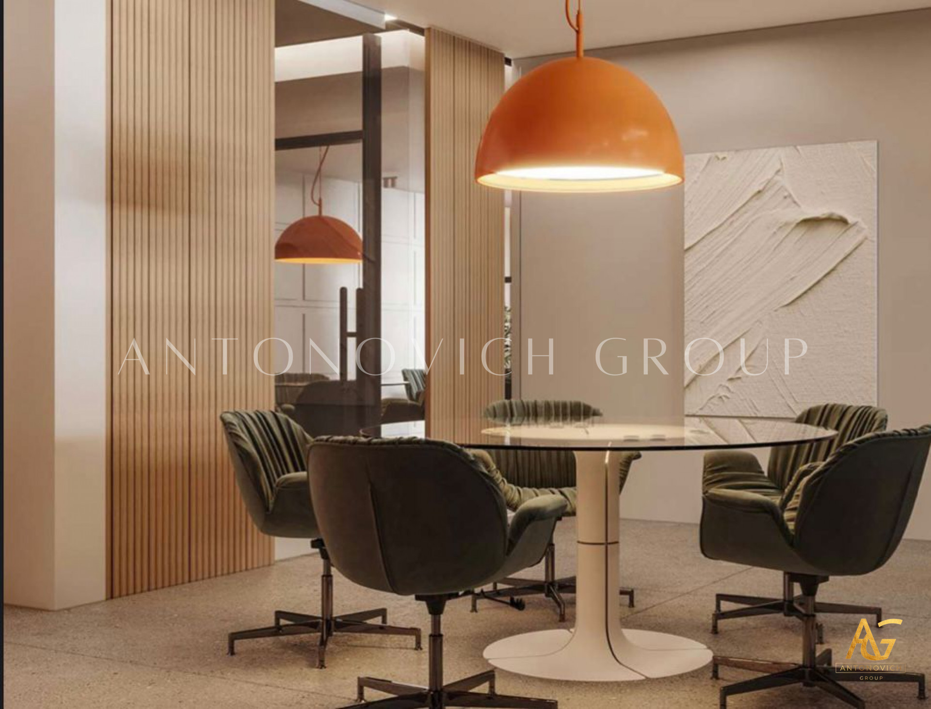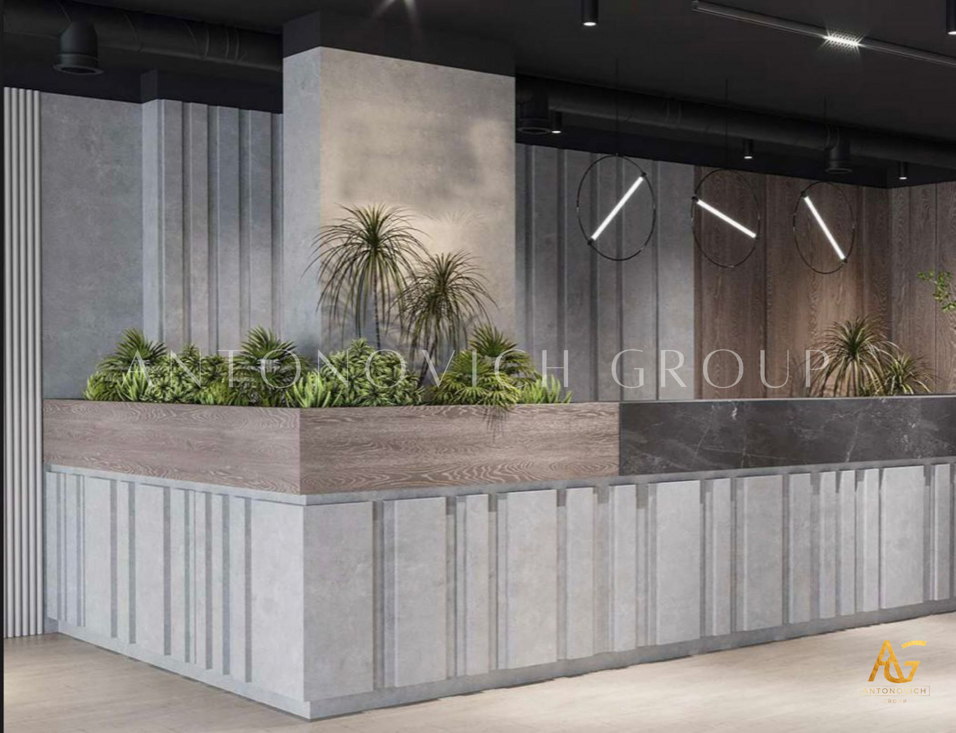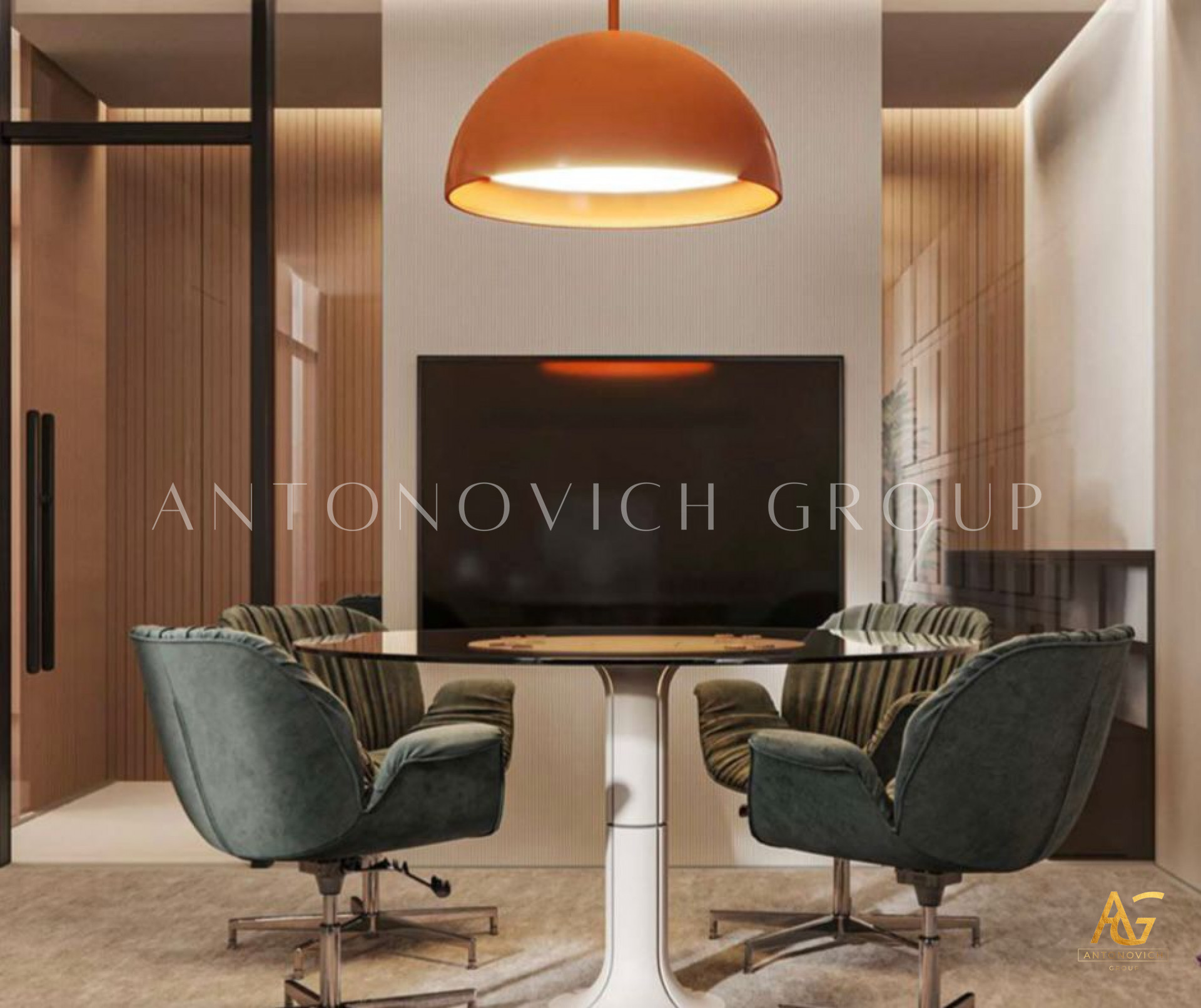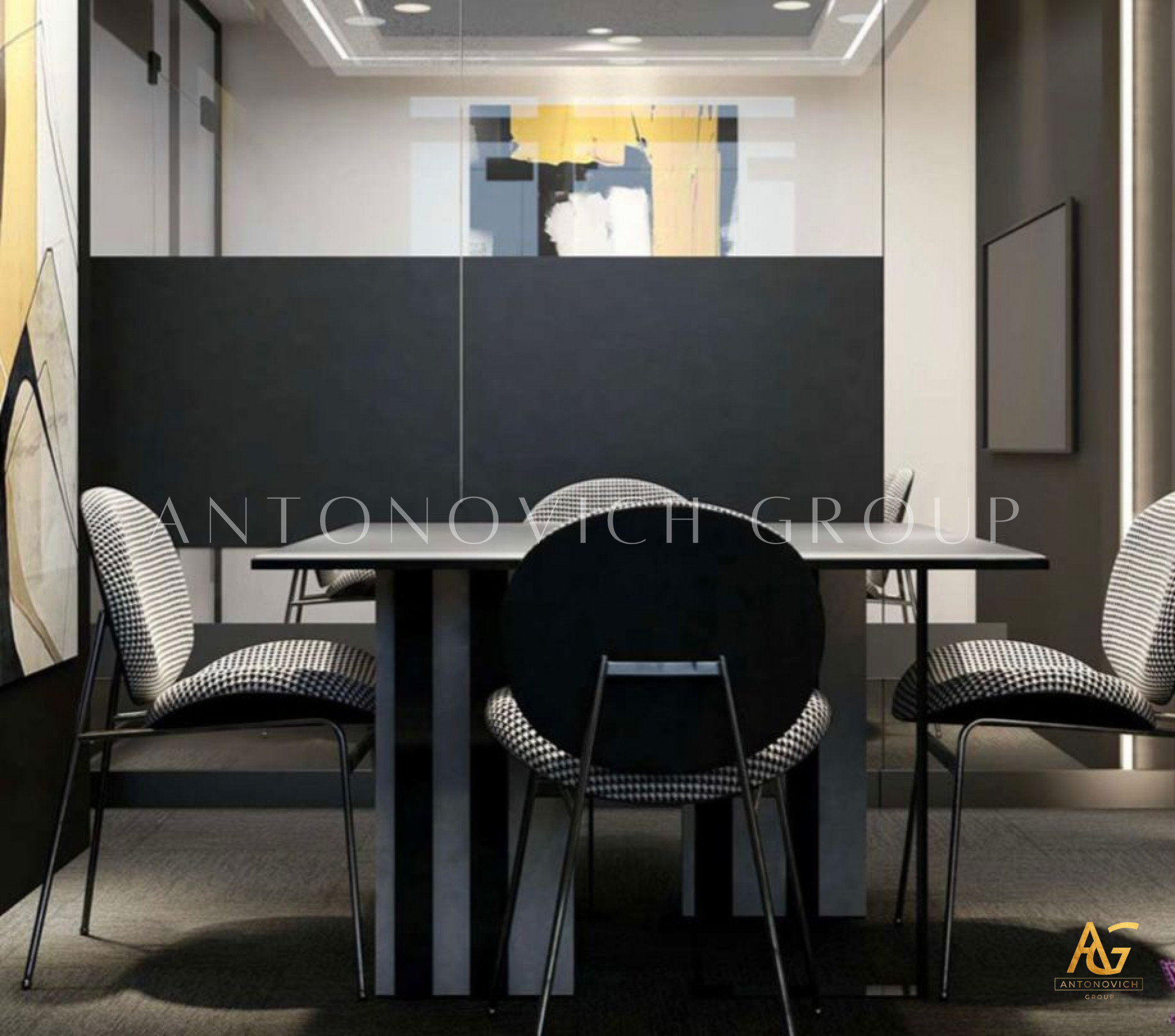 Кресла гармонируют с остальным коммерческим fit-out, боковые растения служат удачным акцентом. Этот эффектный проект — яркий пример офисный интерьер Дубай, где чудесные узоры создают захватывающую и изысканную роскошь. Золотые украшения придают пространству особый шарм. Материалы подобраны безупречно, и внимание к деталям заметно во всём — это образец оформления коммерческого офиса. Антонович Дизайн (Antonovich Design) выбрал благородный золотой оттенок для этого роскошного проекта, считая его лучшим решением для выражения роскоши. Запросы на премиальный дизайн офисов Москва и других мегаполисов подтверждают востребованность подобных решений.