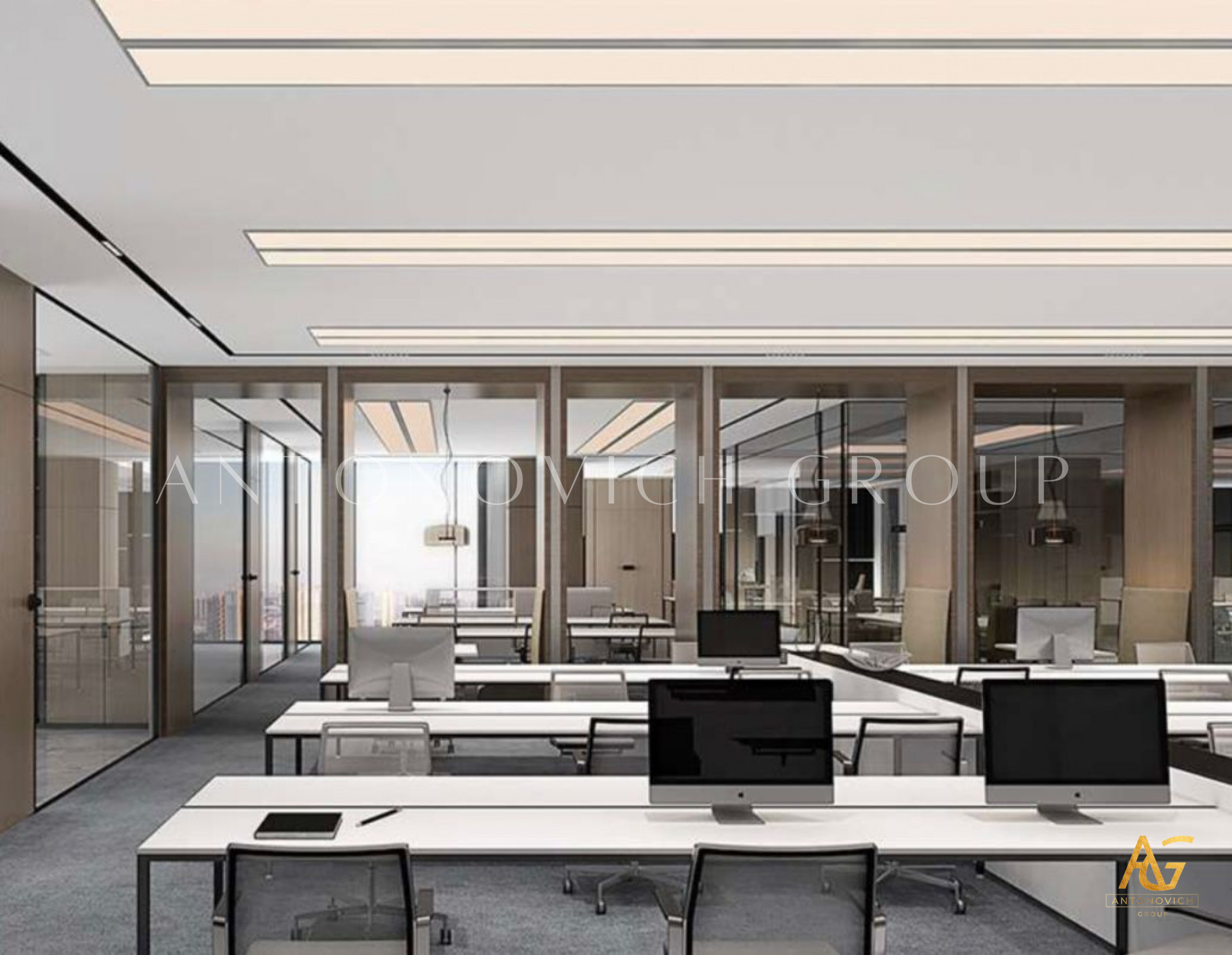 Интерьер обладает сильной абстрактной эстетикой — в нём чувствуется современный дух. Этот проект демонстрирует роскошный офисный интерьер и одновременно аккуратную меблировку и интерьер офиса. Чистый и актуальный стиль оформления подчёркивает концепцию офисный fit-out в современном стиле. Дизайн отлично подходит для напольные покрытия для офиса, создавая тонкое ощущение движения. Светло‑коричневый узор проходит по всему помещению. Хотя проект включает множество зон, пространство не кажется пустым — здесь видно продуманную планировка офиса и зонирование, а общая отделка офиса в современном стиле выглядит завершённой.
