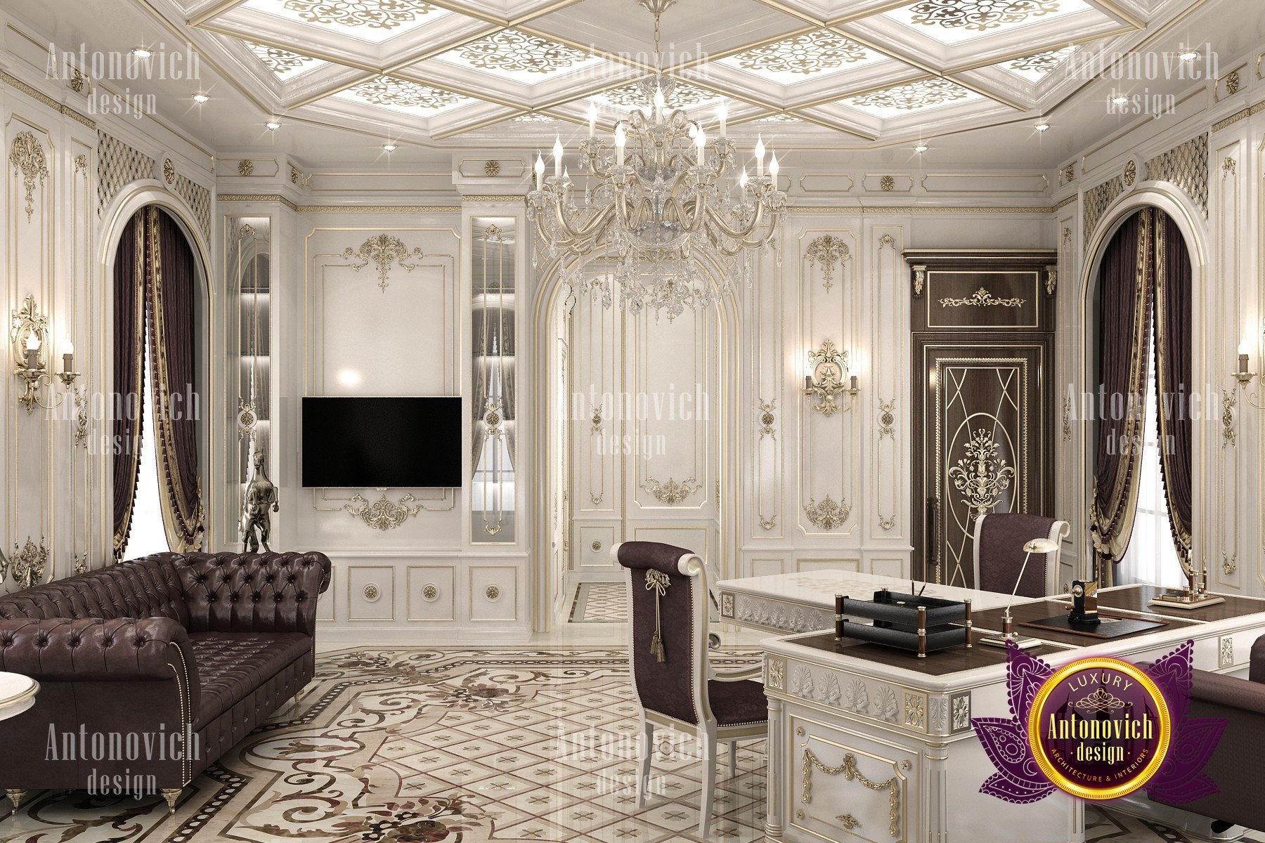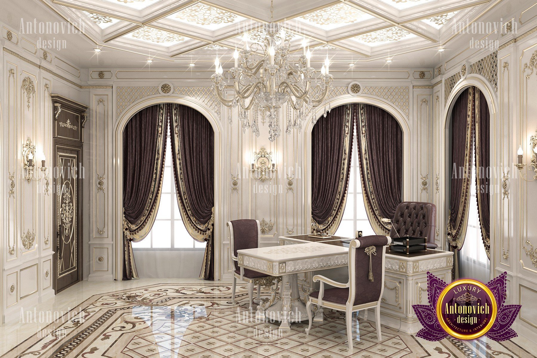 Дизайн офиса в классическом стиле стал отличным способом подчеркнуть солидность и высокий статус его владельца. Классический интерьер офиса учитывает образ жизни и вкусовые предпочтения заказчика. Дизайнеры отразили любовь владельца к путешествиям в больших картинах его любимых мест. Шедевры великолепно смотрятся на фоне лаконичных обоев в широкую полоску. Кремовые оттенки обоев и потолка выгодно оттеняют все остальные детали интерьера. Окно украшено красивой односторонней портьерой из благородного шелка фиолетового оттенка — интерьер с шелковыми шторами выглядит особенно изысканно. Мебель из ценных пород дерева, покрытая лаком, верно подчеркивает солидность интерьера. Дизайн офиса в Дубае удачно сочетает тепло домашнего уюта и рабочую атмосферу. Офис в классическом стиле здесь превращается в комфортное пространство. Дизайн роскошного офиса и оформление офиса в классическом стиле подчёркивают статус и делают пребывание приятным: интерьер офиса в Дубае удобен и элегантен, мягкий ковер и диван из натуральной кожи завершают образ.