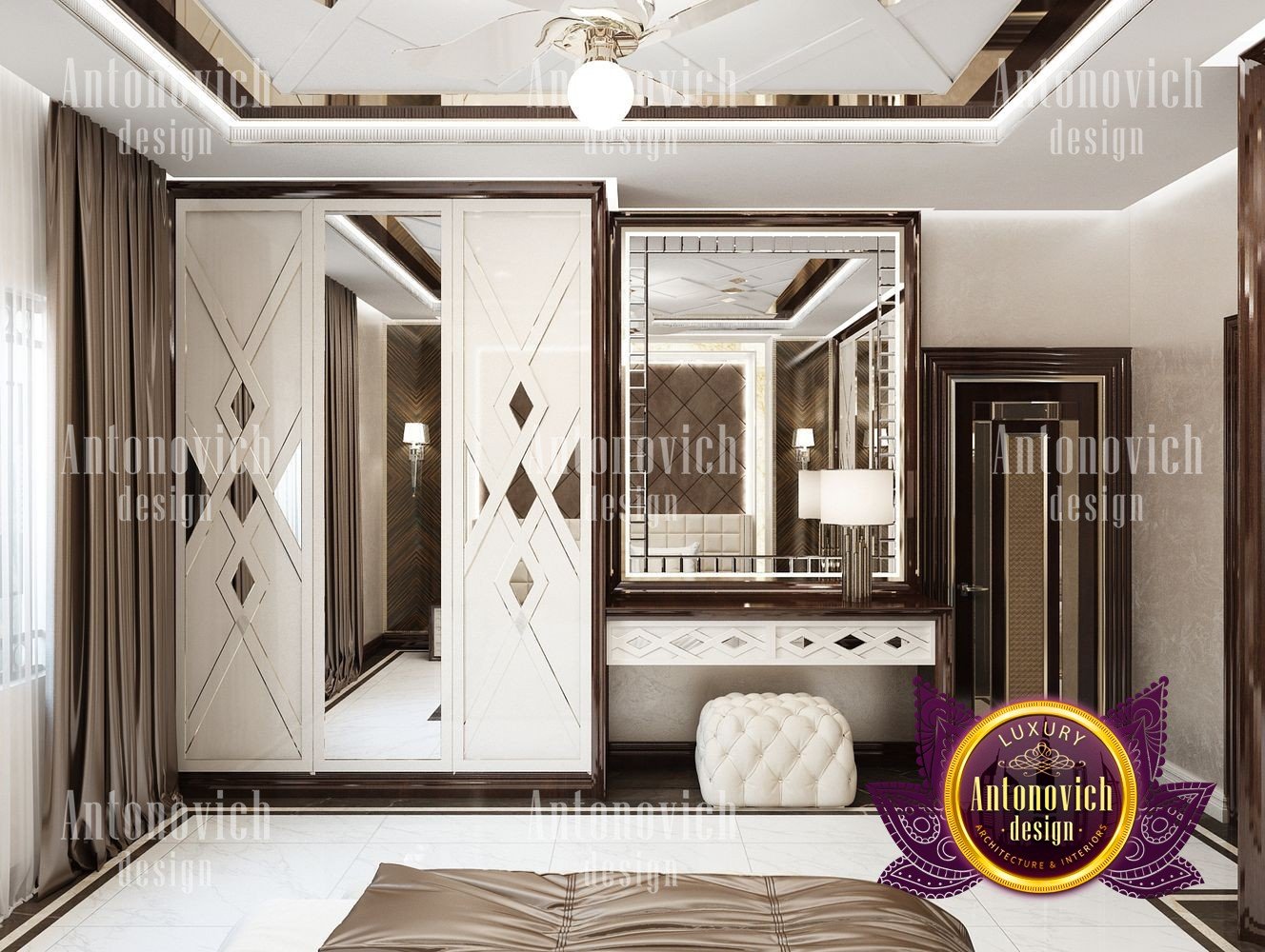 Если проводить аналогии между дизайном интерьера и музыкой, то интерьер этой спальни — настоящая симфония роскоши. Это дизайн пентхауса в классическом стиле. Интерьер столь многогранен и глубок, что о нём можно написать не одну страницу, но если остановиться на главном, становится ясно, как рождаются красивые интерьеры. Классический стиль ценят за возможность подчеркнуть респектабельность дома или квартиры и создать не просто интерьер, а нечто историческое и вечное, сопоставимое с произведением искусства. Студия Антонович Дизайн (Antonovich Design) в течение многих лет специализируется на создании элитных интерьеров в классическом стиле, и её дизайнеры достигли высокого мастерства и виртуозности в своём деле. Интерьер роскошной спальни дышит свежестью и оригинальностью идей. Светлая гамма оттенков наполняет пространство лёгкостью и романтикой. Дизайнеры буквально заполнили каждый квадратный сантиметр красивым декором, и каждая завитушка не случайна. Так, стена за изголовьем оформлена лепниной в виде семейного герба. Это — лепнина в интерьере спальни и семейный герб в интерьере. Здесь виден классический дизайн спальни. Элитный интерьер пентхауса проявляется в тщательной проработке деталей, и интерьер спальни пентхауса демонстрирует это наиболее наглядно. Современные технические решения, такие как новые способы подсветки, позволяют дополнить интерьер яркими акцентами и выделить нужные детали — подсветка акцентов в интерьере подчёркивает символику и фактуру. Символика семьи при мягком освещении привнесла в интерьер благородные аристократические ноты. Здесь также присутствует люстра из хрусталя в спальне, а деревянные панели и шелковые обои создают благородную фактуру и тепло атмосферы.