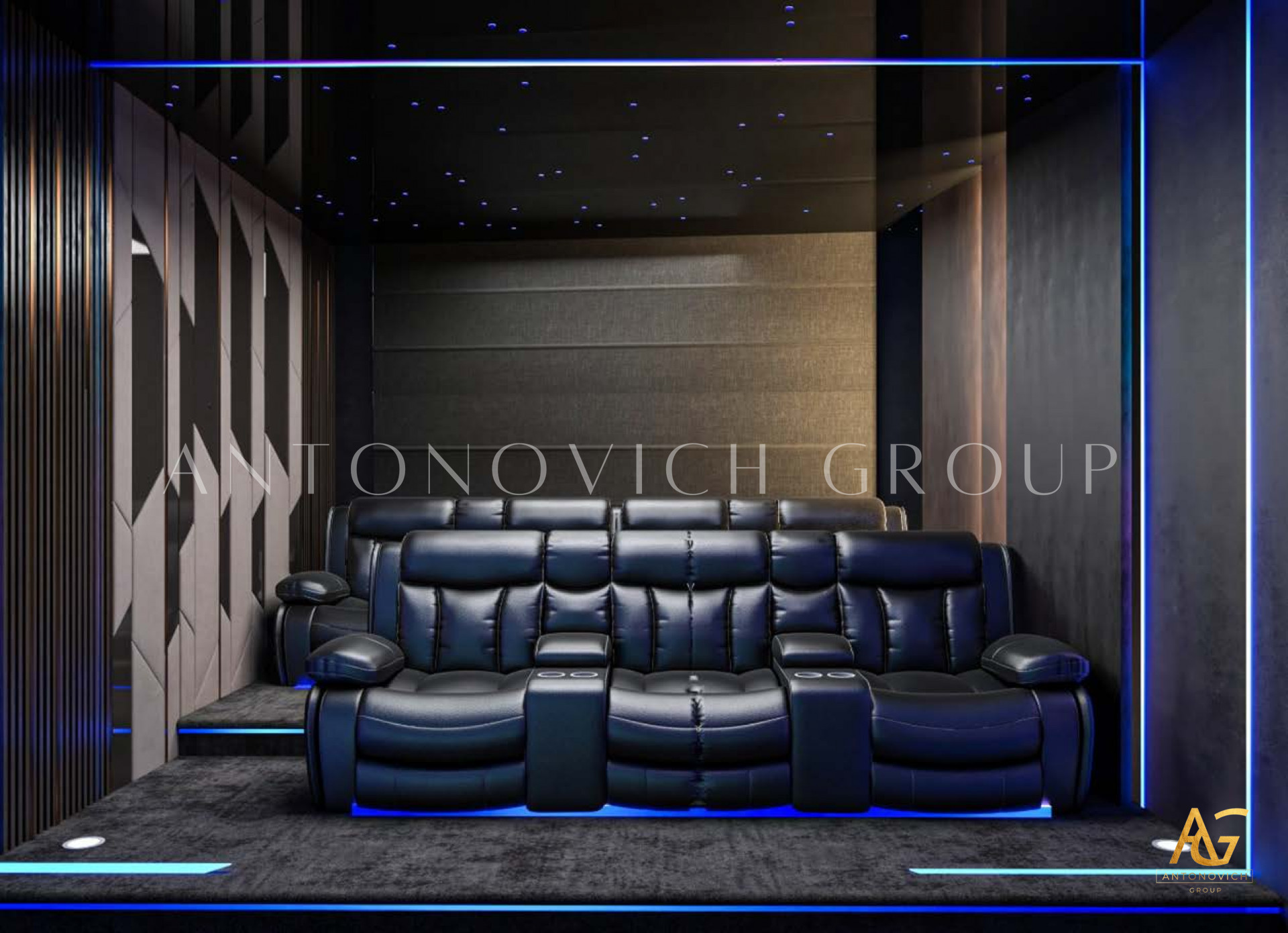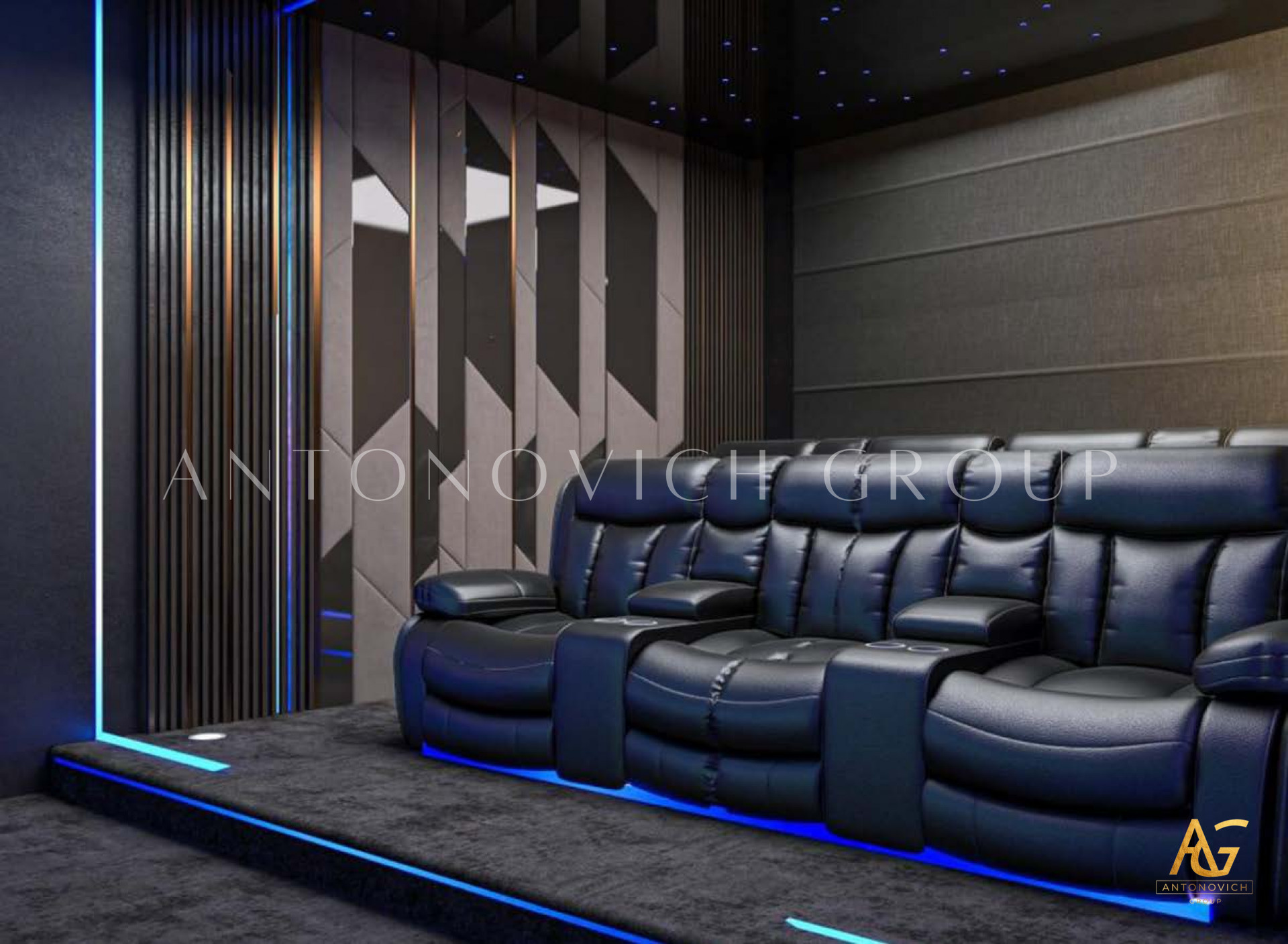 Дни универсального подхода к кинотеатру позади. Персонализированный дизайн домашнего кинотеатра от команды Антонович Дизайн позволяет вам управлять атмосферой по своему вкусу. Создайте атмосферу домашнего кинотеатра на заказ. Хотите воссоздать уют ретро-зала или стремитесь к минимализму космического корабля — возможен любой выбор. Кастомное освещение для домашнего кинотеатра, голографические дисплеи для домашнего кинотеатра и адаптивная акустика для домашнего кинотеатра гарантируют, что каждый элемент настроен под ваши предпочтения.