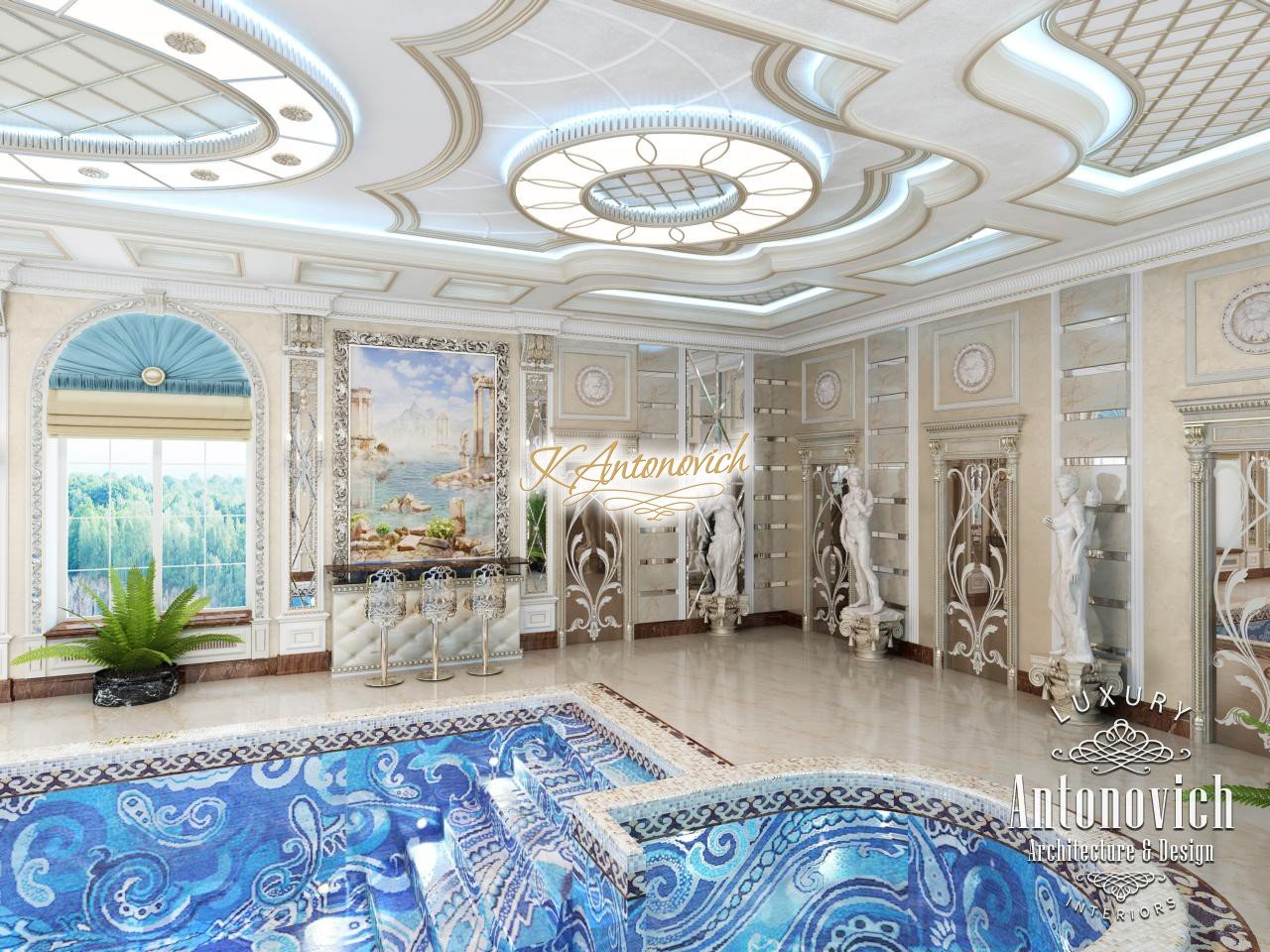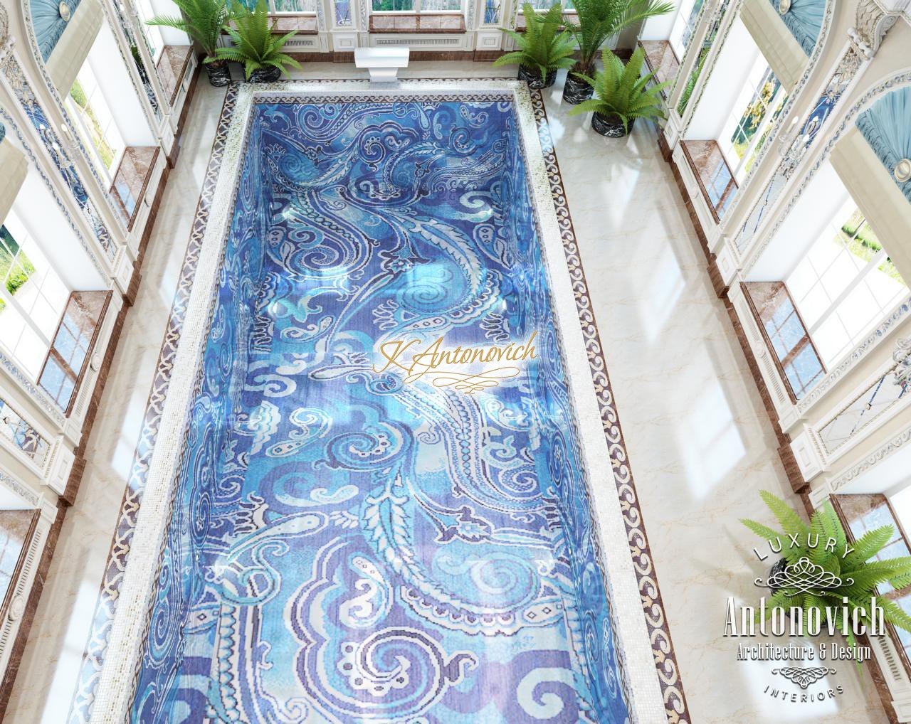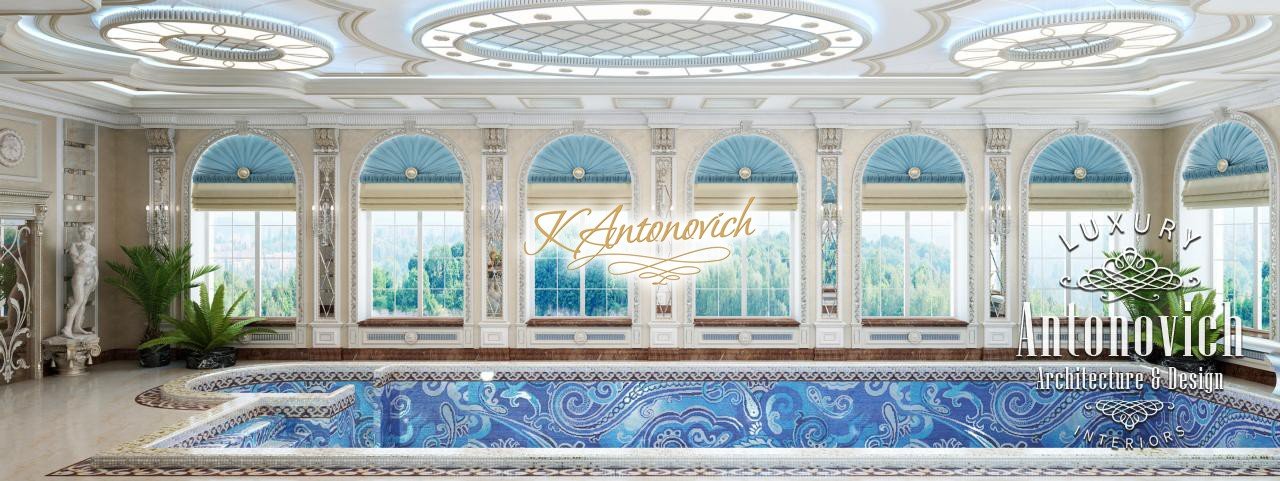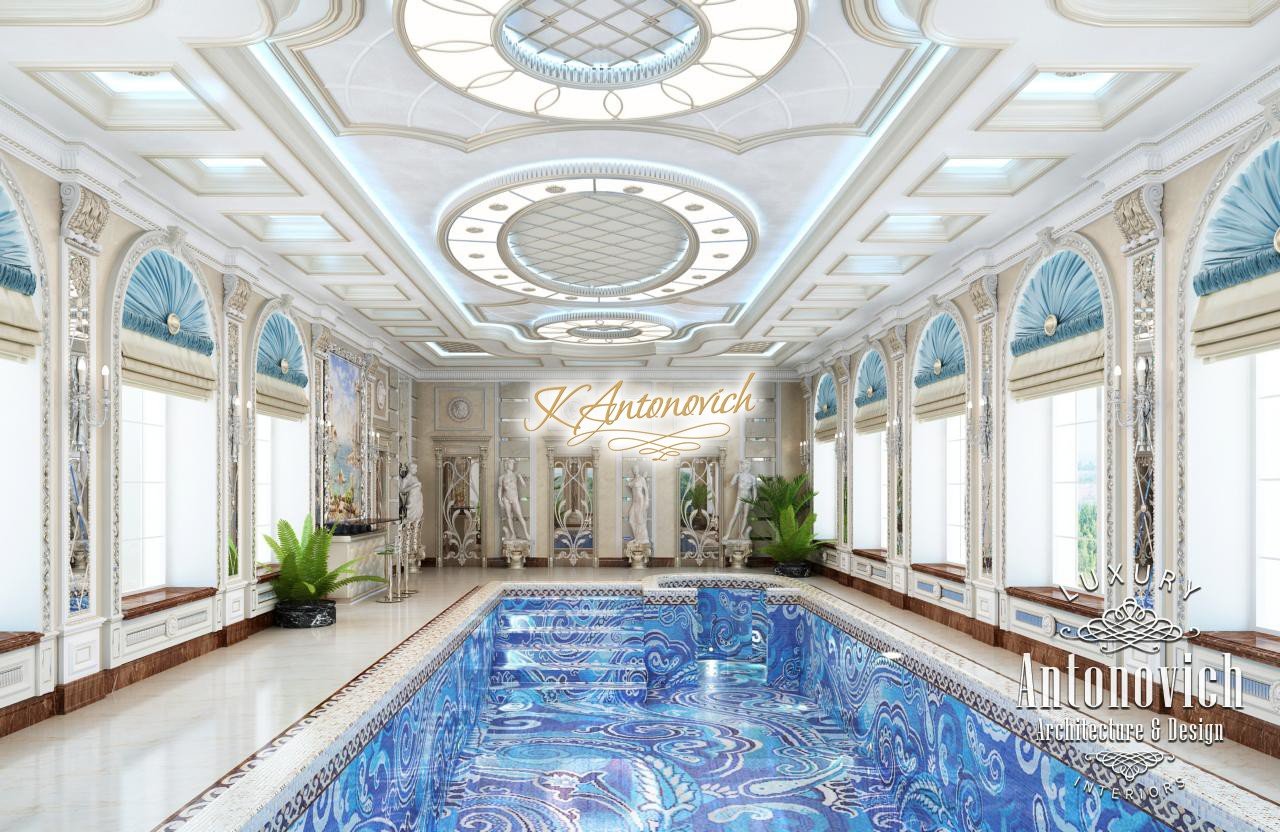 Грандиозный по масштабу проект дома в Абу-Даби включает дизайн большого бассейна. Дизайнеры создали интерьер роскошной квартиры, впечатляющий своим видом — это роскошный дизайн виллы Абу-Даби, подчёркивающий престиж дома. Главную роль в этой композиции играет большой роскошный бассейн — бассейн с авторской мозаикой, отделка бассейна мозаикой выполнена из изысканных узоров, что позволяет рассматривать бассейн как произведение дизайна. арочные окна у бассейна окружают зону отдыха практически со всех сторон. Использованы римские шторы для бассейна и навесы из синего шелка. такой интерьер бассейна в вилле подчёркивает утончённый вкус владельцев и их любовь к искусству: художественные скульптуры и картины выглядят особенно изысканно. этот проект роскошной виллы привлекает внимание своей гармонией и эстетикой.