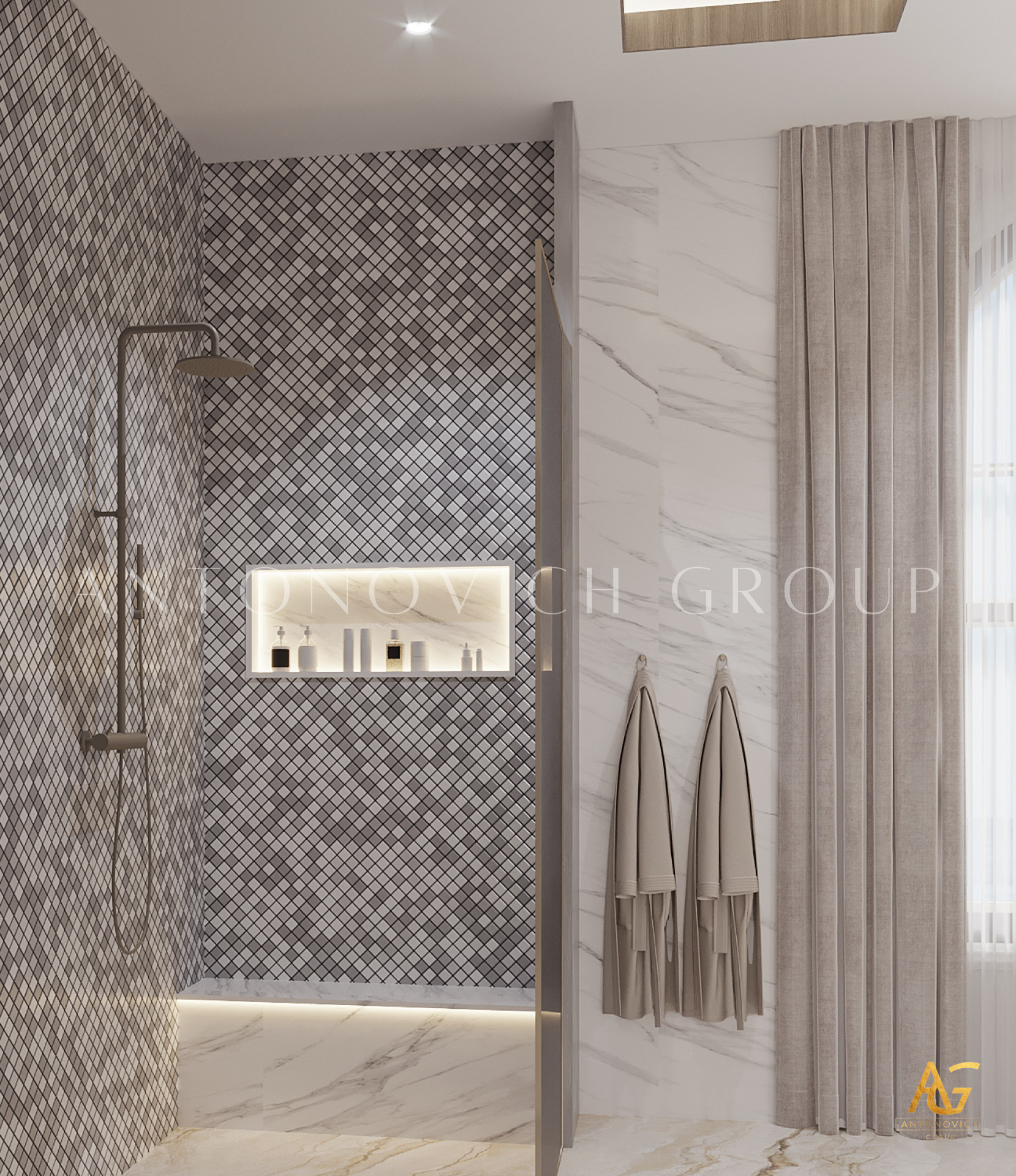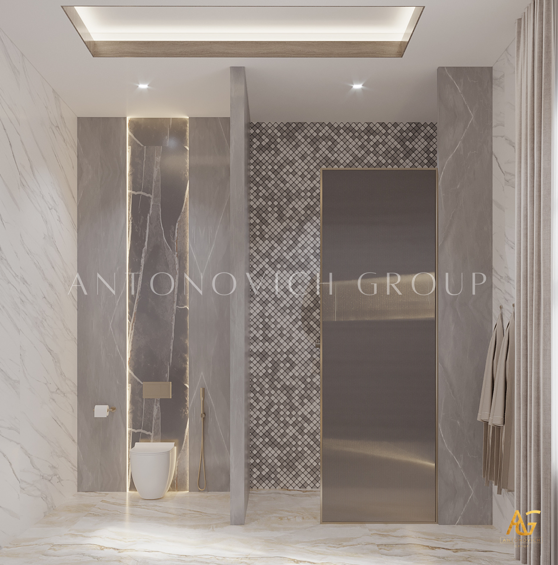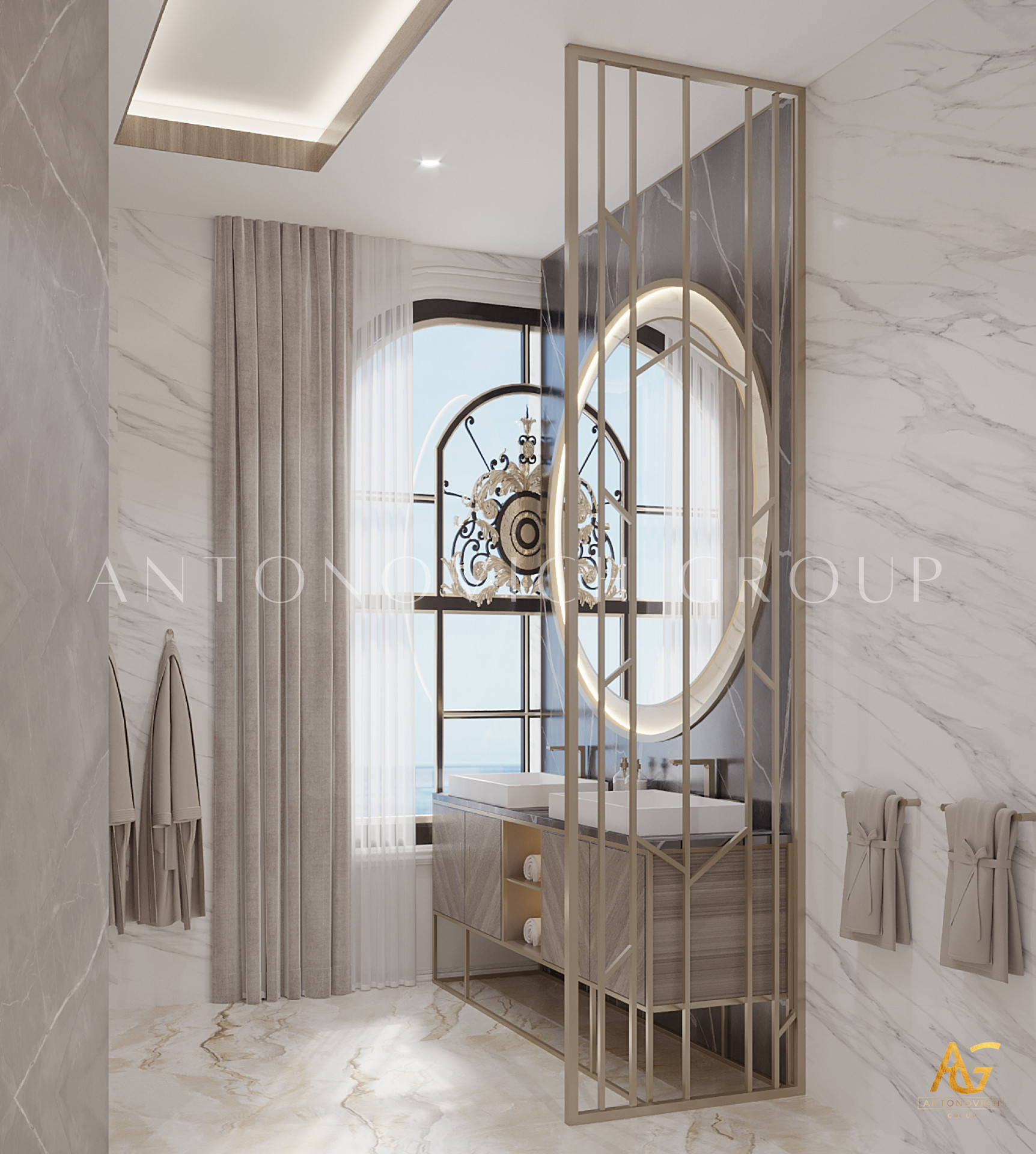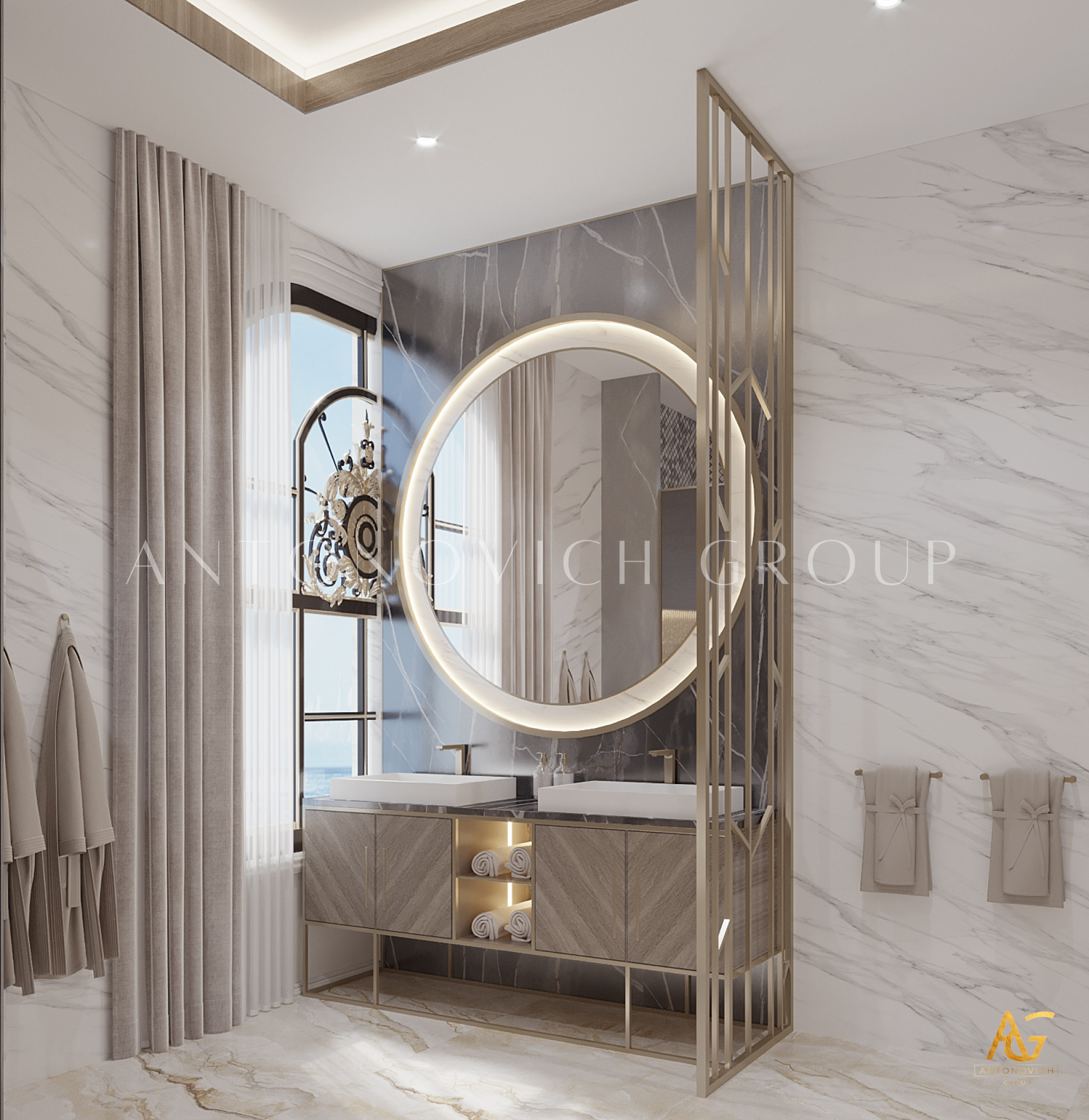 Дизайн виллы в Абу‑Даби включал проектирование и инженерные решения нескольких ванных комнат. Этот дизайн ванной комнаты для виллы сочетает яркий и роскошный характер отделки, поражающий своей пышной величественностью. Здесь представлен роскошный дизайн ванной комнаты, полный эффектных декоративных приёмов, предложенных дизайнерами интерьеров Абу‑Даби. Атмосфера премиум‑класса чувствуется в каждом квадратном метре. Потолок украшен изысканной авторской люстрой с хрустальными подвесками — ниша в потолке ванной комнаты подчёркнута дополнительным освещением. В оформлении использована люстра с хрустальными подвесками и тщательно продуманное потолочное освещение в ванной комнате. Кроме того, овальная ванна в интерьере выглядит великолепно благодаря двум изящным мраморным колоннам по бокам, увенчанным позолоченными капителями — ванная комната с колоннами и лепниной предстает особенно монументально. Также мраморная плитка для ванной комнаты на полу выложена очаровательным орнаментом, который повторяет контуры рисунка в душе, подчёркивая интерьер ванной с мрамором.