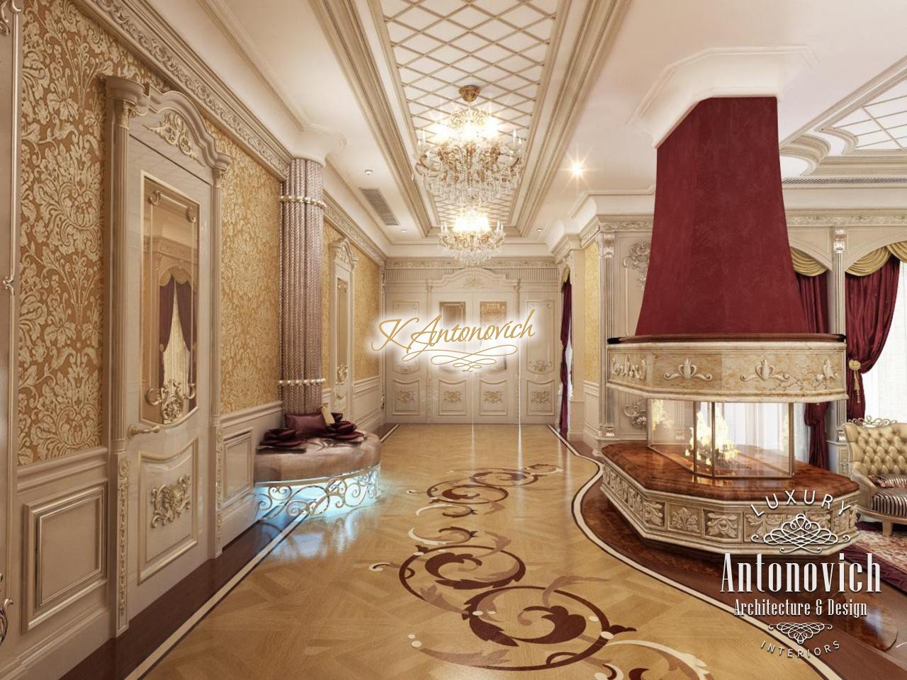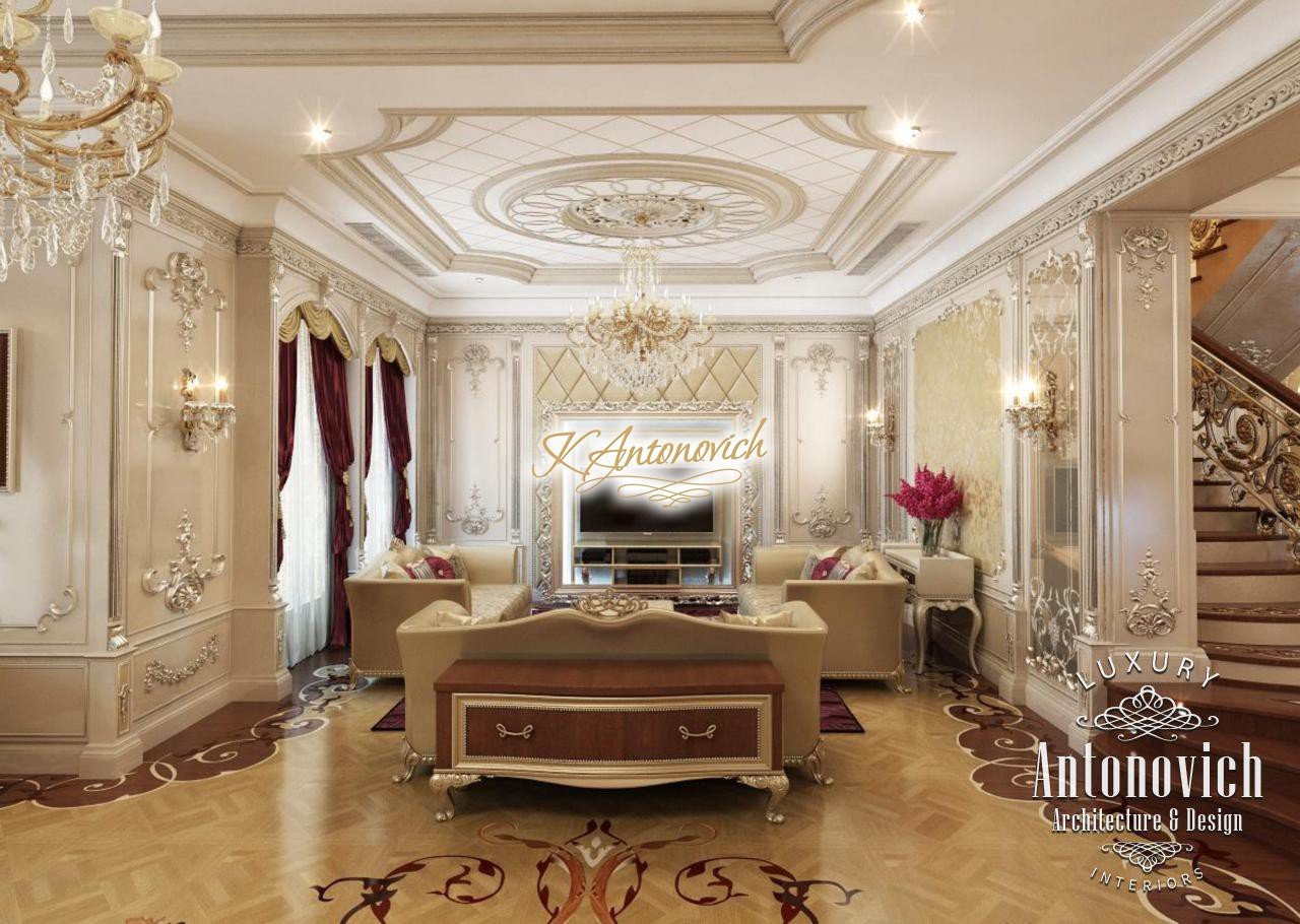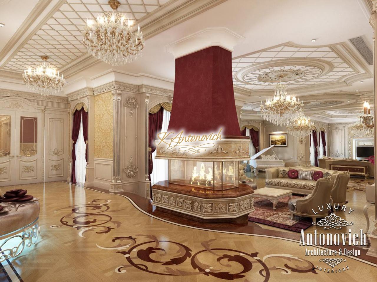 Дизайн гостиной в неоклассическом стиле впечатляет роскошью и необычайным характером. Это роскошный дизайн гостиной, который подчёркивает статус владельцев. Это впечатление сохраняется с первых мгновений пребывания в доме. Дизайн интерьера в Дубае от Антонович Дизайн (Antonovich Design) предлагает своим клиентам авторские проекты. Авторский проект гостиной неизменно отличается уникальными дизайнерскими решениями. Такой дизайн гостиной прекрасно отражает утончённый вкус владельцев, их респектабельность и гостеприимство. Очень комфортный интерьер с элегантными акцентами создаёт праздничное настроение. В частности, представлен дизайн гостиной в Дубае. Дизайнеры интерьера в Дубае мастерски работали с пространством на первом этаже дома — это проект дизайн гостиной на первом этаже. Гостиная разделена на две зоны и объединена с просторным холлом, поэтому применено зонирование гостиной и холла. Дизайнеры решили разграничить пространство эффектной стеной с изящными линиями и LED-подсветкой. Главной изюминкой проекта стал резный паркет в гостиной из ценных пород дерева с изысканным рисунком. Орнамент на полу гармонично переплетён с узорами резной лепнины на потолке в гостиной. Интерьер демонстрирует, насколько великолепной может быть гармония благодаря возможностям новых технологий. Дизайн гостиной с камином передаёт тёплое ощущение очага, которое приносит радость владельцам. Оригинальный камин виден почти из любой точки комнаты.