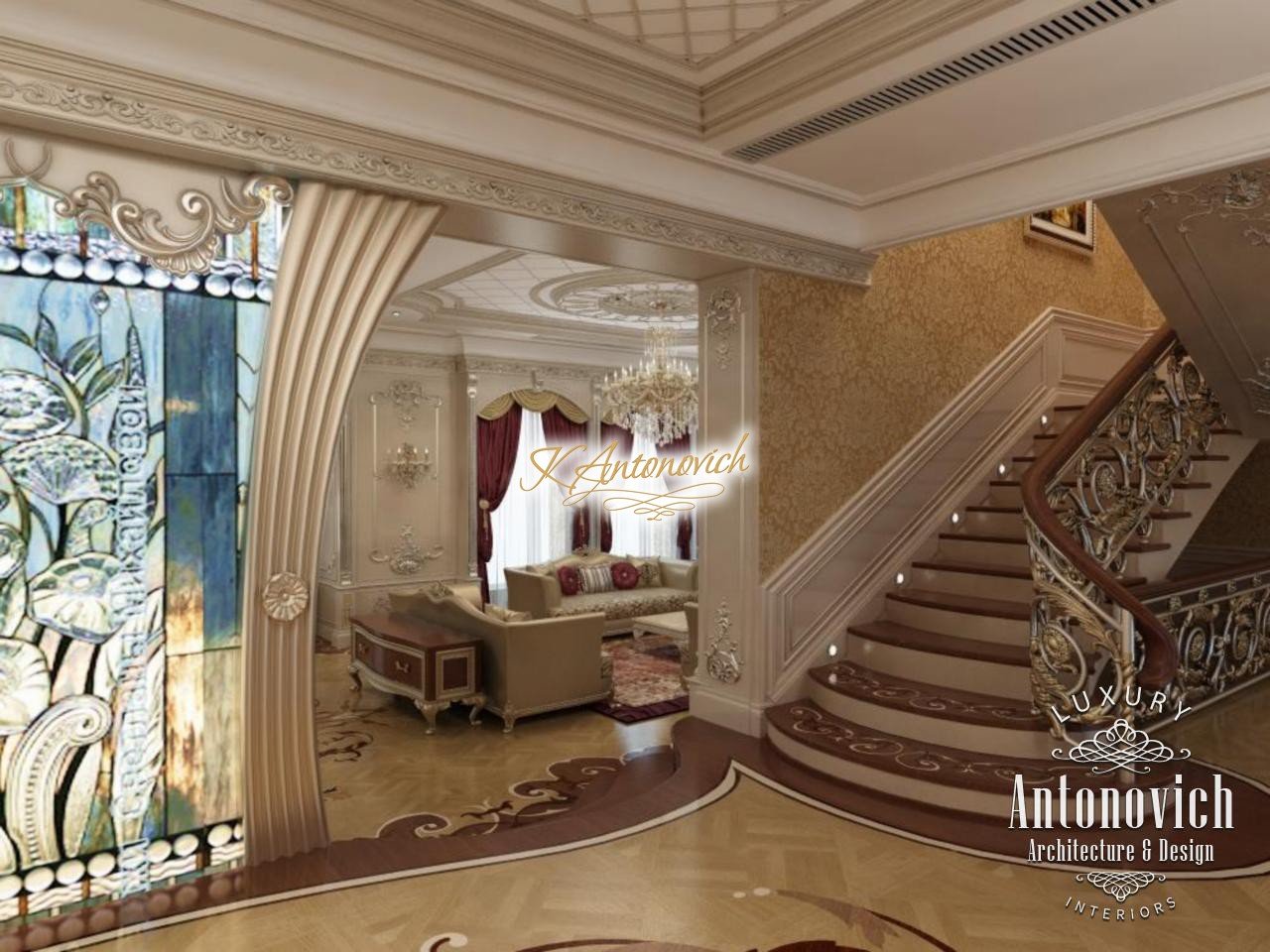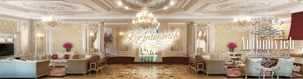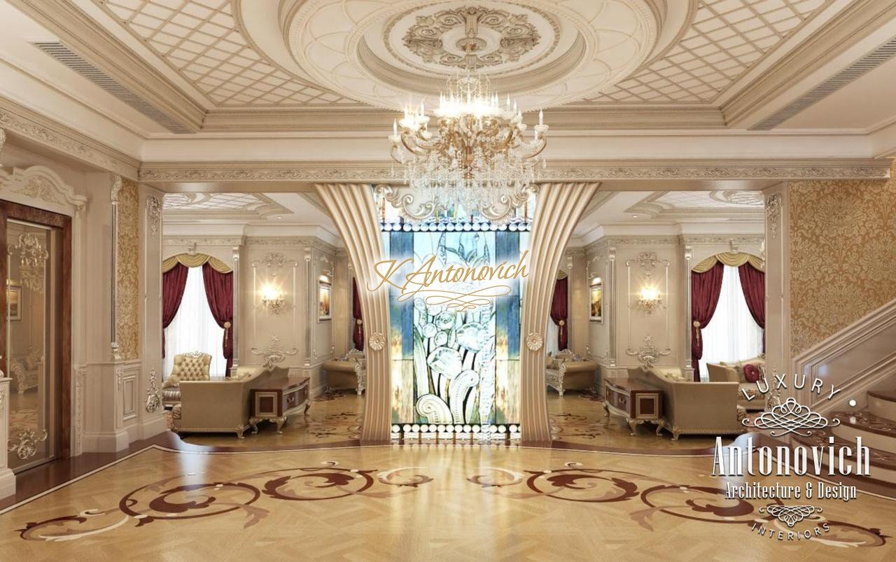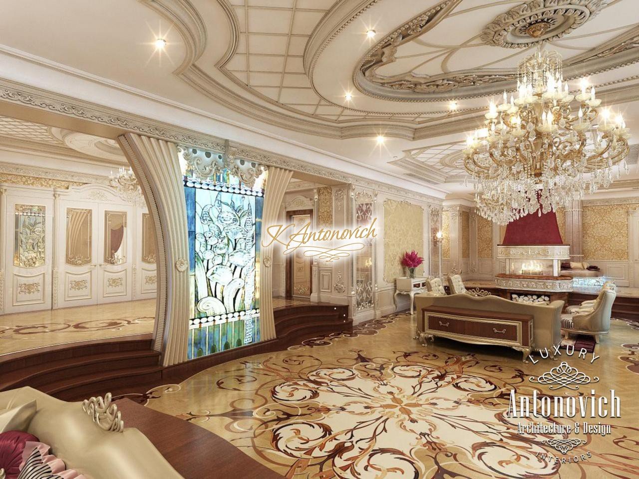 Дизайн гостиной в неоклассическом стиле впечатляет роскошью и необычайным характером. Это роскошный дизайн гостиной, который подчёркивает статус владельцев. Это впечатление сохраняется с первых мгновений пребывания в доме. Дизайн интерьера в Дубае от Антонович Дизайн (Antonovich Design) предлагает своим клиентам авторские проекты. Авторский проект гостиной неизменно отличается уникальными дизайнерскими решениями. Такой дизайн гостиной прекрасно отражает утончённый вкус владельцев, их респектабельность и гостеприимство. Очень комфортный интерьер с элегантными акцентами создаёт праздничное настроение. В частности, представлен дизайн гостиной в Дубае. Дизайнеры интерьера в Дубае мастерски работали с пространством на первом этаже дома — это проект дизайн гостиной на первом этаже. Гостиная разделена на две зоны и объединена с просторным холлом, поэтому применено зонирование гостиной и холла. Дизайнеры решили разграничить пространство эффектной стеной с изящными линиями и LED-подсветкой. Главной изюминкой проекта стал резный паркет в гостиной из ценных пород дерева с изысканным рисунком. Орнамент на полу гармонично переплетён с узорами резной лепнины на потолке в гостиной. Интерьер демонстрирует, насколько великолепной может быть гармония благодаря возможностям новых технологий. Дизайн гостиной с камином передаёт тёплое ощущение очага, которое приносит радость владельцам. Оригинальный камин виден почти из любой точки комнаты.