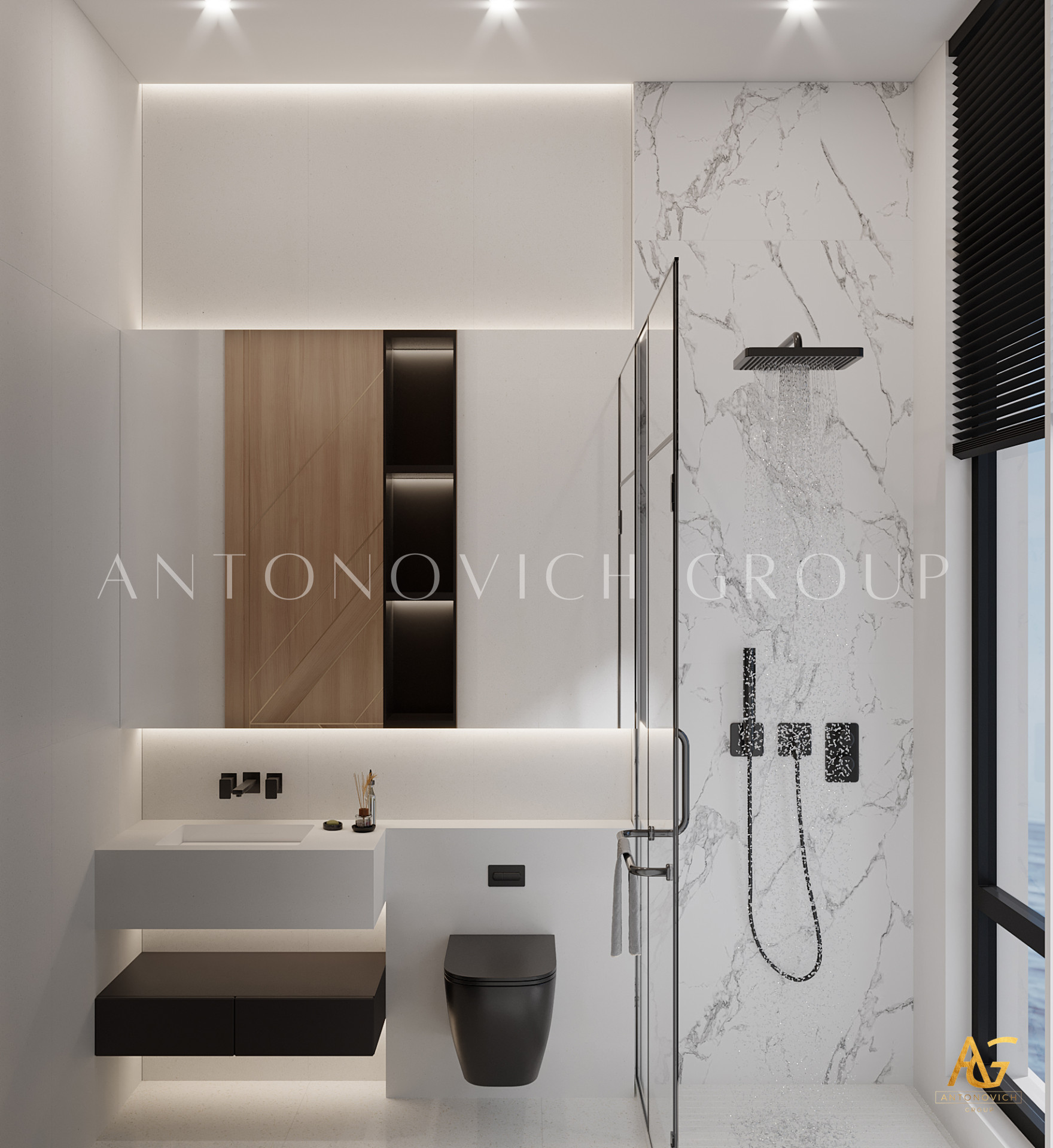 Желание и возможность позволить себе лучшее полностью отражены в этом проекте: шикарный интерьер ванной комнаты. House Design Dubai стал тем моментом, который воплотил радость владельцев от их идеального дома. Интерьер ванной комнаты — трогательная история с романтическим характером, где роскошный дизайн ванной комнаты сочетается с функциональностью. Просторная квартира устроена так, что вы всегда будете чувствовать себя здесь абсолютно комфортно, это демонстрация дизайн ванной комнаты для просторной квартиры. Роскошный дизайн интерьера от Антонович Дизайн (Antonovich Design) предлагает эксклюзивные решения для ванной комнаты и идеи дизайна ванной комнаты Дубай. Величие интерьера подчёркнуто благородным мрамором: ванная комната с мрамором, позолотой и окна с шелковыми шторами. Здесь использованы мраморные колонны в ванной комнате. Ванна установлена на низком подиуме — ванная на подиуме — и дополнена изящными мраморными колоннами с декоративными капителями. Плавные контуры стен, узоры в виде завитков и блестящее зеркало в ванной поражают своей гармонией. Это элитный дизайн ванной комнаты, демонстрирующий эксклюзивные решения для ванной комнаты.