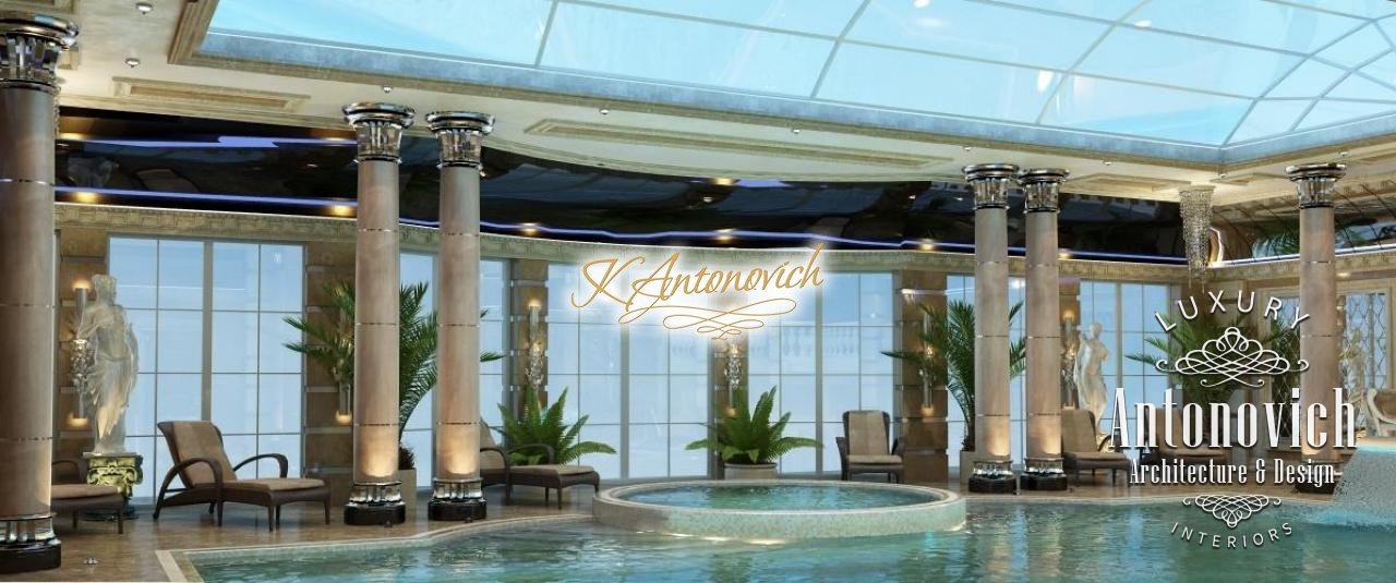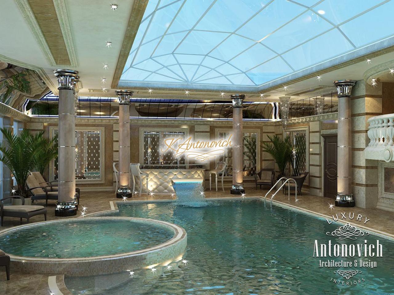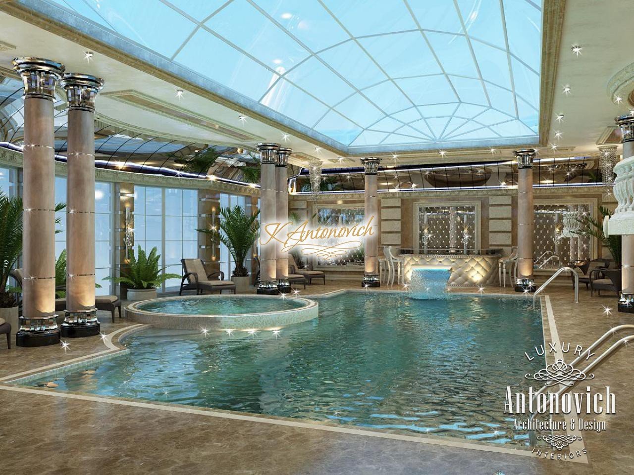 Данный авторский дизайн бассейна создан для одного из пятизвёздочных отелей в Дубае. Это роскошный дизайн бассейна с оттенком респектабельности для тех, кто ценит комфортный отдых в окружении великолепия. Проект разработан авторами проекта: интерьер бассейна пятизвёздочного отеля выглядит очень лёгким и воздушным благодаря куполу из прозрачного стекла — стеклянный купол над бассейном. Чтобы уравновесить пространство, дизайнеры окружили чашу мраморными колоннами: видны мраморные колонны у бассейна со серебряными капителями. Зеркальные панели в интерьере бассейна визуально увеличивают пространство роскошного бассейна. Здесь используется равномерное потолочное освещение бассейна, обеспеченное разнообразием потолочных светильников по периметру. Каждый гость почувствует себя уютно: комфортный интерьер бассейна для отдыха создан с учётом света и пропорций. Это особенно заметно в Дубае — дизайн бассейна в Дубае подчёркивает их высокий статус и респектабельность.